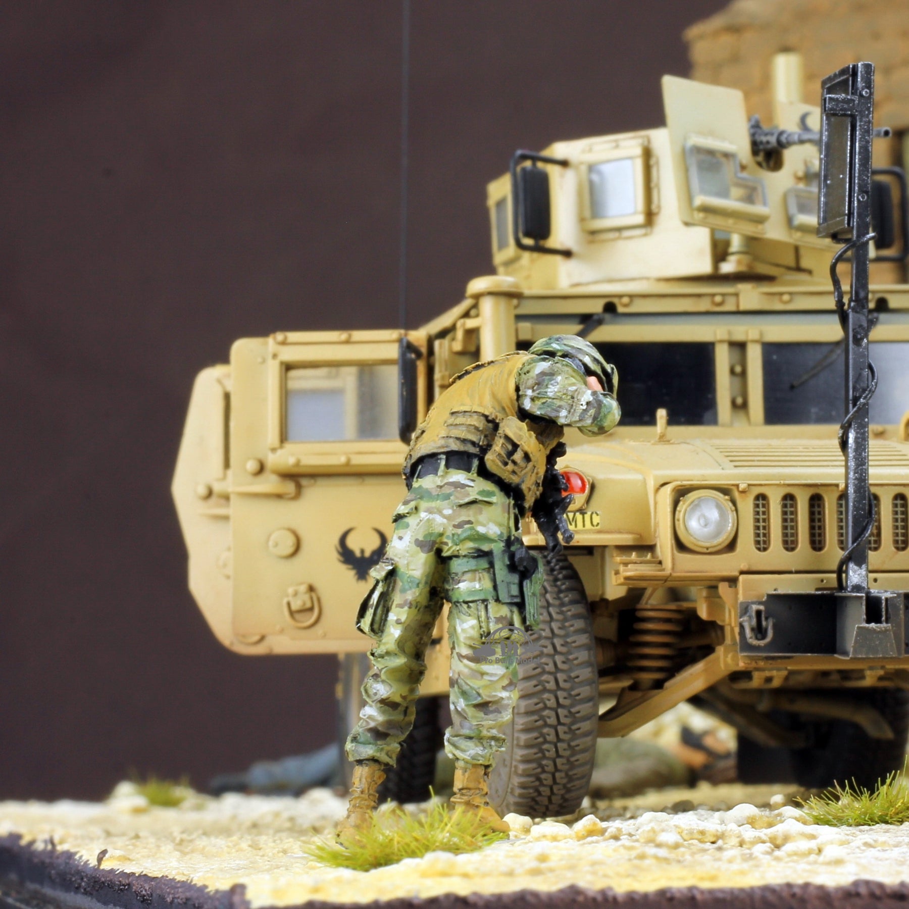 Paintwork: Multicam camouflage, desert-weathered gear, realistic rifles & equipment