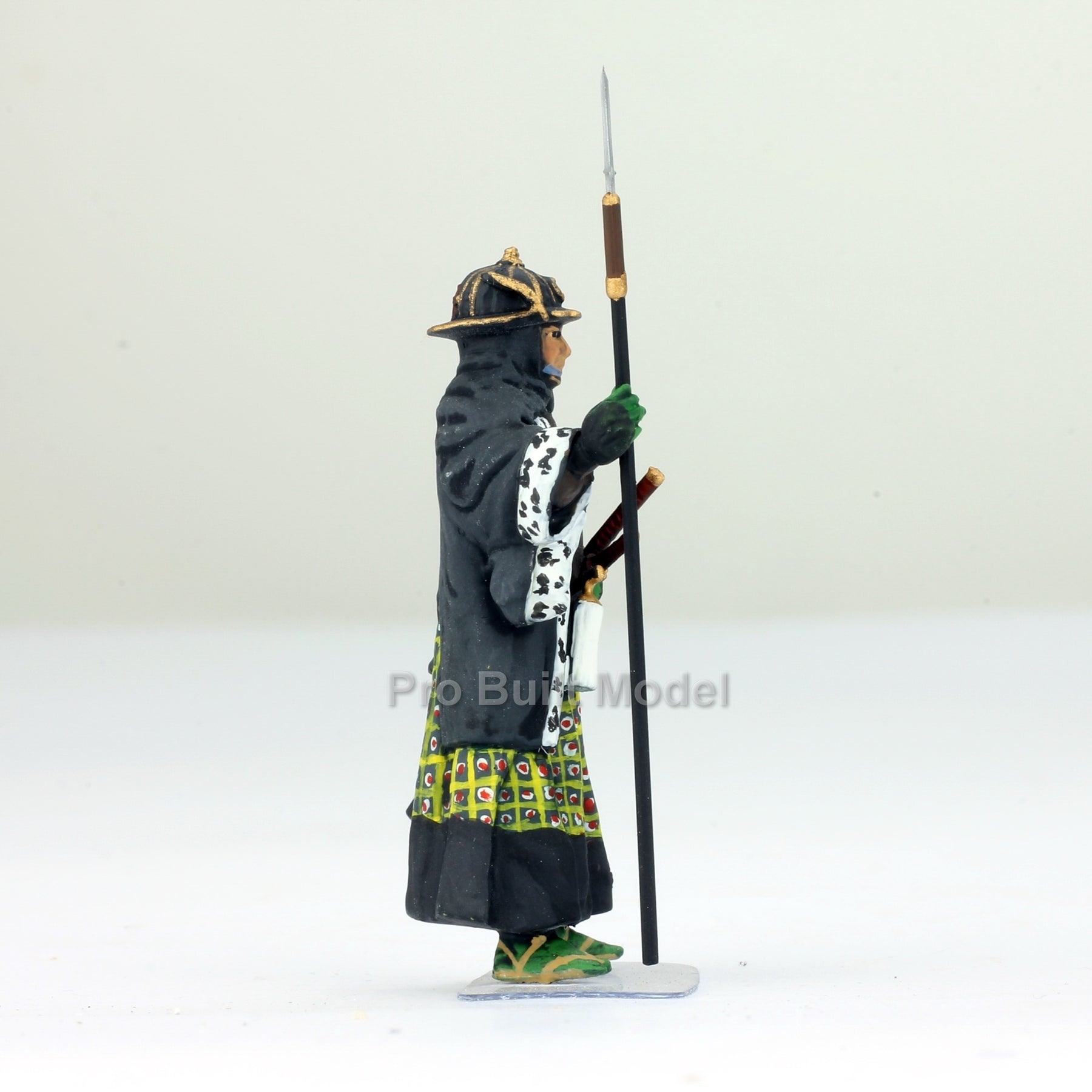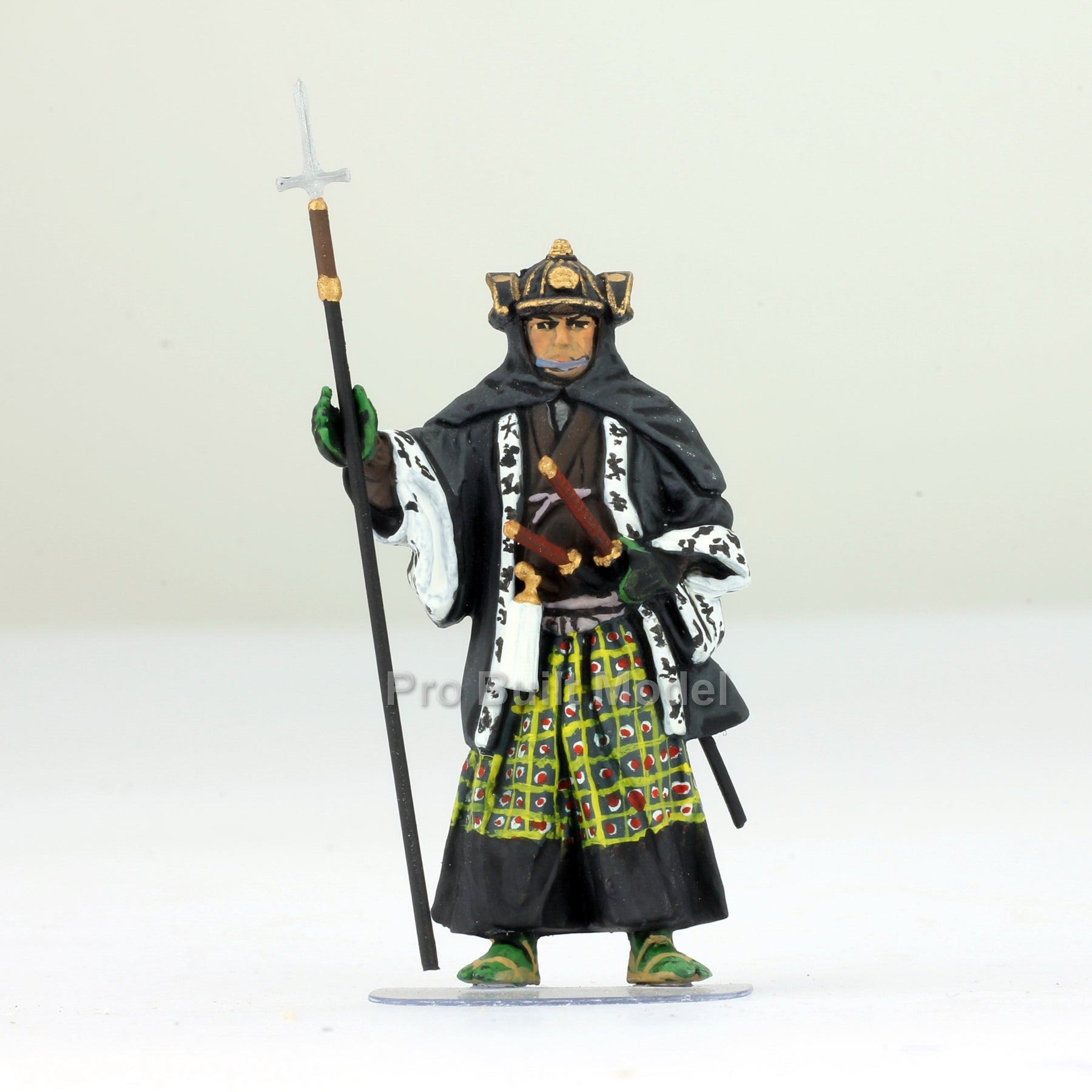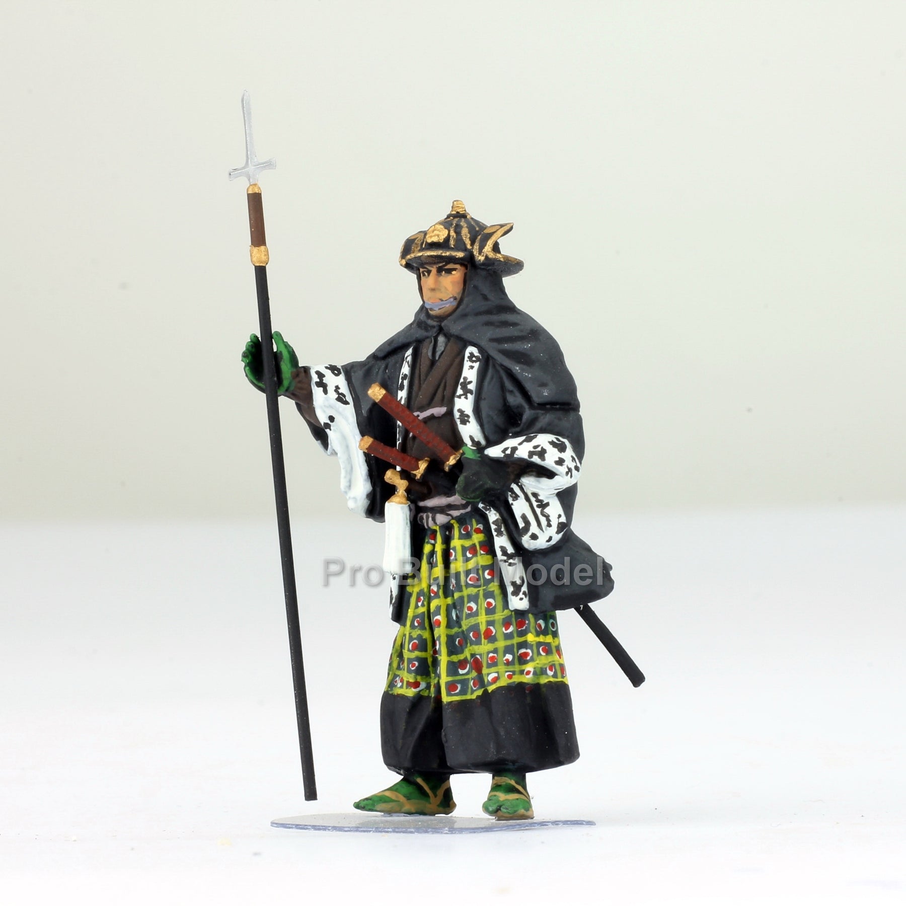 • Pose: Standing with yari spear and twin katana, wearing ceremonial robe