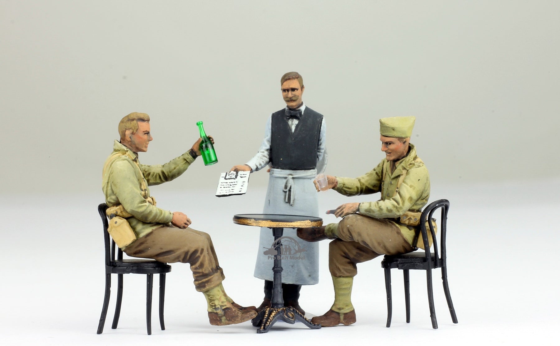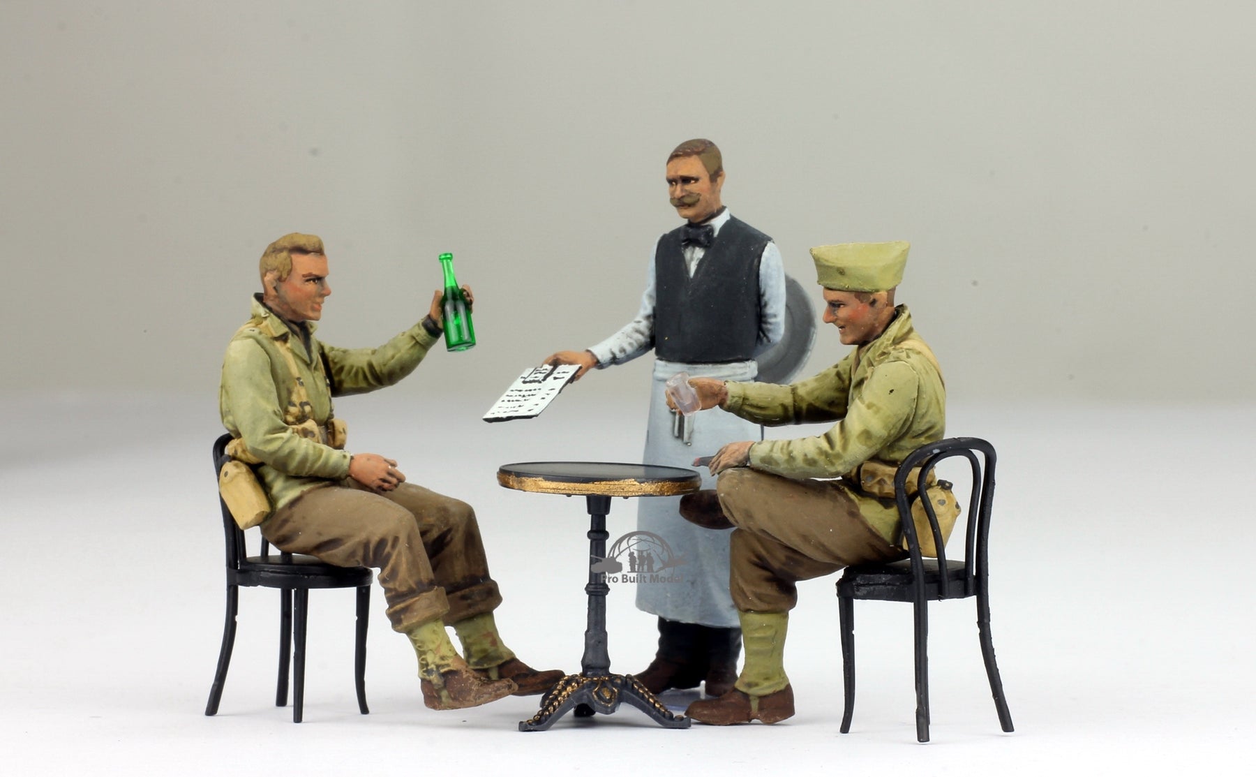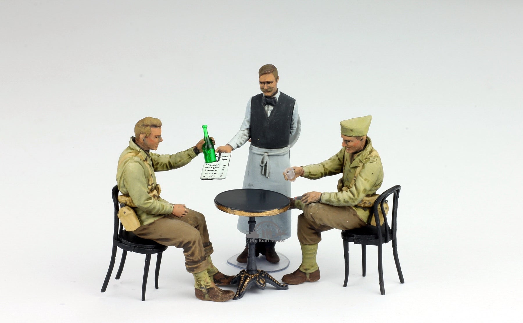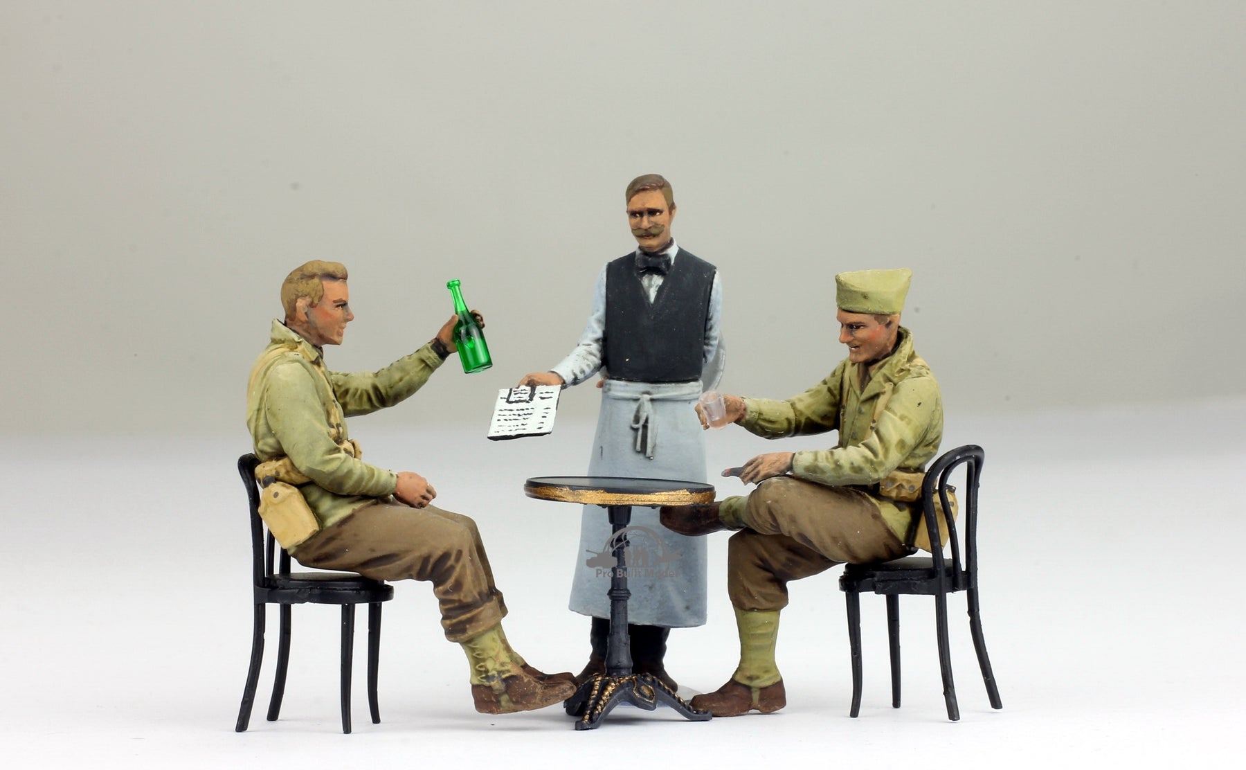 Set Includes: 2 US soldiers seated with drinks, 1 European waiter holding a menu, 2 chairs, and 1 café table.