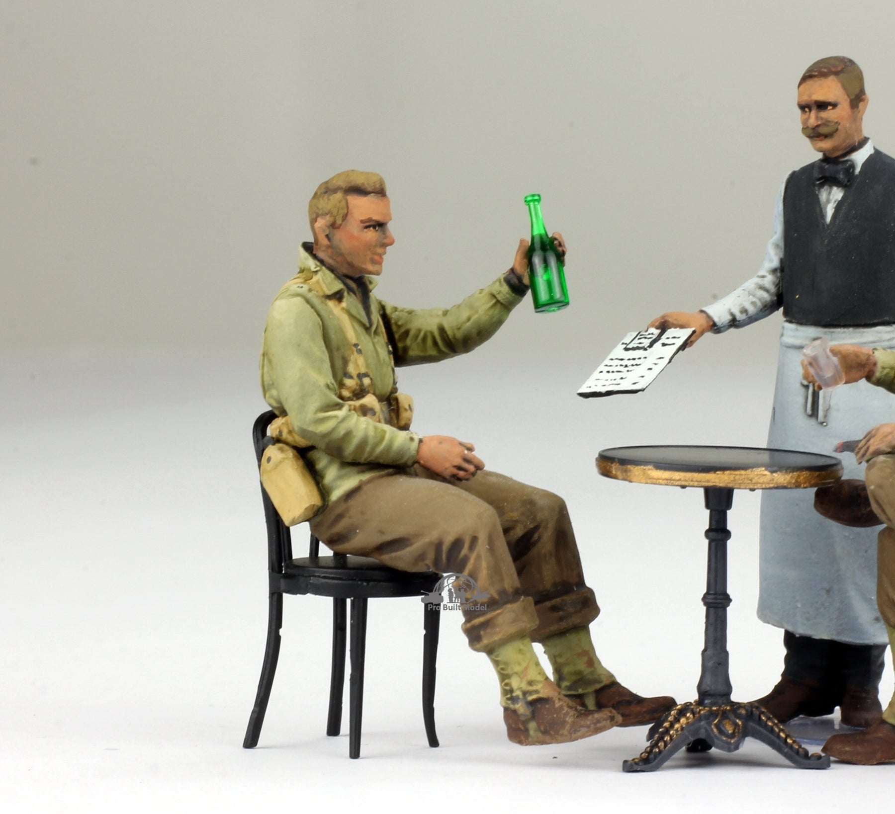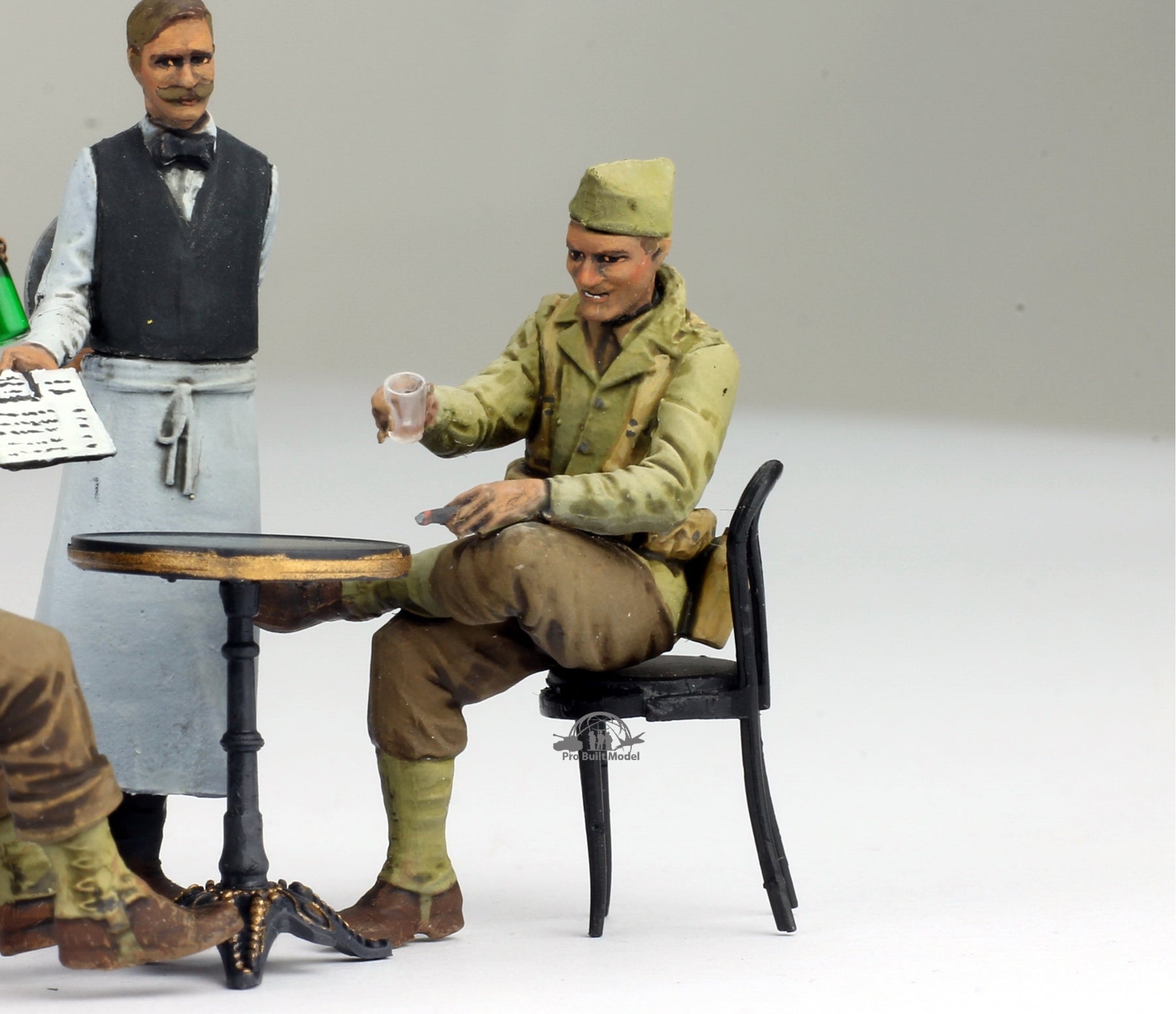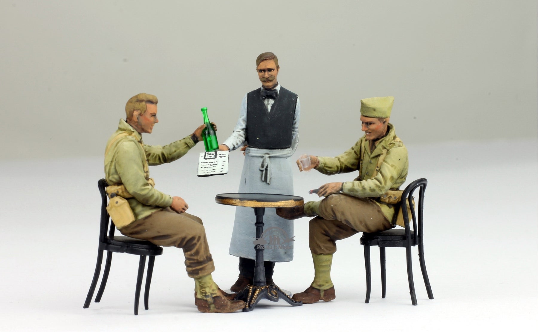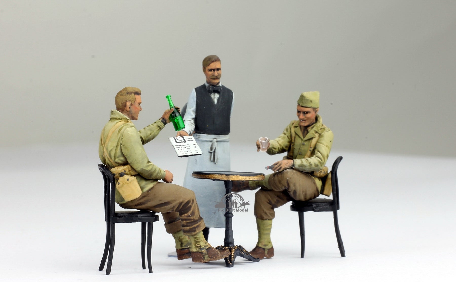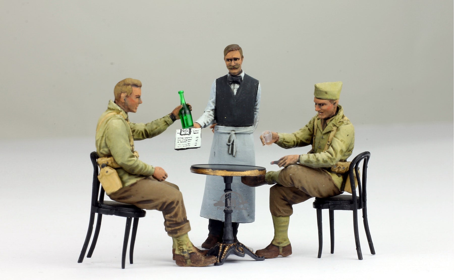 Set Includes: 2 US soldiers seated with drinks, 1 European waiter holding a menu, 2 chairs, and 1 café table.