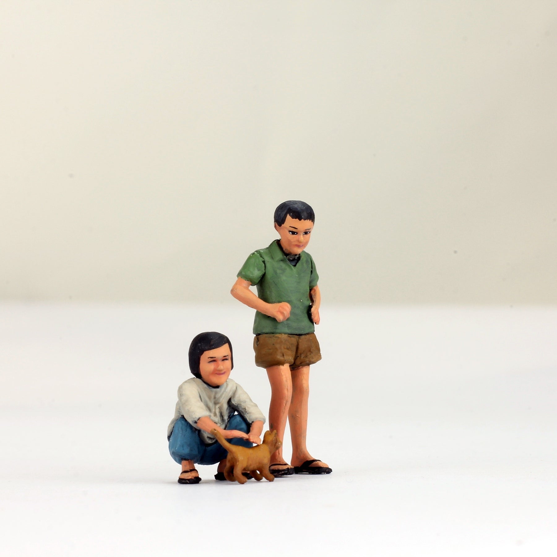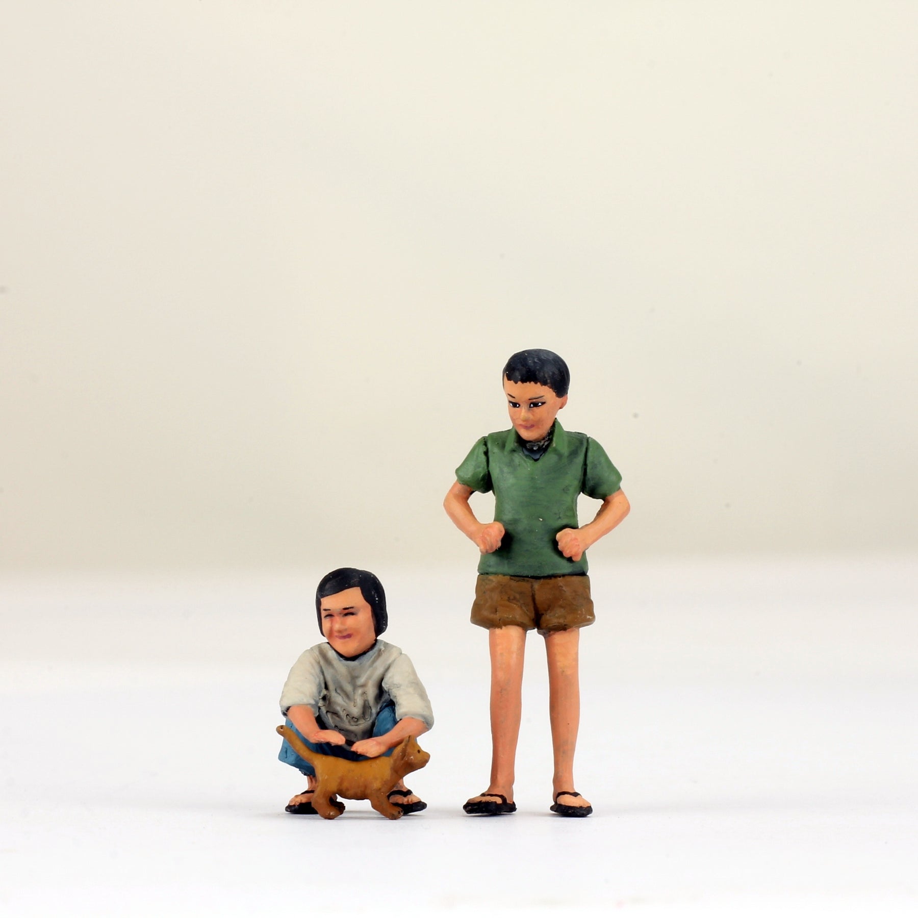 Bring everyday Vietnam to your scene. This finished 1/35 figure set shows two Vietnamese children—one standing in shorts and sandals, the other crouching to play with a small pet—captured with natural poses and cheerful expressions. Subtle skin tones, fabric shading and matte finishes make the figures blend seamlessly into village lanes, Saigon side streets or schoolyard dioramas of the Vietnam era.