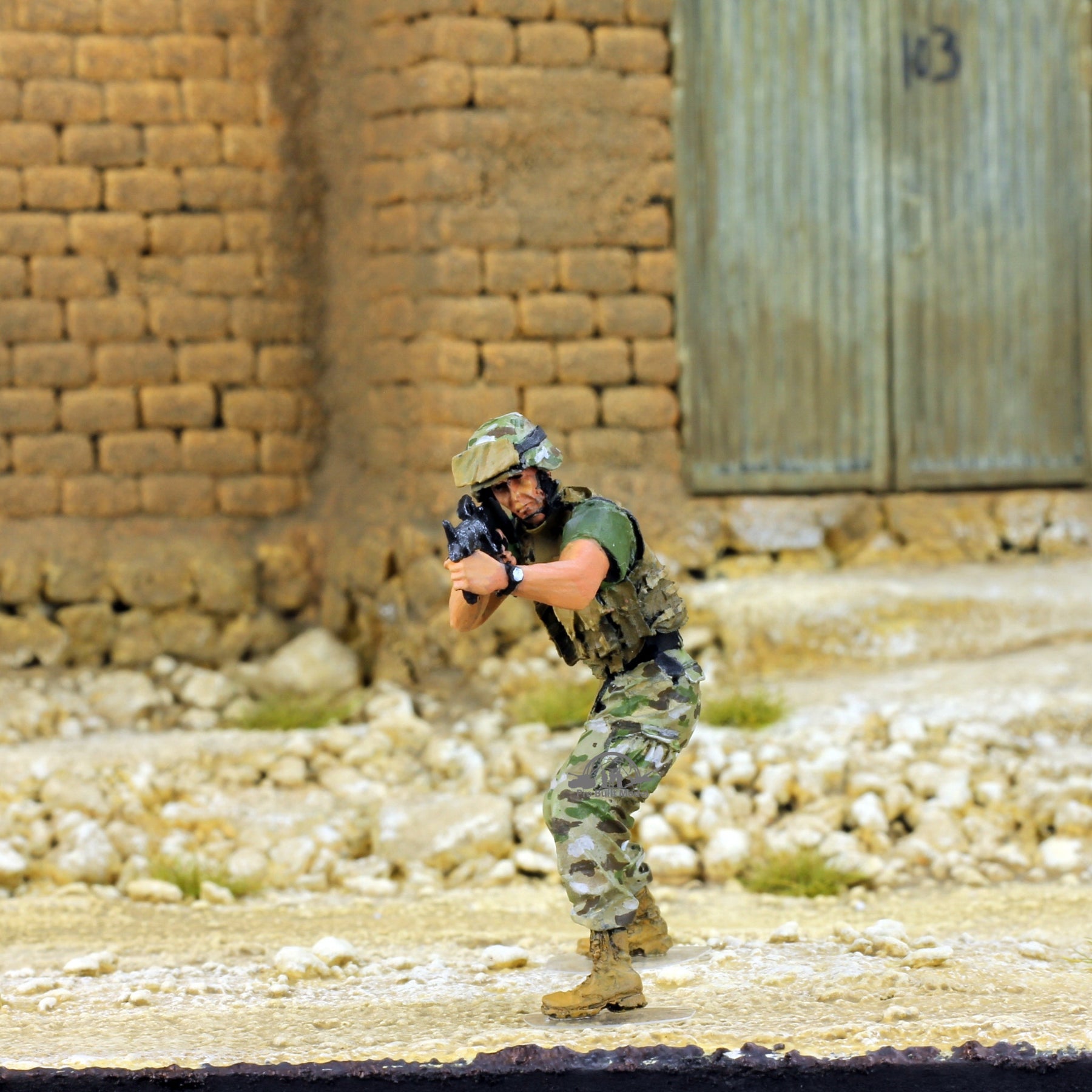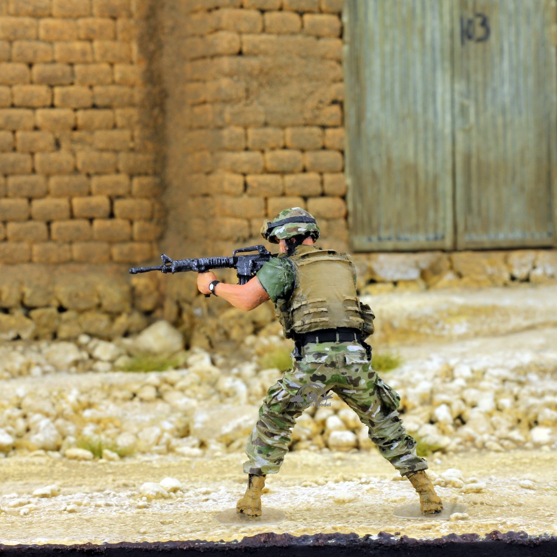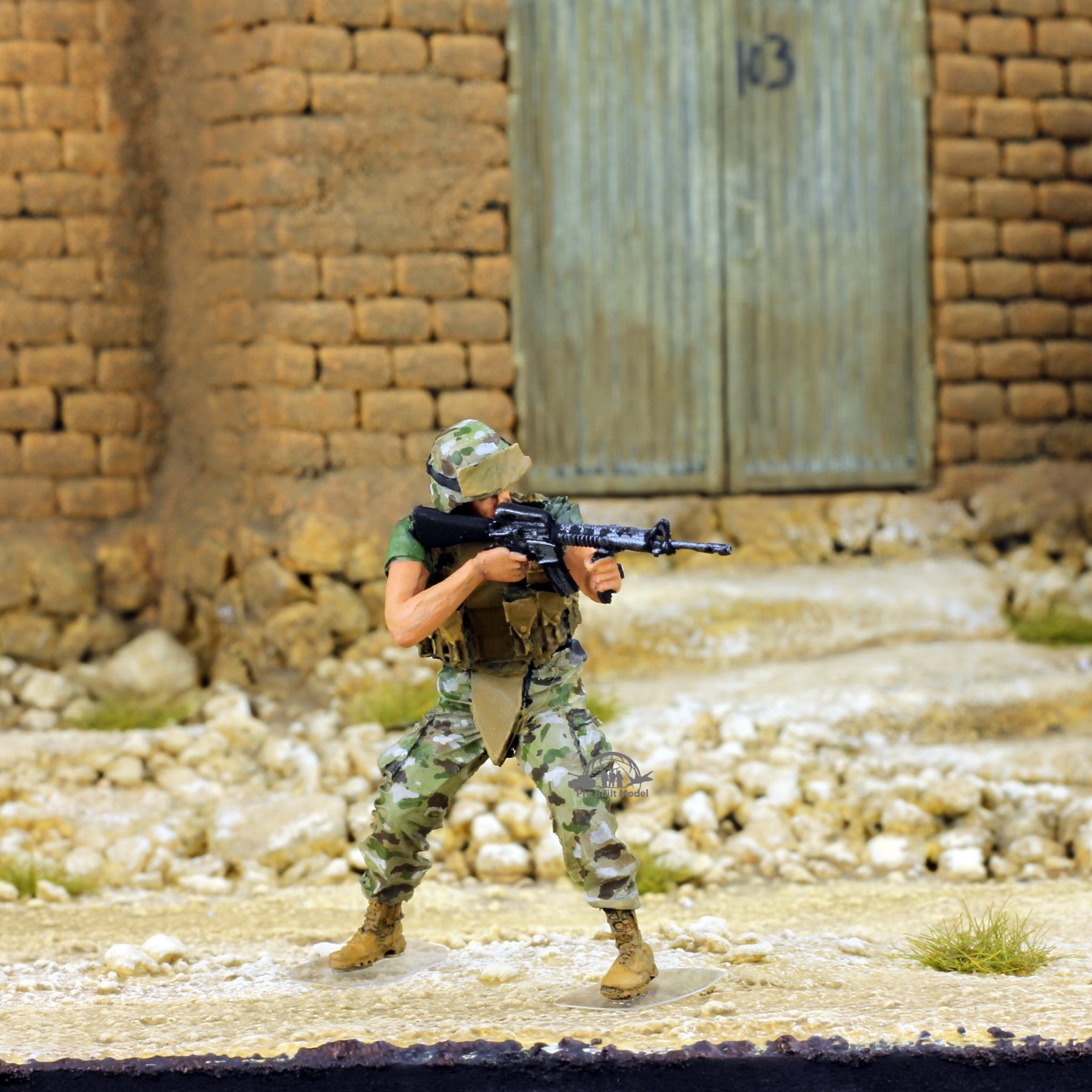 This handcrafted set includes two U.S. Marine figures in Multicam camouflage, posed in realistic battle action inspired by Middle East conflicts. Each miniature is hand-painted with desert-weathered uniforms, tactical gear, and lifelike weapon detailing for maximum realism.