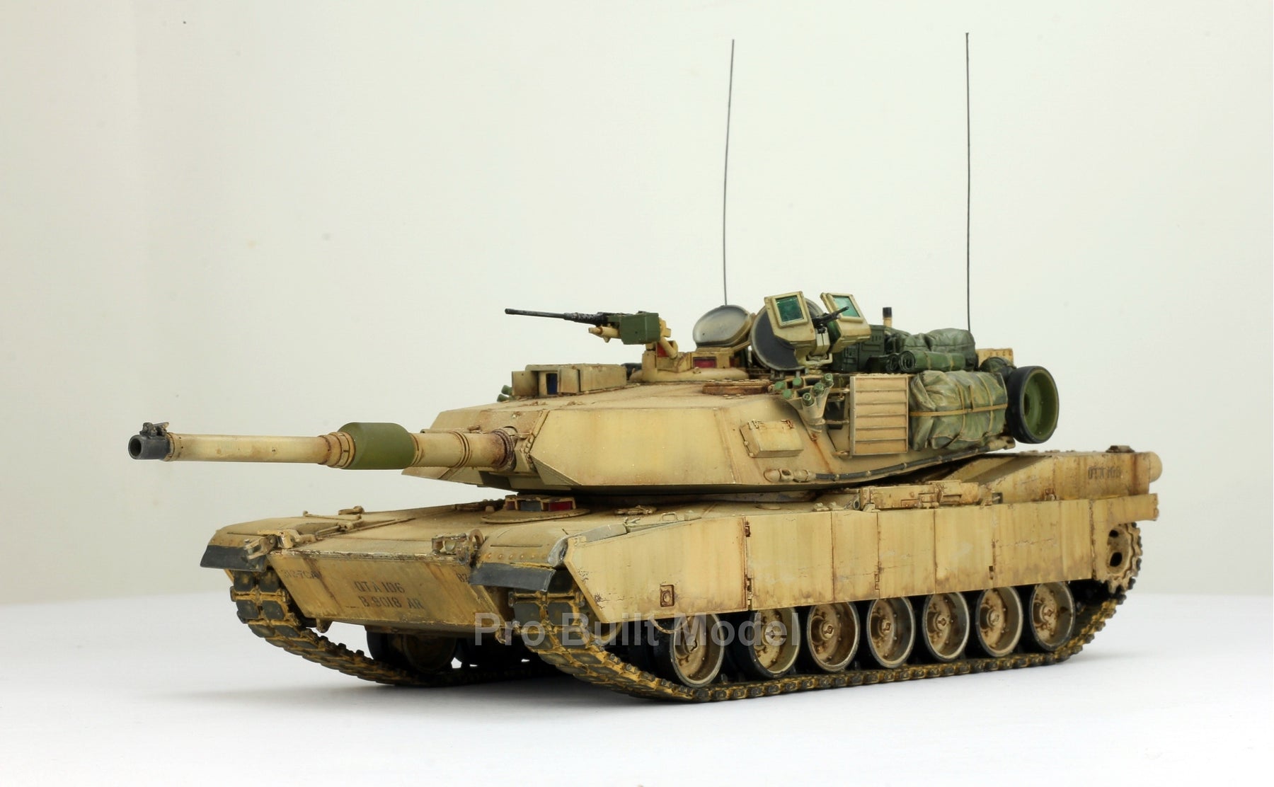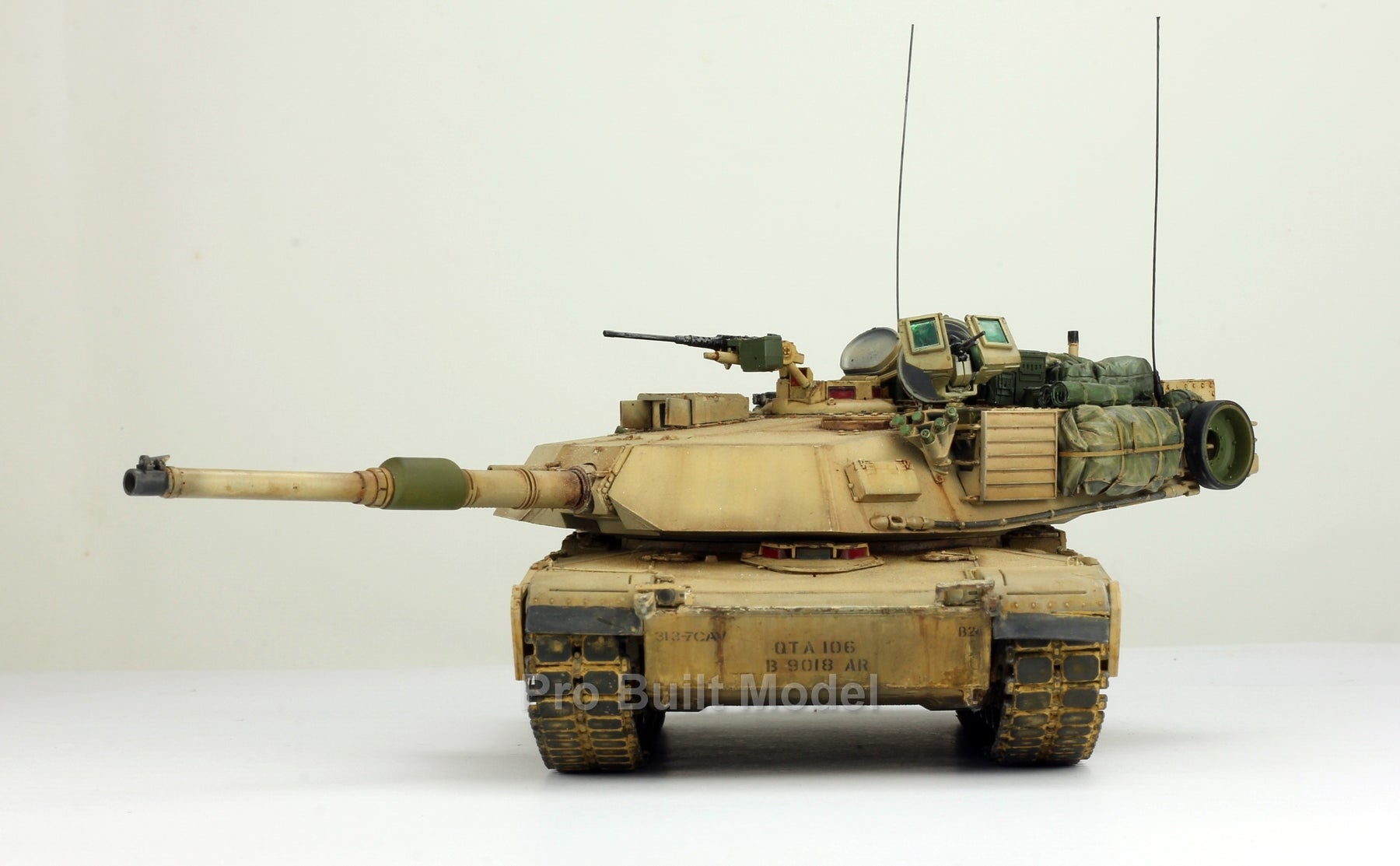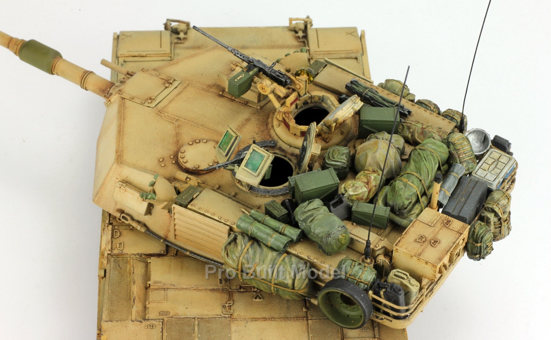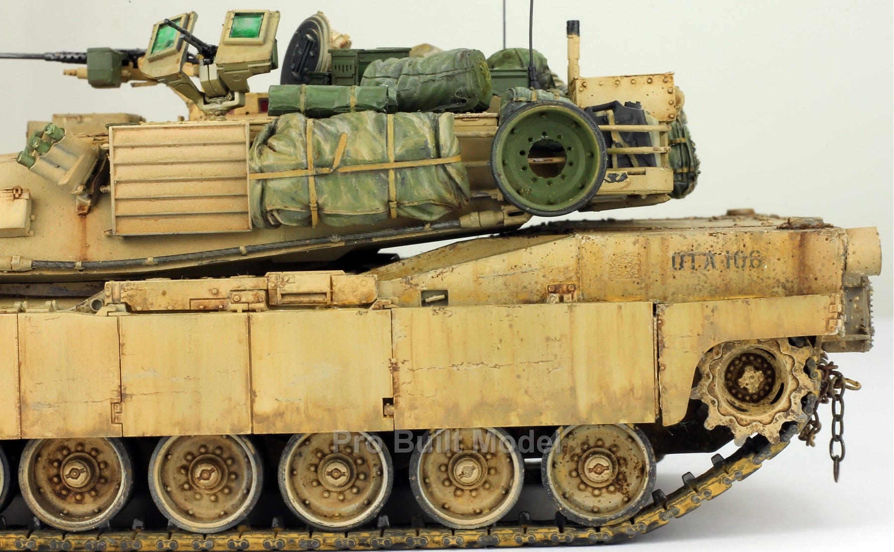 This Abrams was painted using advanced airbrushing, dry-brushing, and pigment weathering to achieve a realistic operational appearance. The tank’s surfaces show subtle shading, metallic scuffs, and sand accumulation to reflect the harsh Middle Eastern battlefield environment.