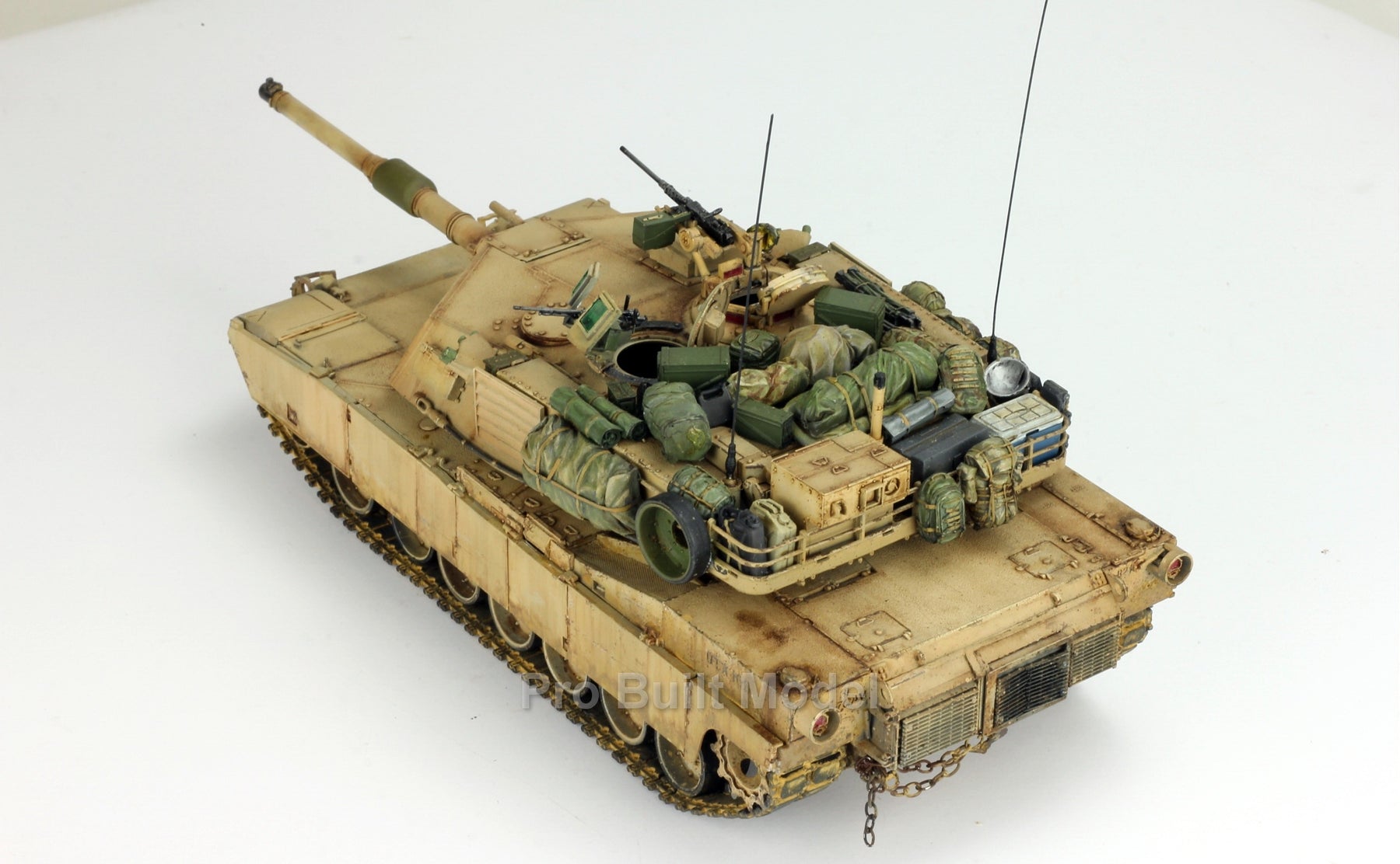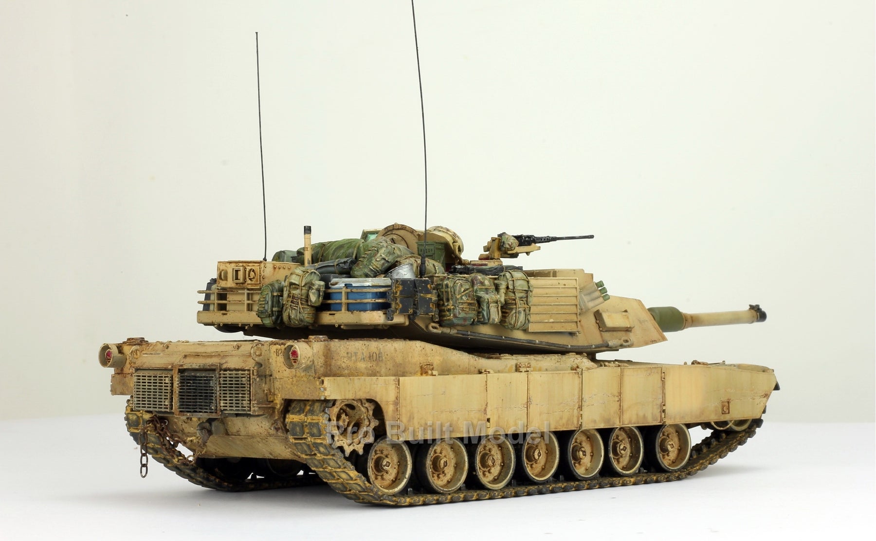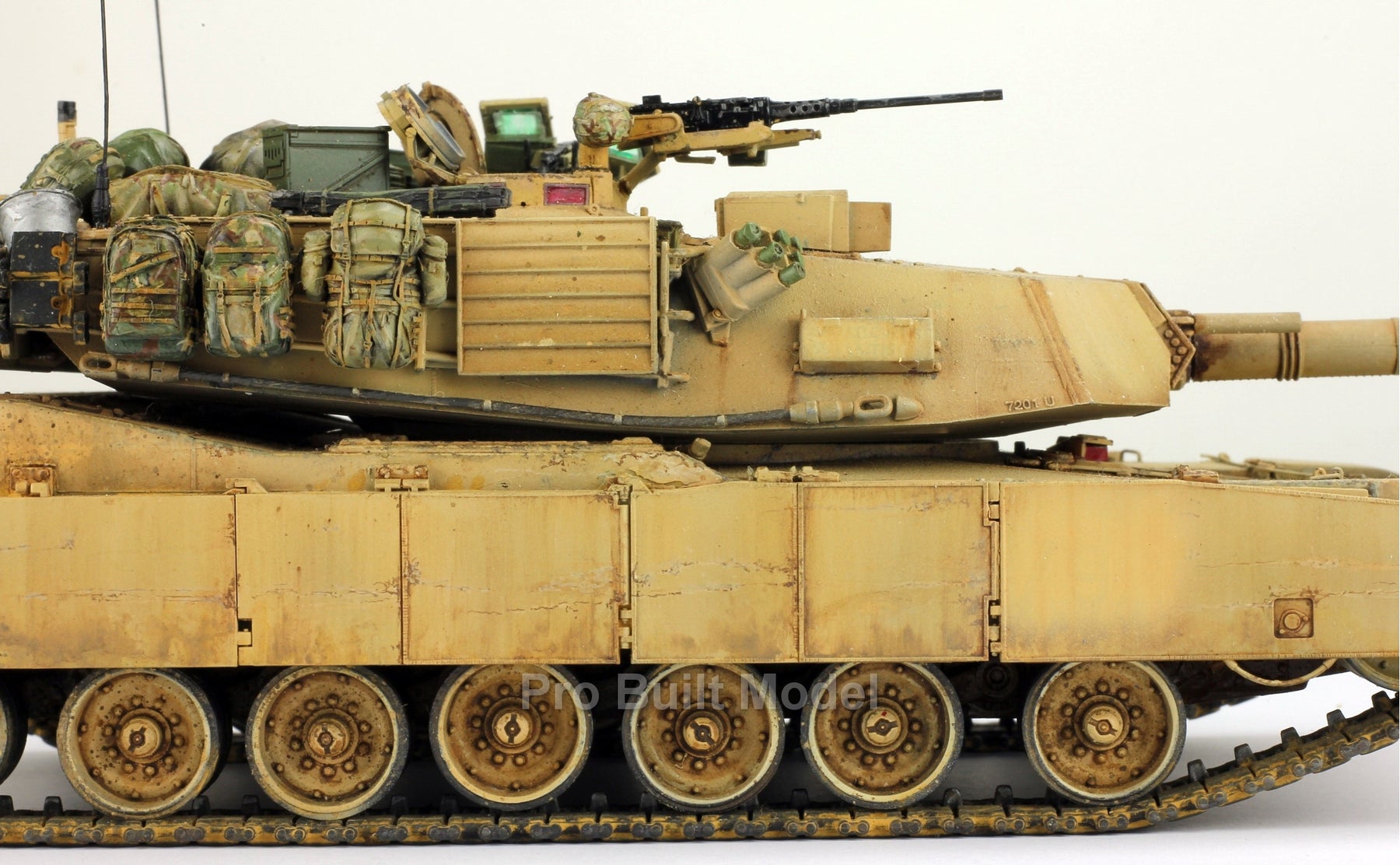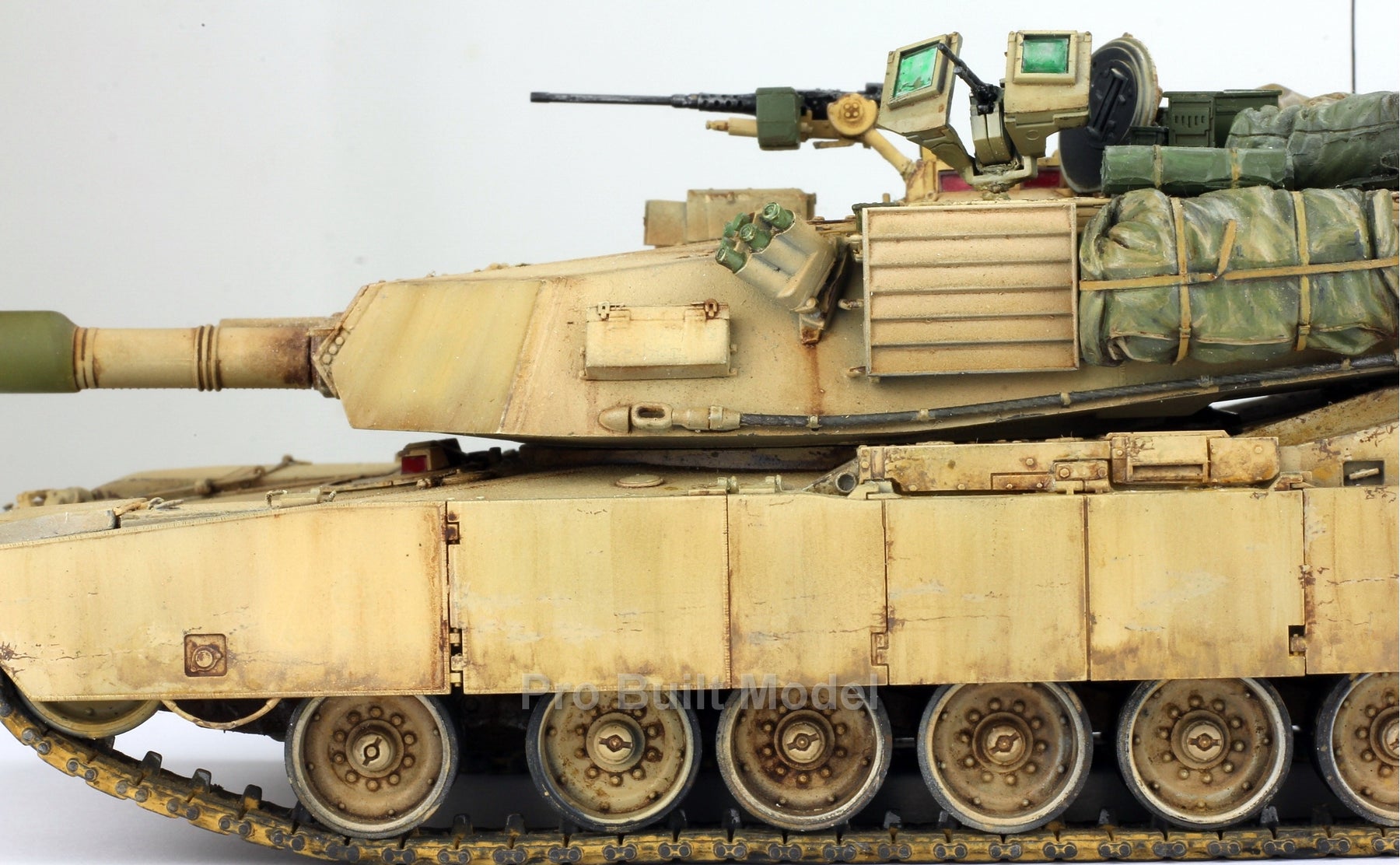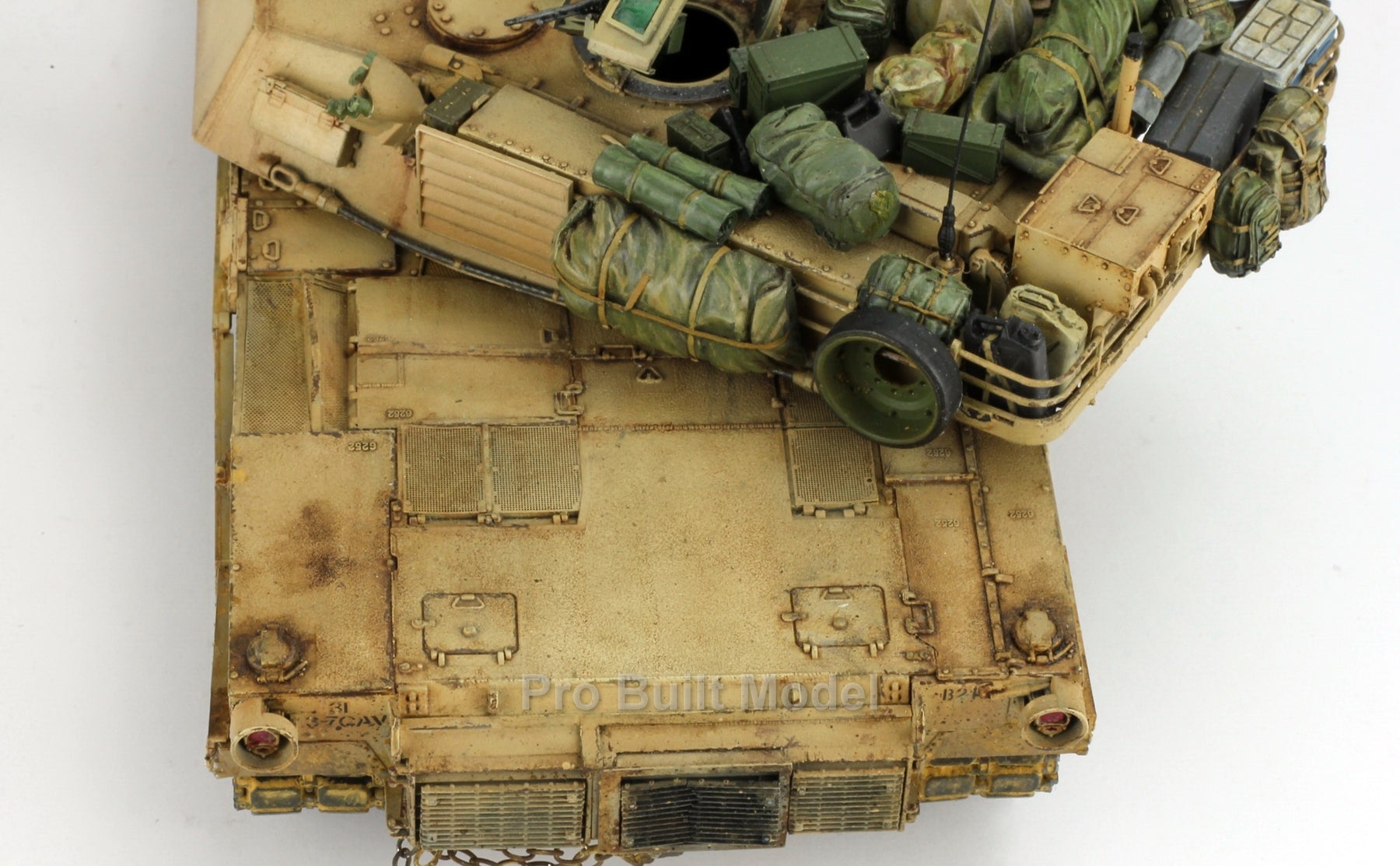 This Abrams was painted using advanced airbrushing, dry-brushing, and pigment weathering to achieve a realistic operational appearance. The tank’s surfaces show subtle shading, metallic scuffs, and sand accumulation to reflect the harsh Middle Eastern battlefield environment.