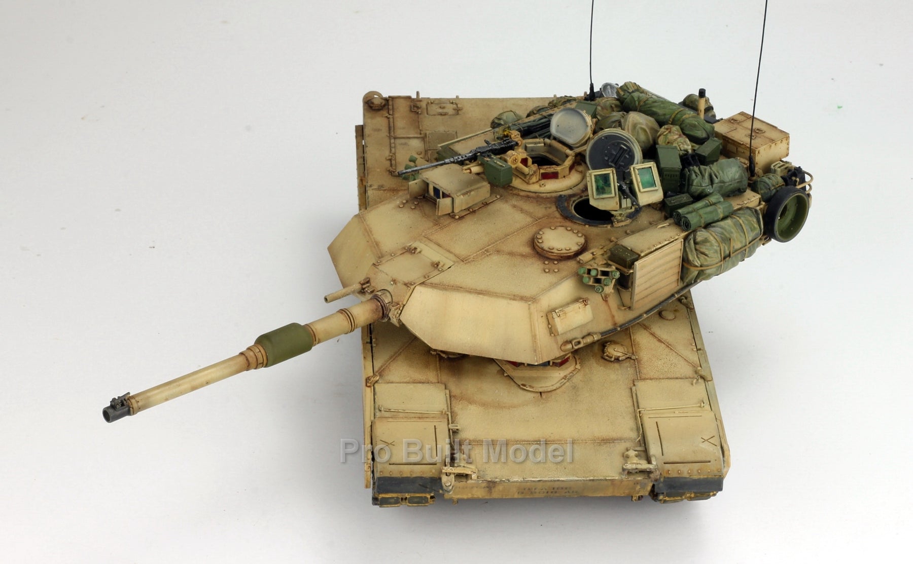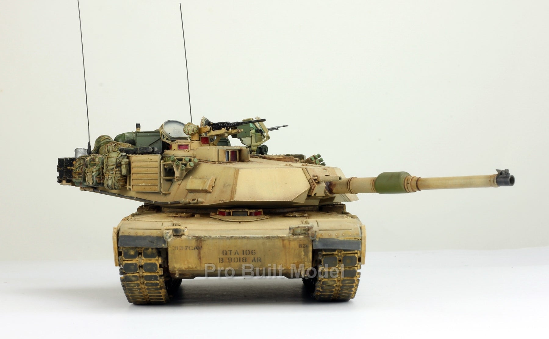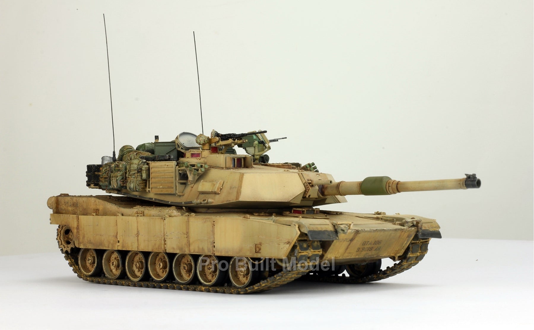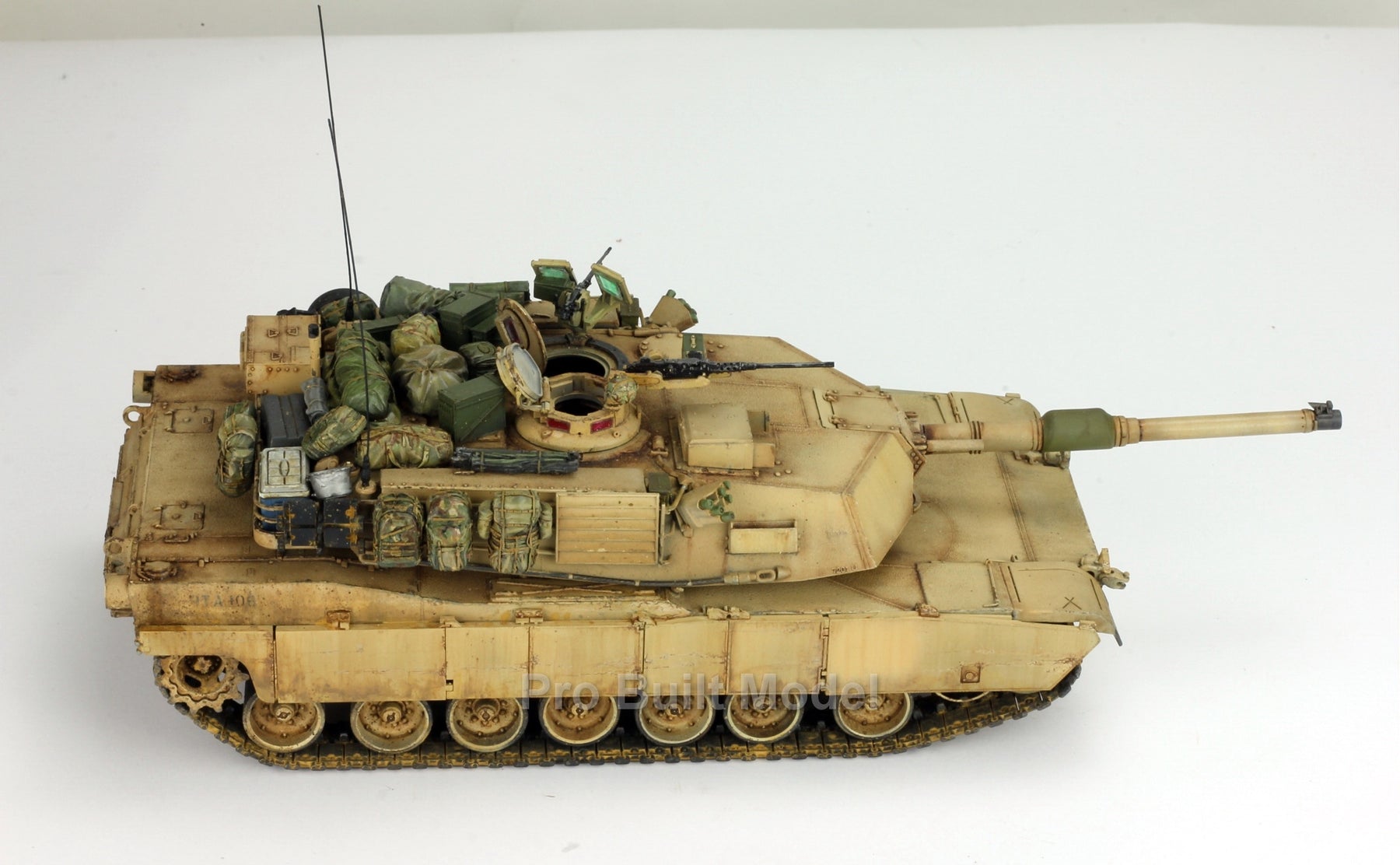 This Abrams was painted using advanced airbrushing, dry-brushing, and pigment weathering to achieve a realistic operational appearance. The tank’s surfaces show subtle shading, metallic scuffs, and sand accumulation to reflect the harsh Middle Eastern battlefield environment.