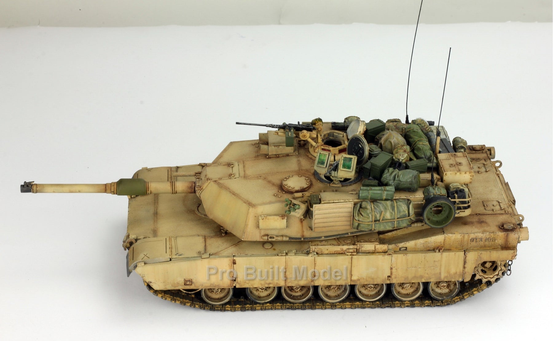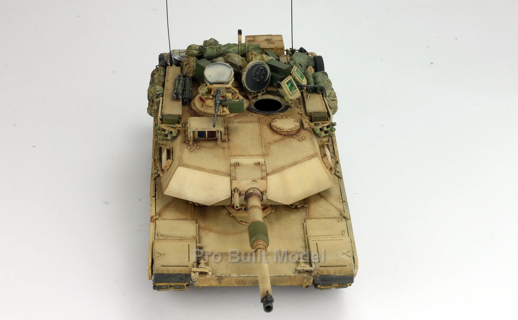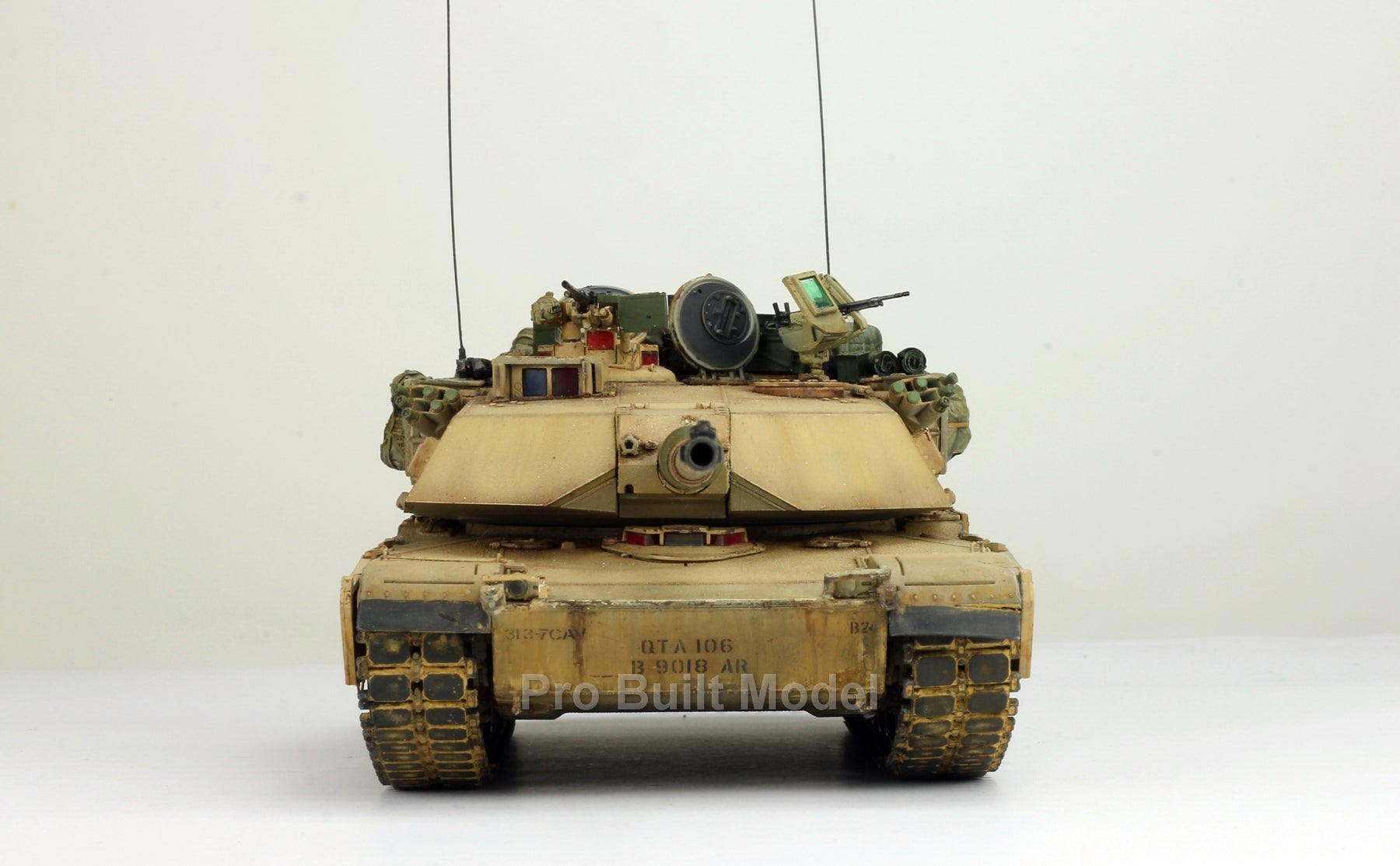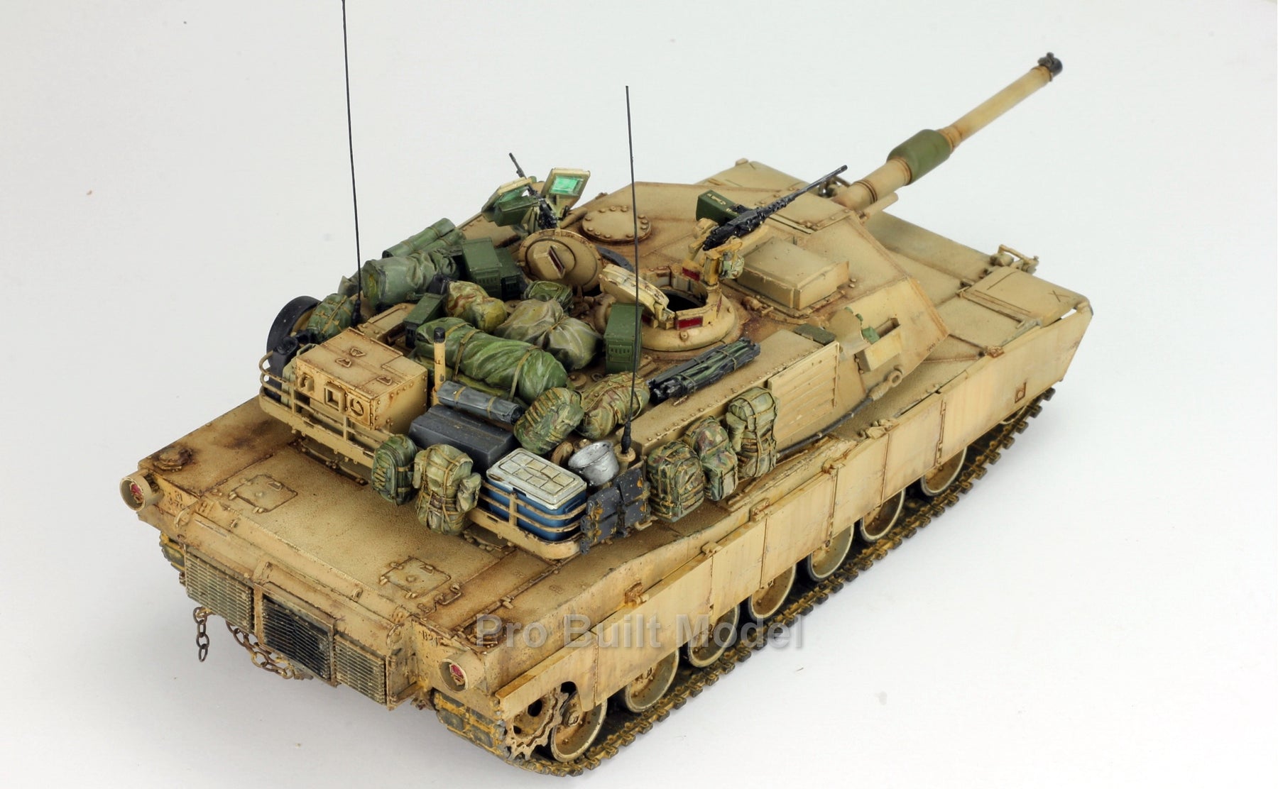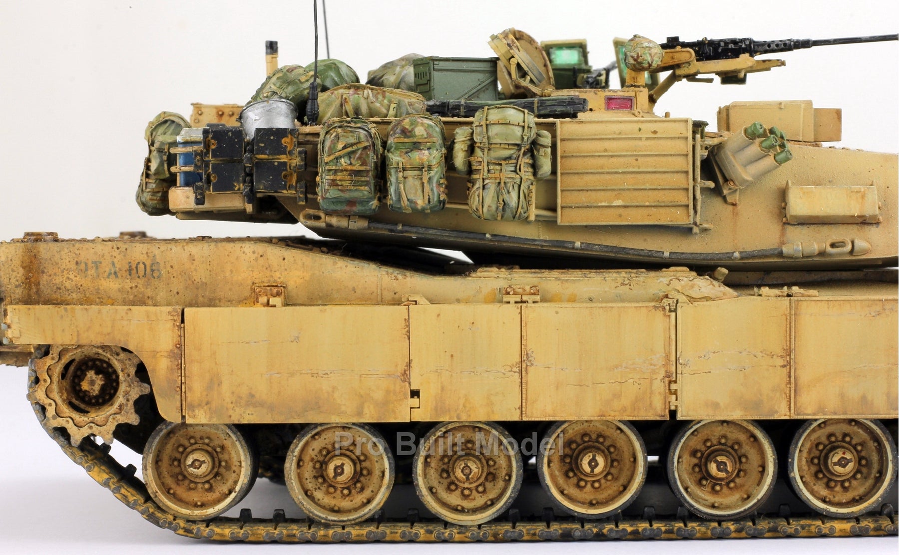 This Abrams was painted using advanced airbrushing, dry-brushing, and pigment weathering to achieve a realistic operational appearance. The tank’s surfaces show subtle shading, metallic scuffs, and sand accumulation to reflect the harsh Middle Eastern battlefield environment.