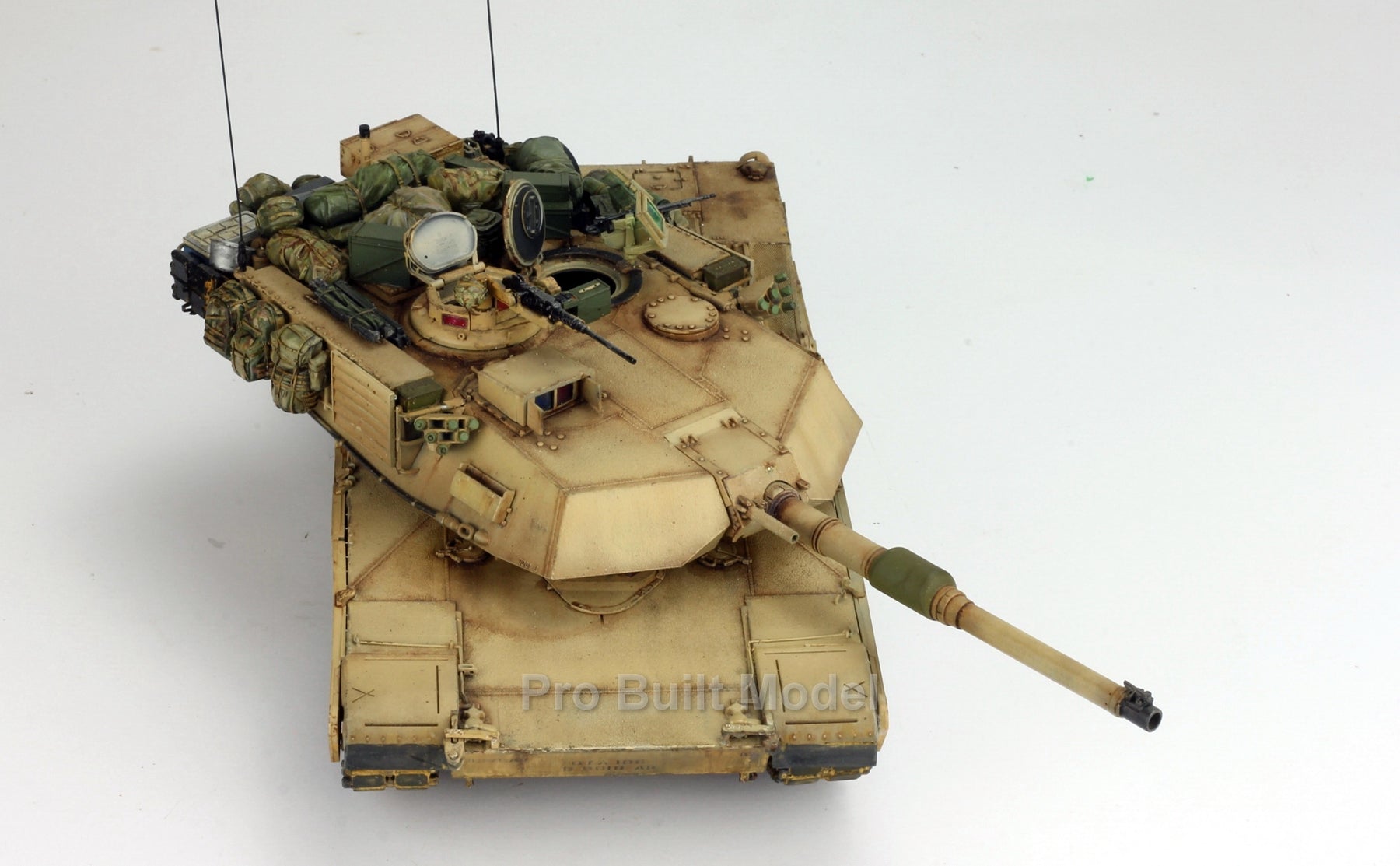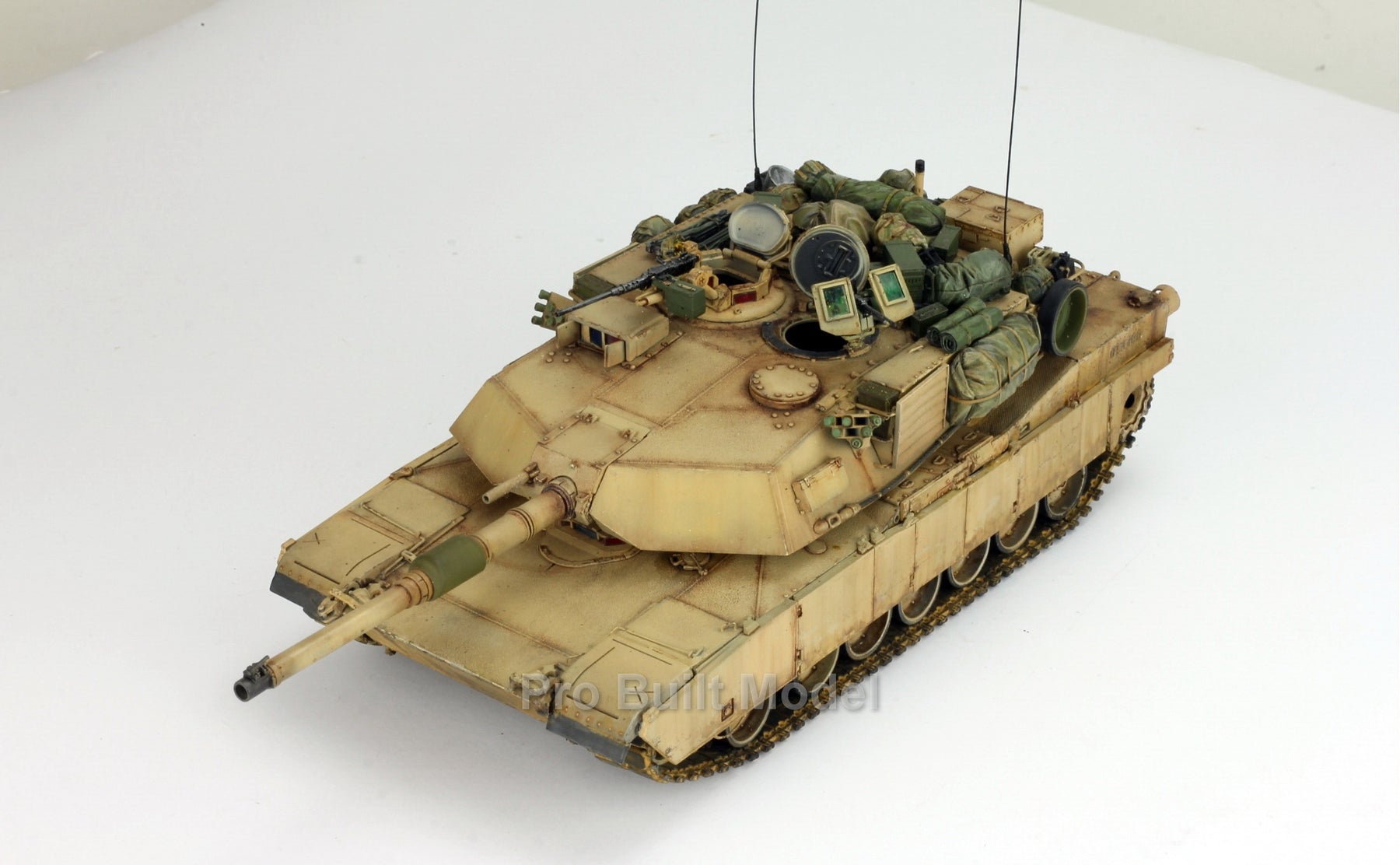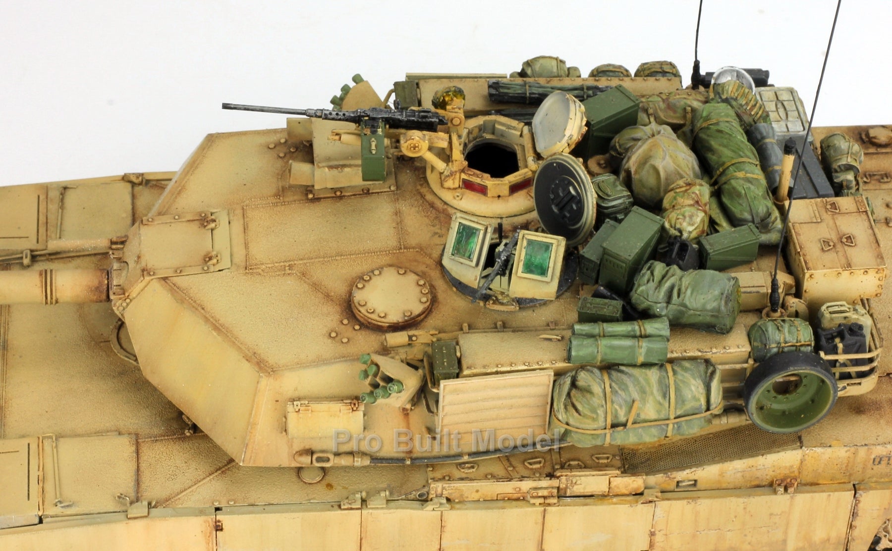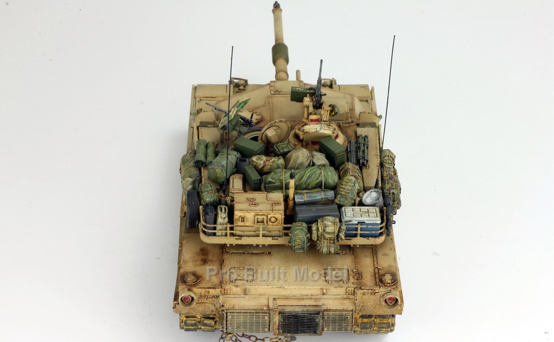 This Abrams was painted using advanced airbrushing, dry-brushing, and pigment weathering to achieve a realistic operational appearance. The tank’s surfaces show subtle shading, metallic scuffs, and sand accumulation to reflect the harsh Middle Eastern battlefield environment.