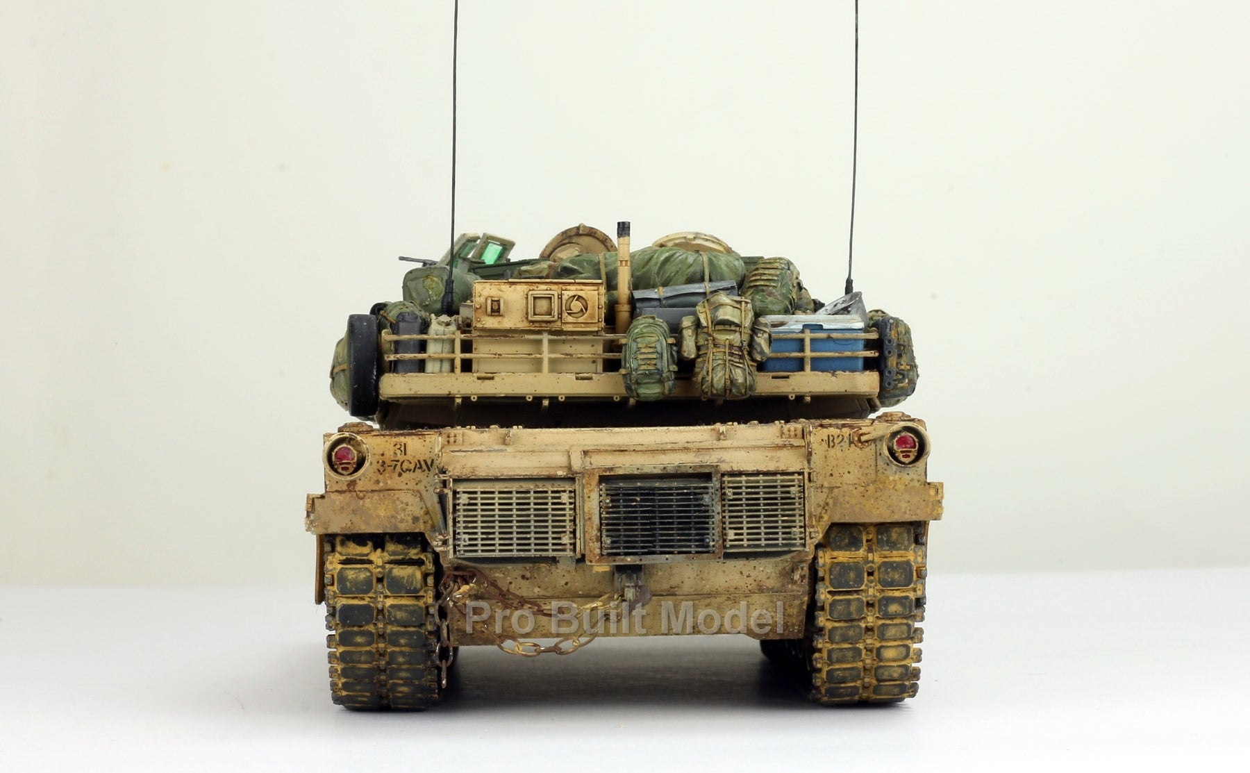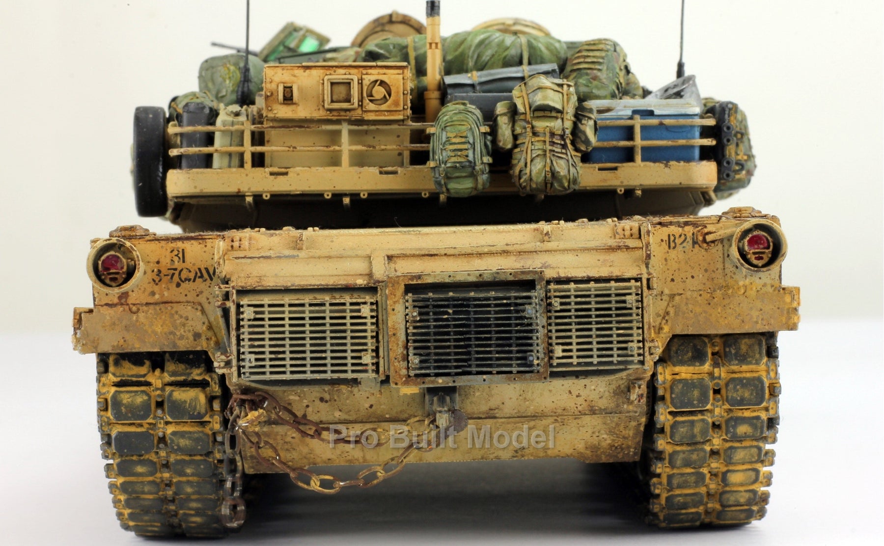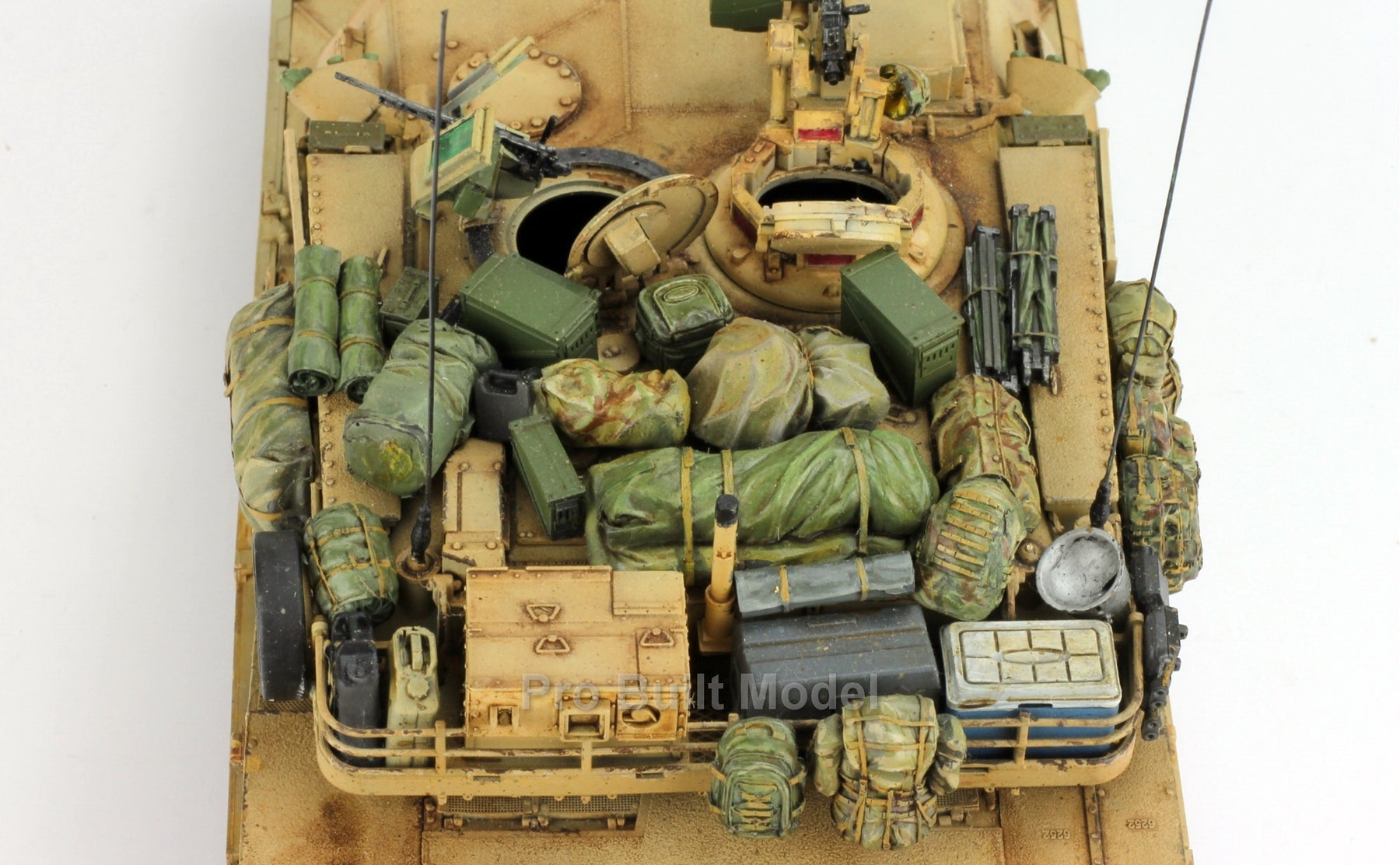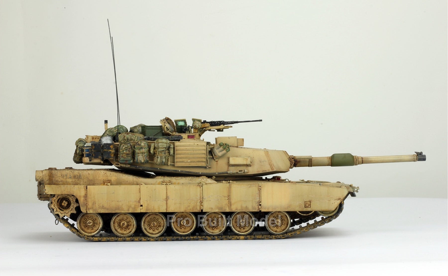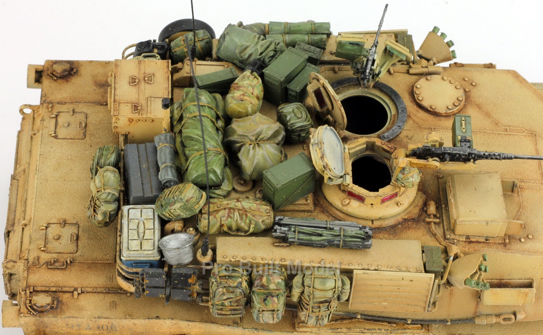This Abrams was painted using advanced airbrushing, dry-brushing, and pigment weathering to achieve a realistic operational appearance. The tank’s surfaces show subtle shading, metallic scuffs, and sand accumulation to reflect the harsh Middle Eastern battlefield environment.