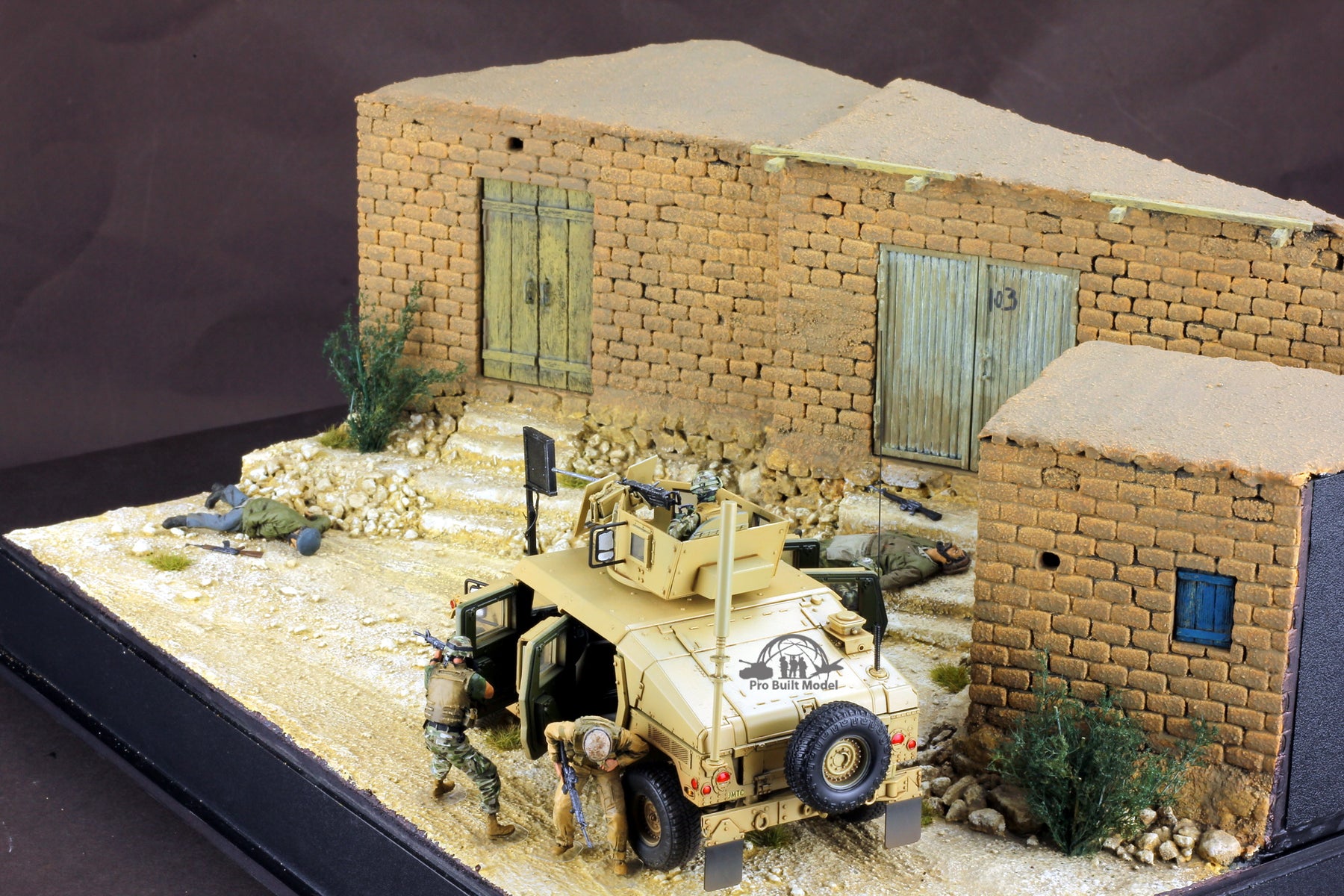 This handcrafted base depicts a desert village scene with mud-brick houses, wooden doors, stone steps, scattered rubble, and dry vegetation – capturing the look of rural Afghan and Middle East villages. It’s ideal for USMC, NATO, coalition forces, or insurgent/guerrilla dioramas.