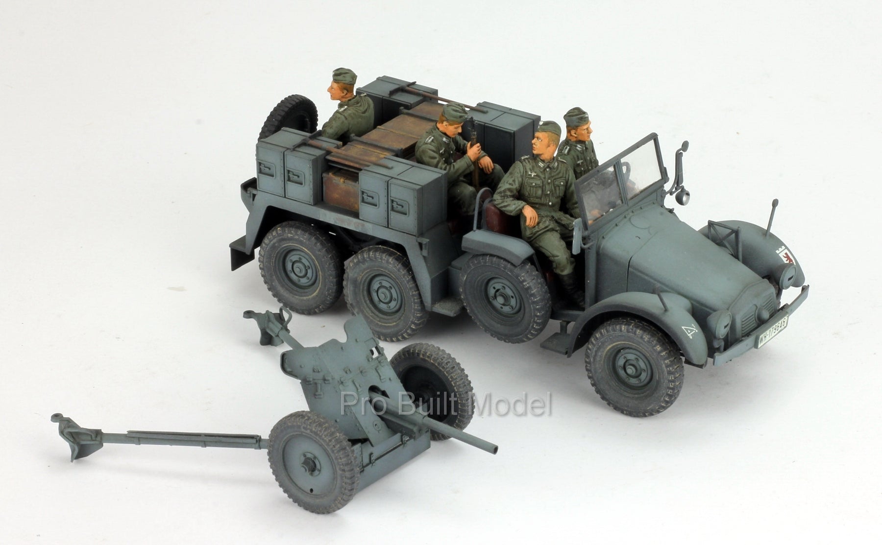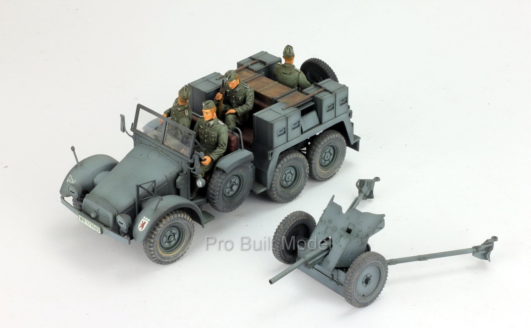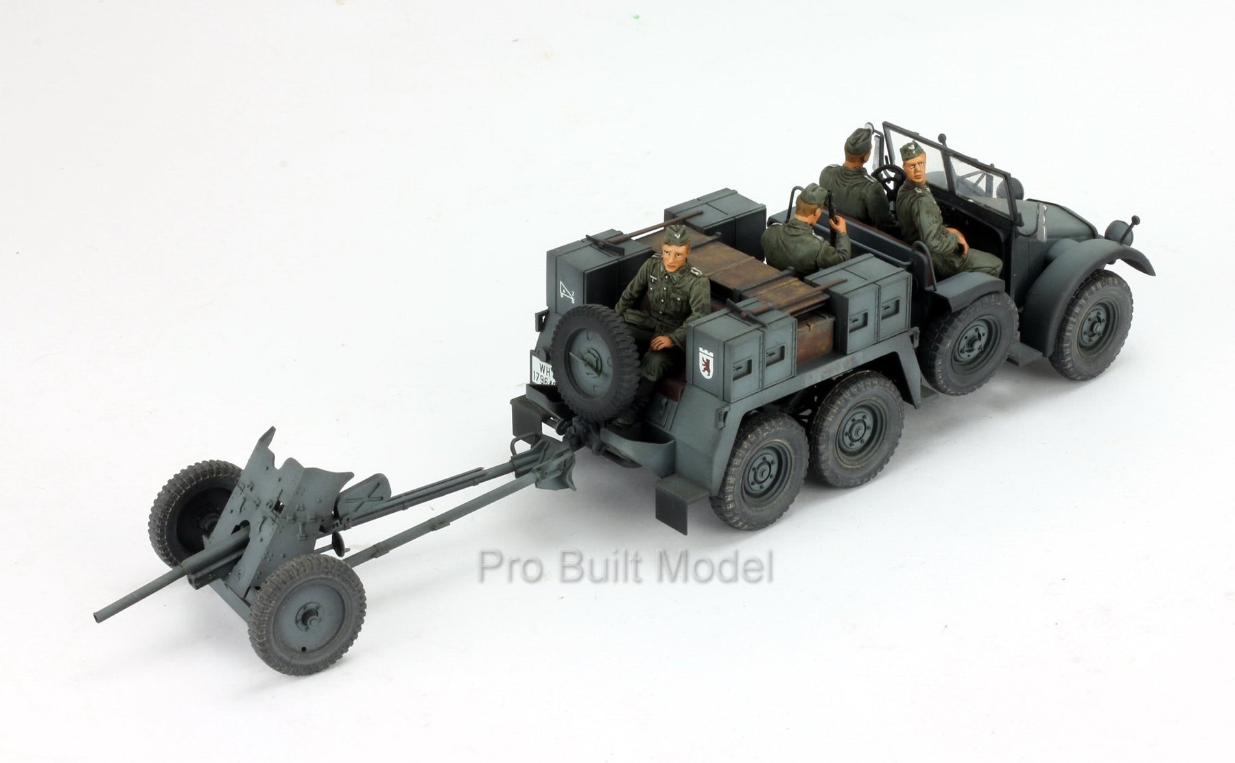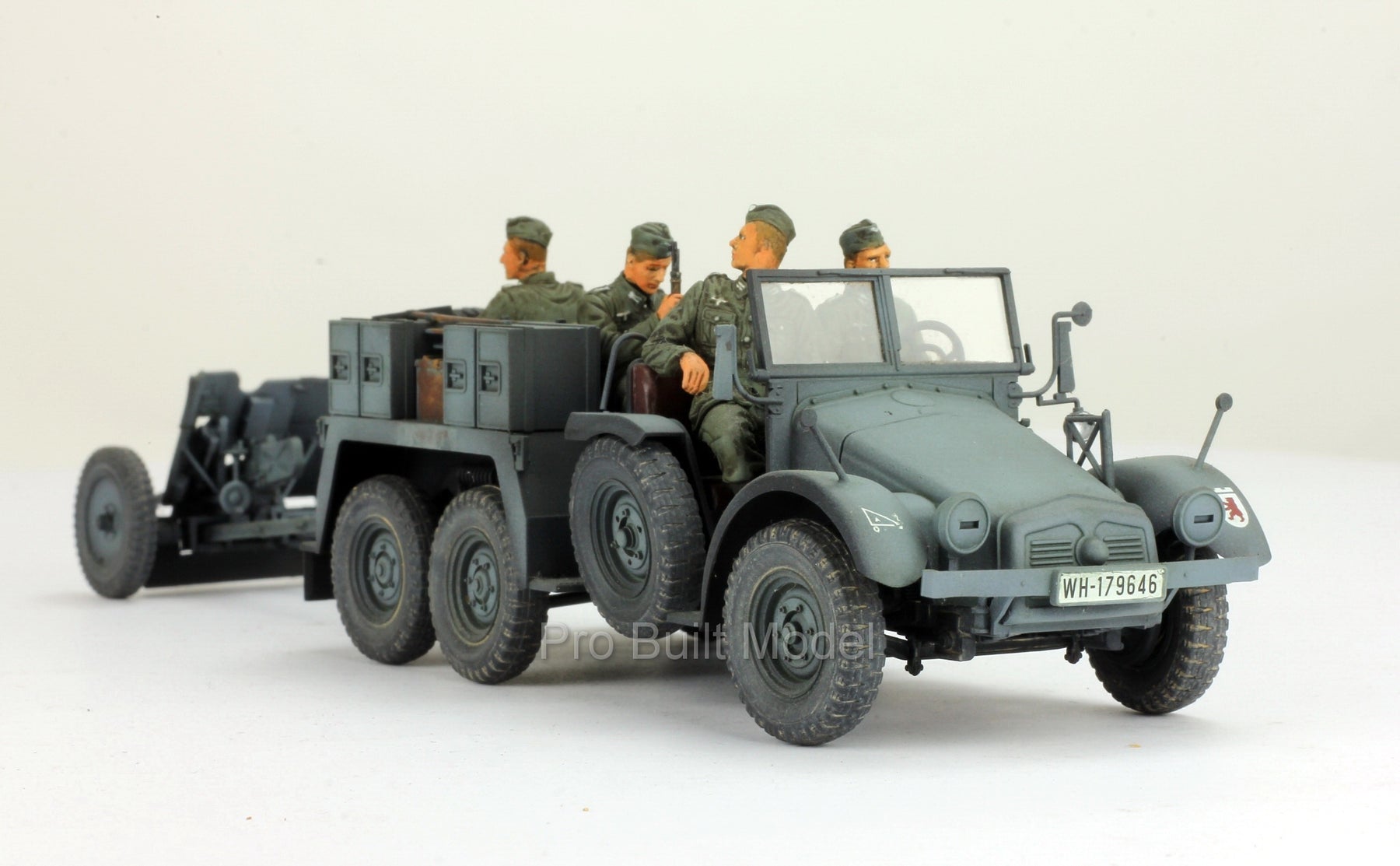 Bring iconic World War II history to your display with this 1:35 ProBuilt German Krupp Protze Kfz.69 towing truck, equipped with a 3.7cm Pak 36 anti-tank gun and four hand-painted crew figures.