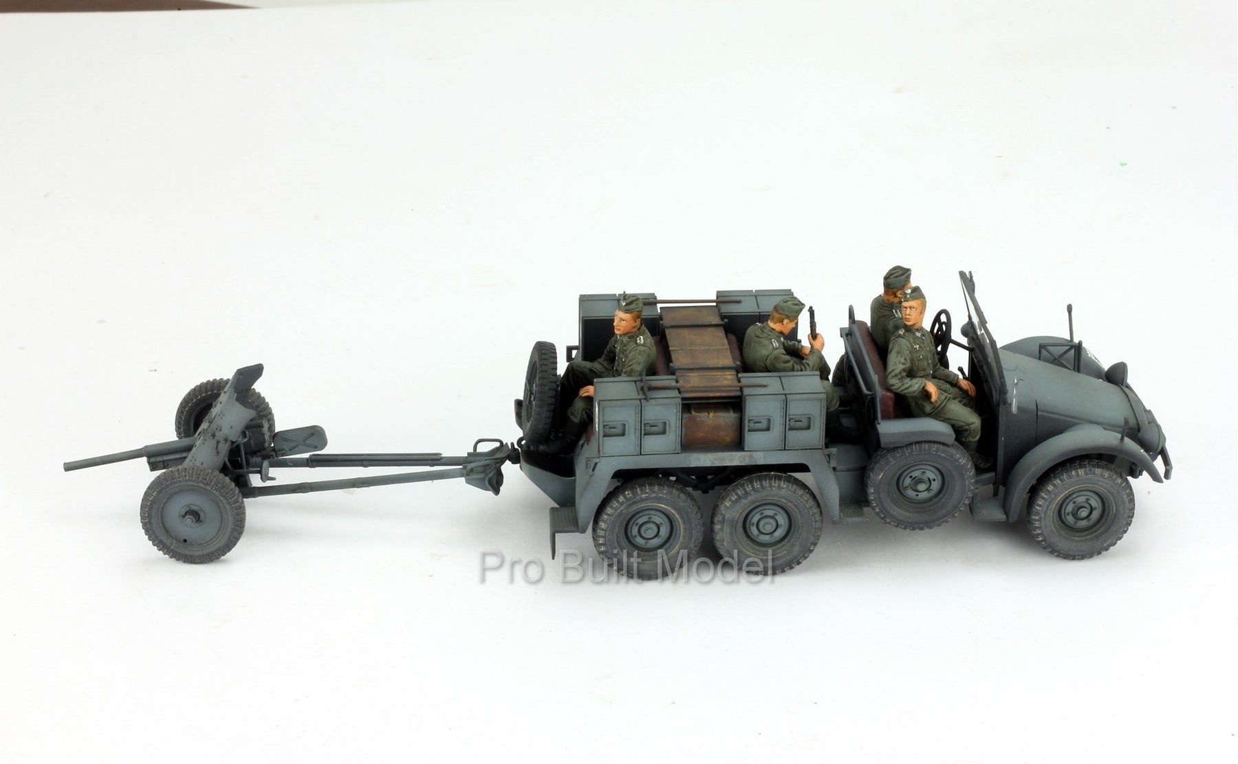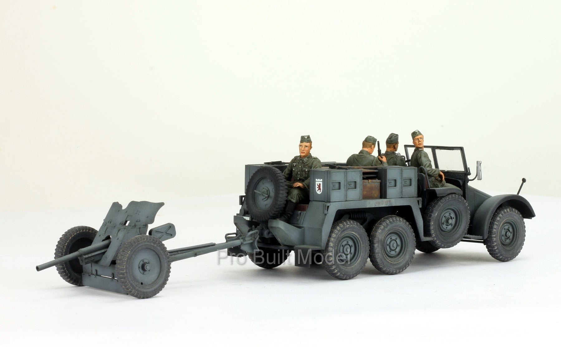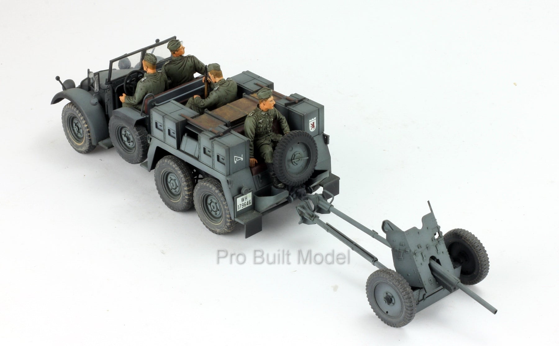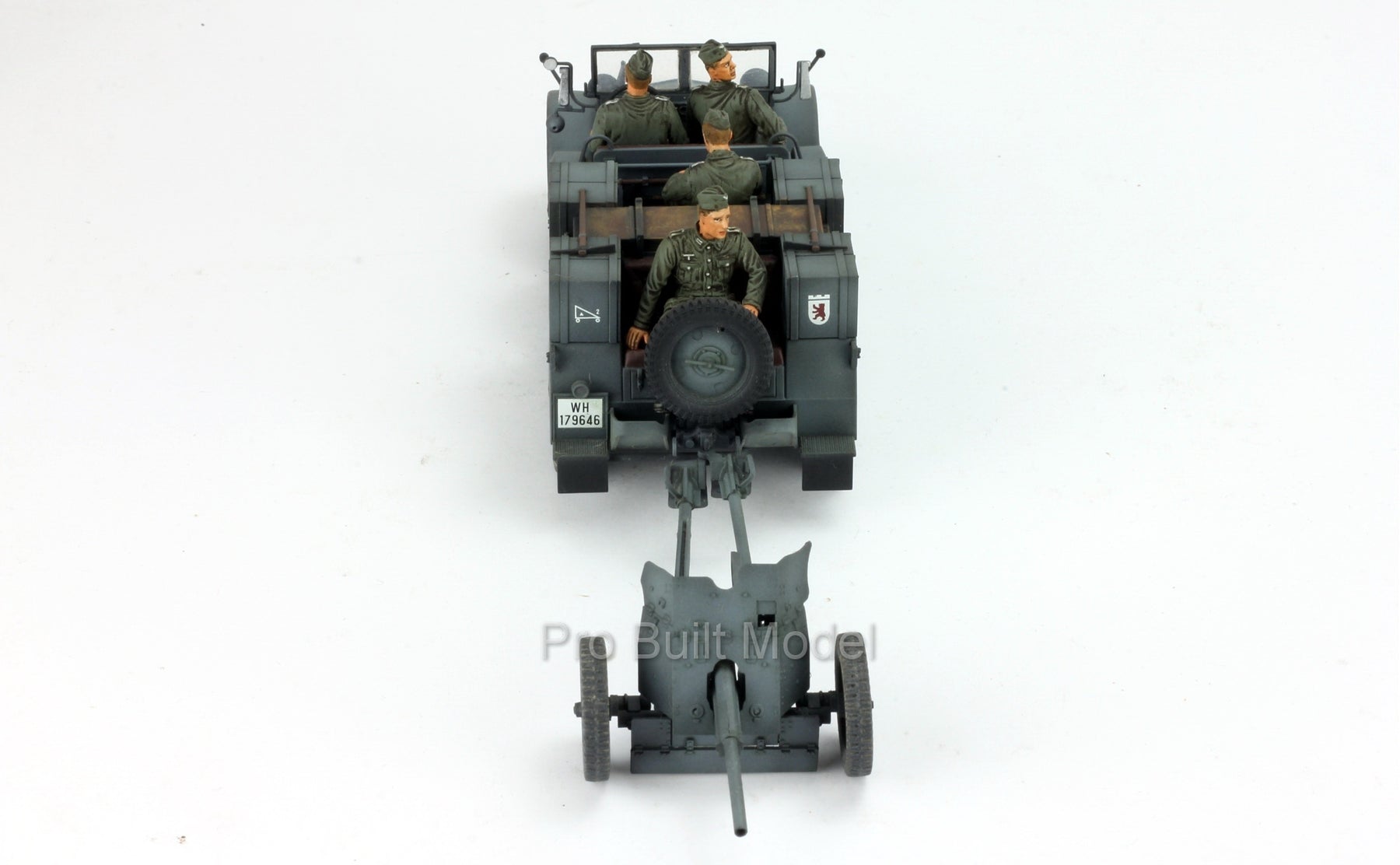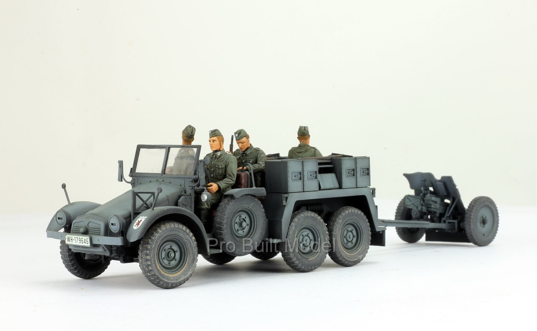 Bring iconic World War II history to your display with this 1:35 ProBuilt German Krupp Protze Kfz.69 towing truck, equipped with a 3.7cm Pak 36 anti-tank gun and four hand-painted crew figures.