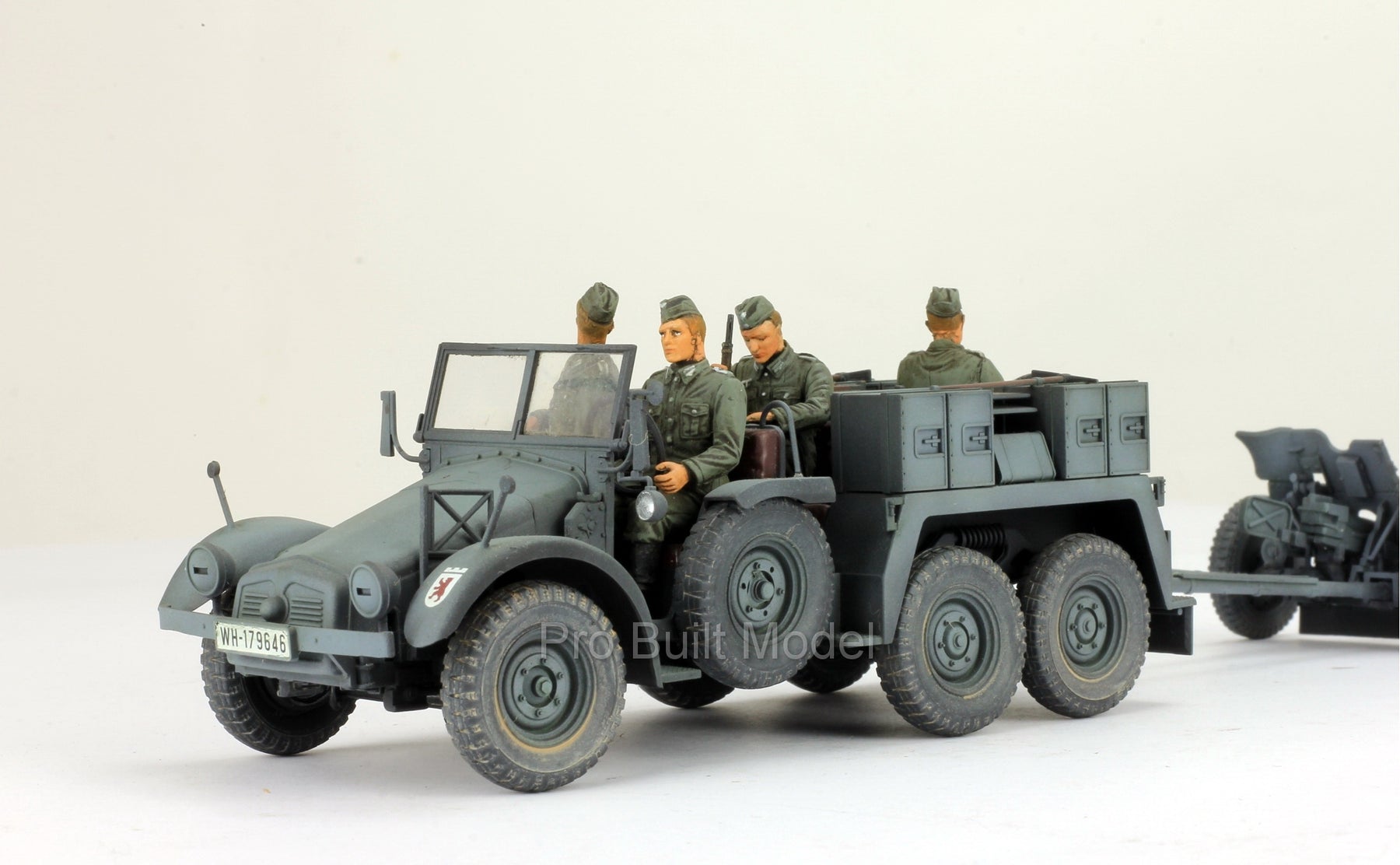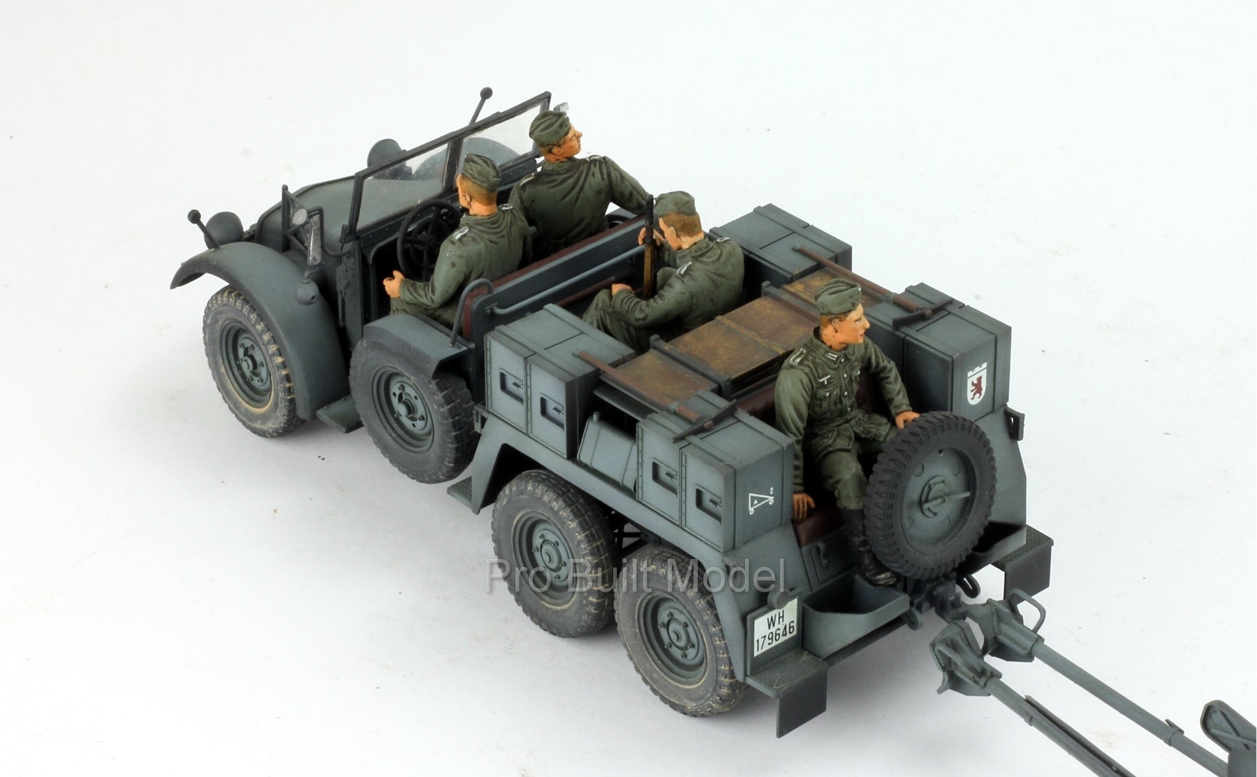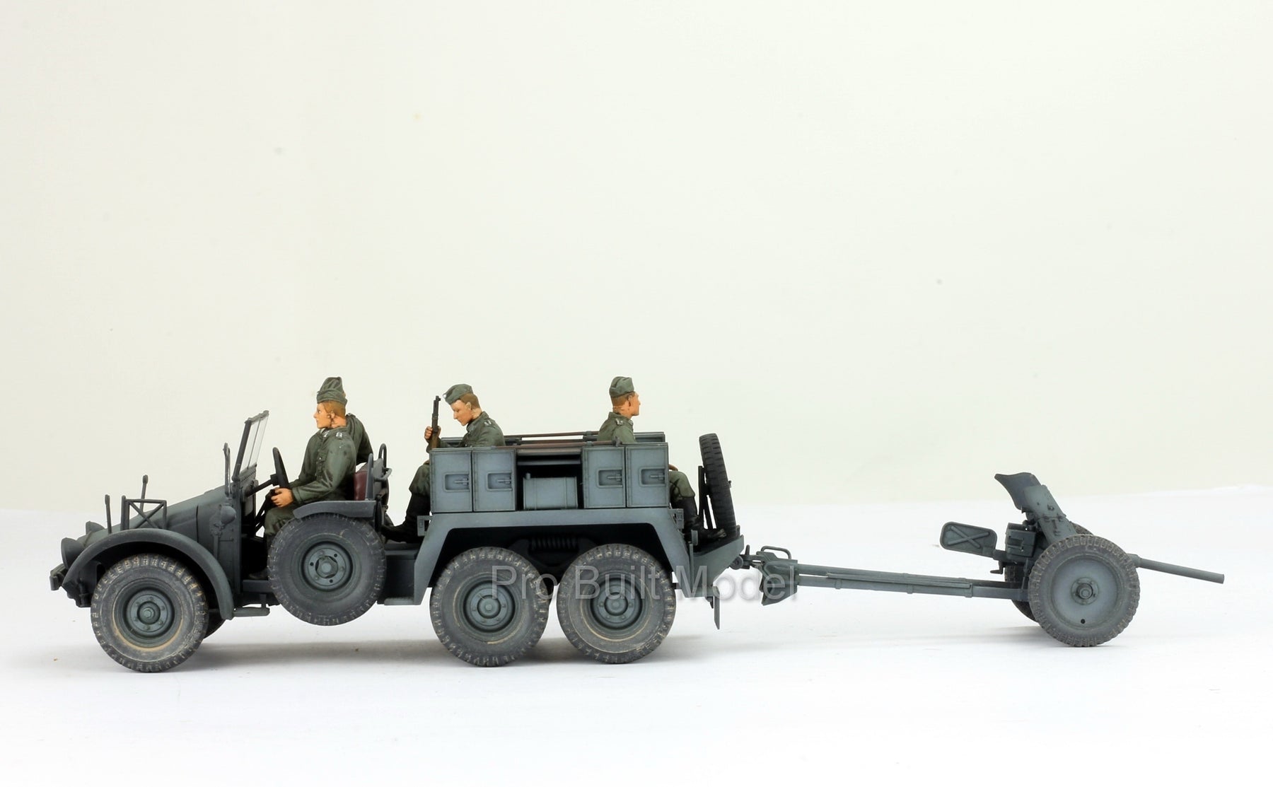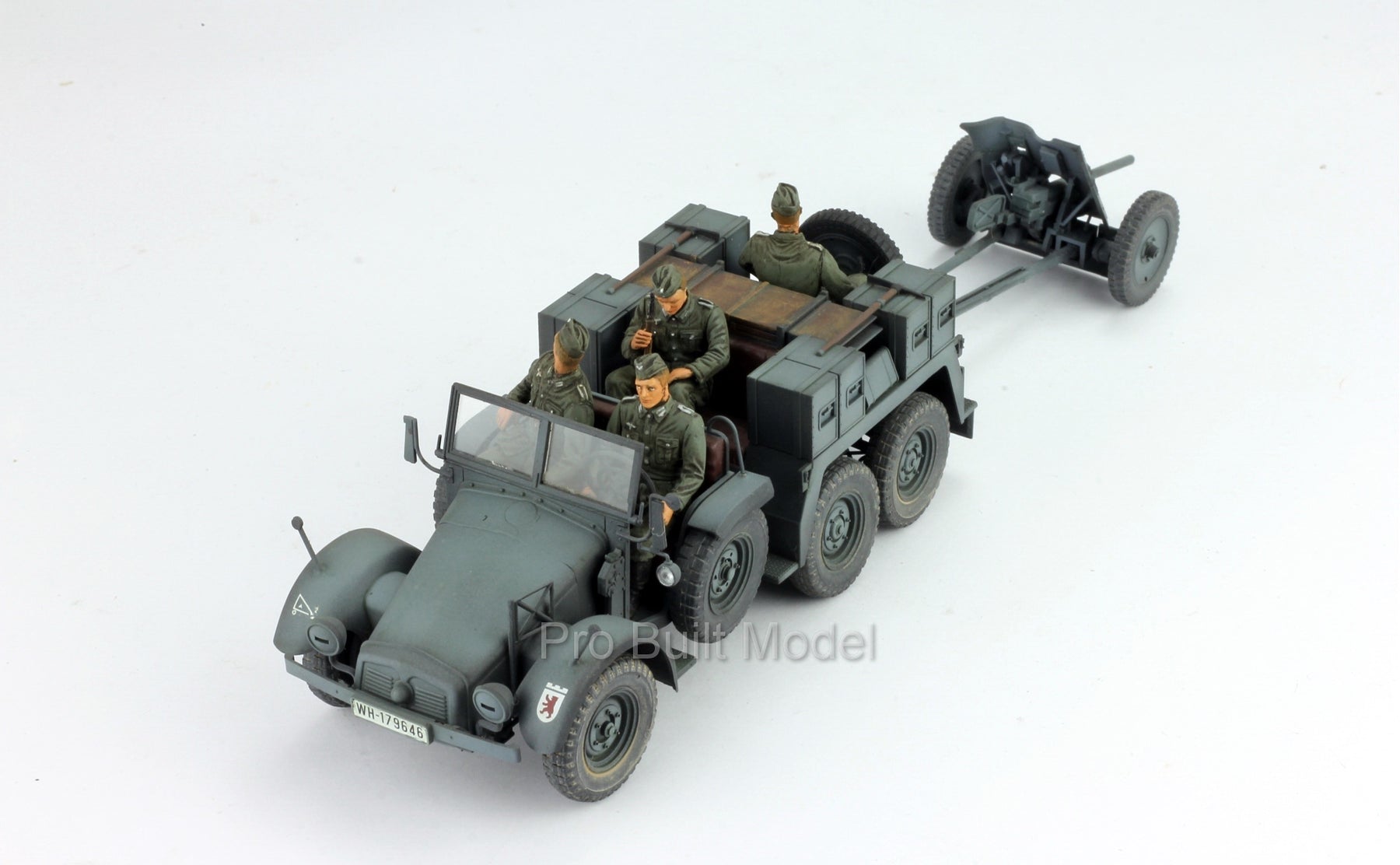 Bring iconic World War II history to your display with this 1:35 ProBuilt German Krupp Protze Kfz.69 towing truck, equipped with a 3.7cm Pak 36 anti-tank gun and four hand-painted crew figures.