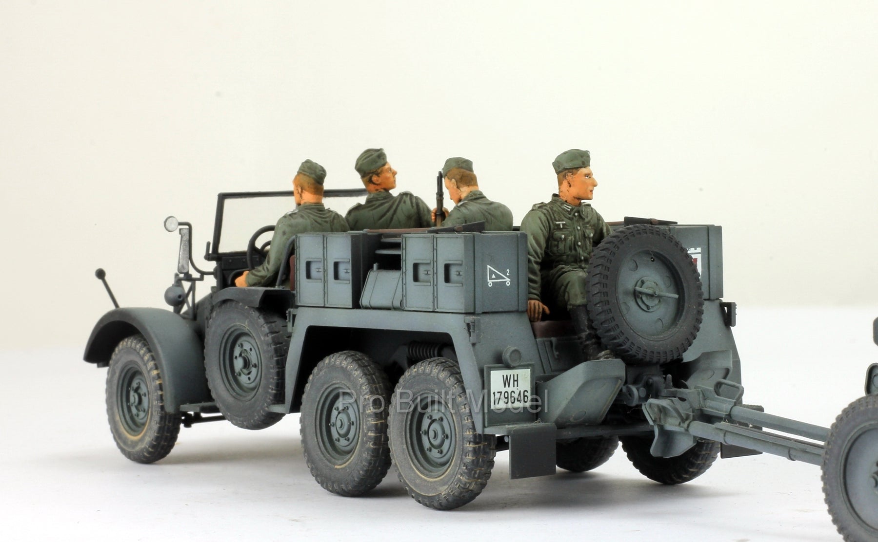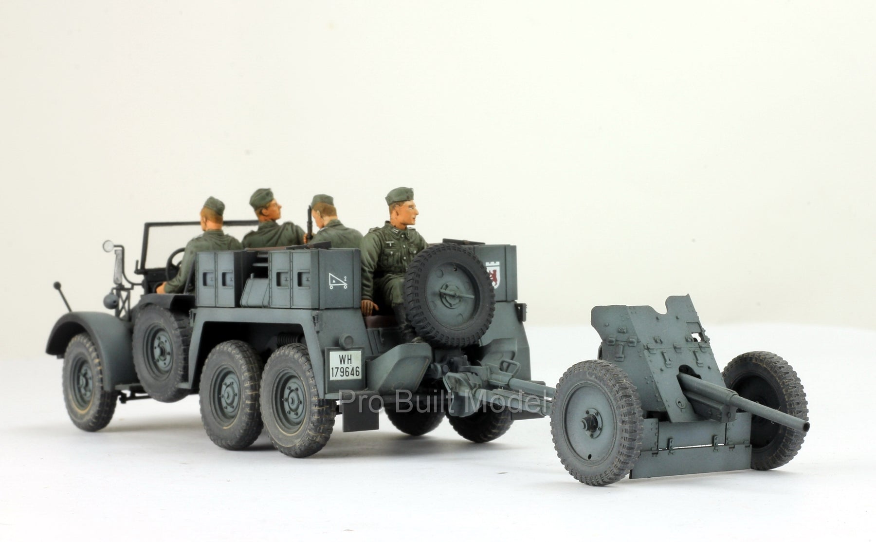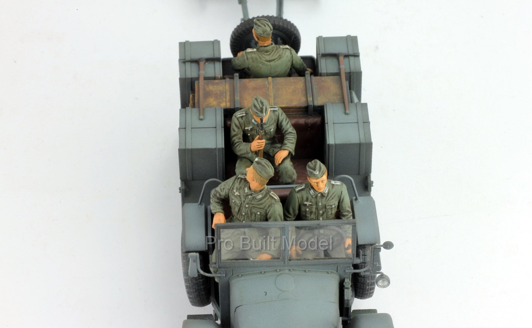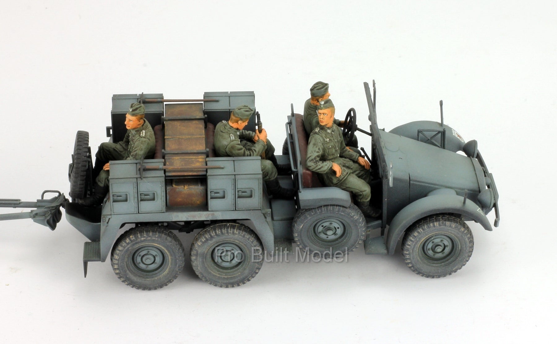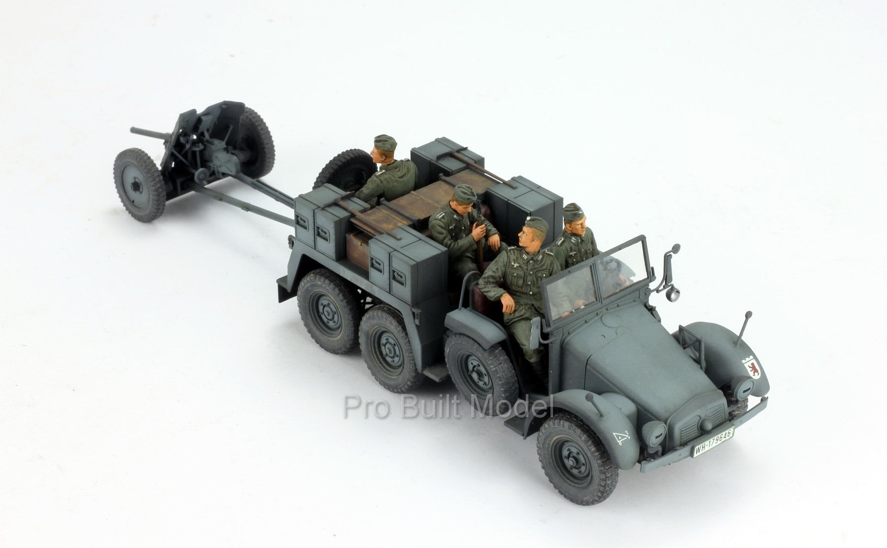 Bring iconic World War II history to your display with this 1:35 ProBuilt German Krupp Protze Kfz.69 towing truck, equipped with a 3.7cm Pak 36 anti-tank gun and four hand-painted crew figures.