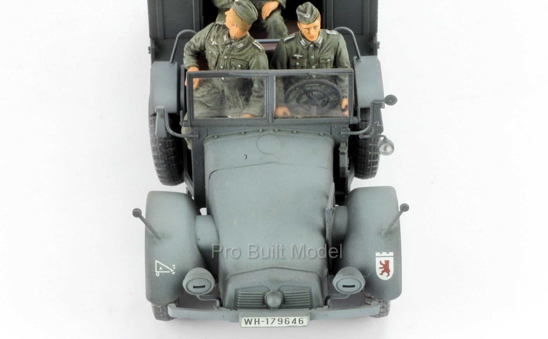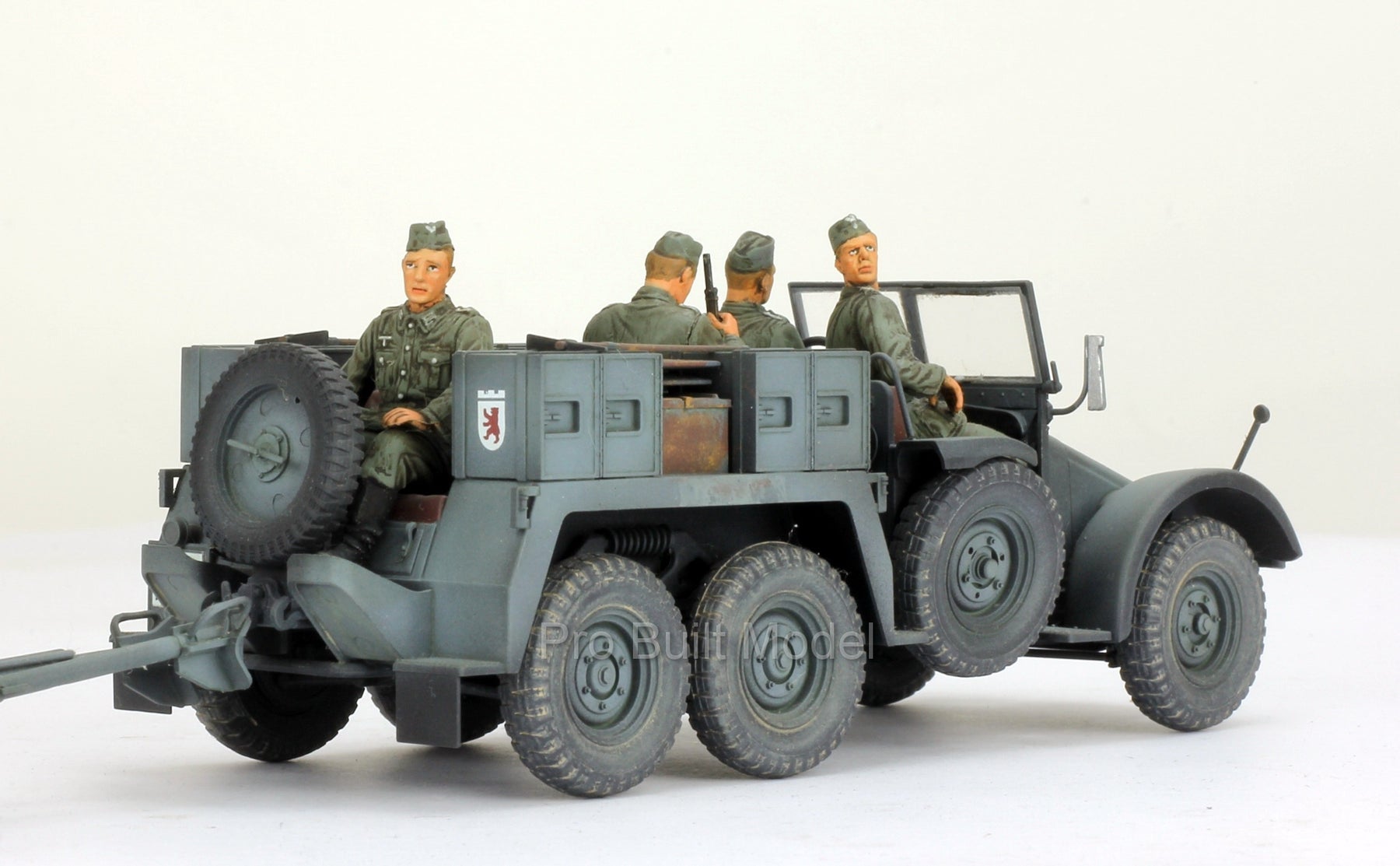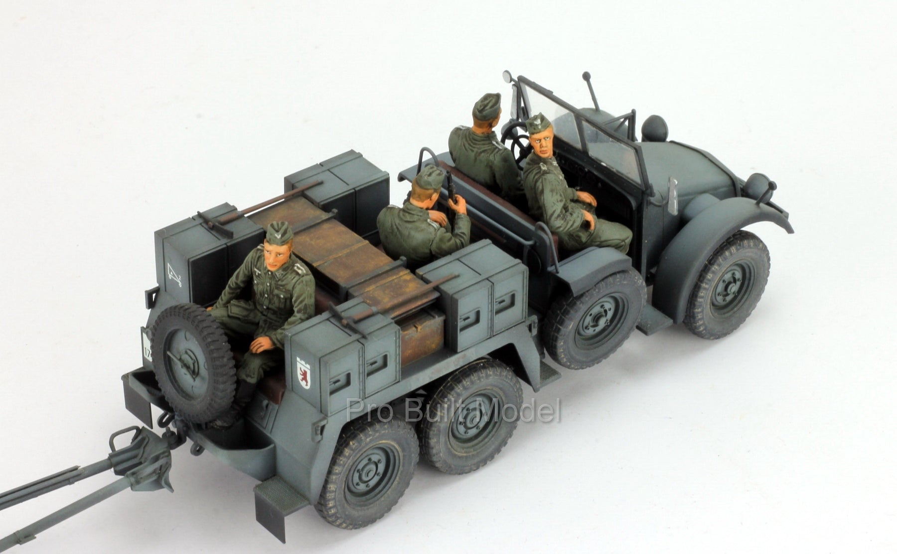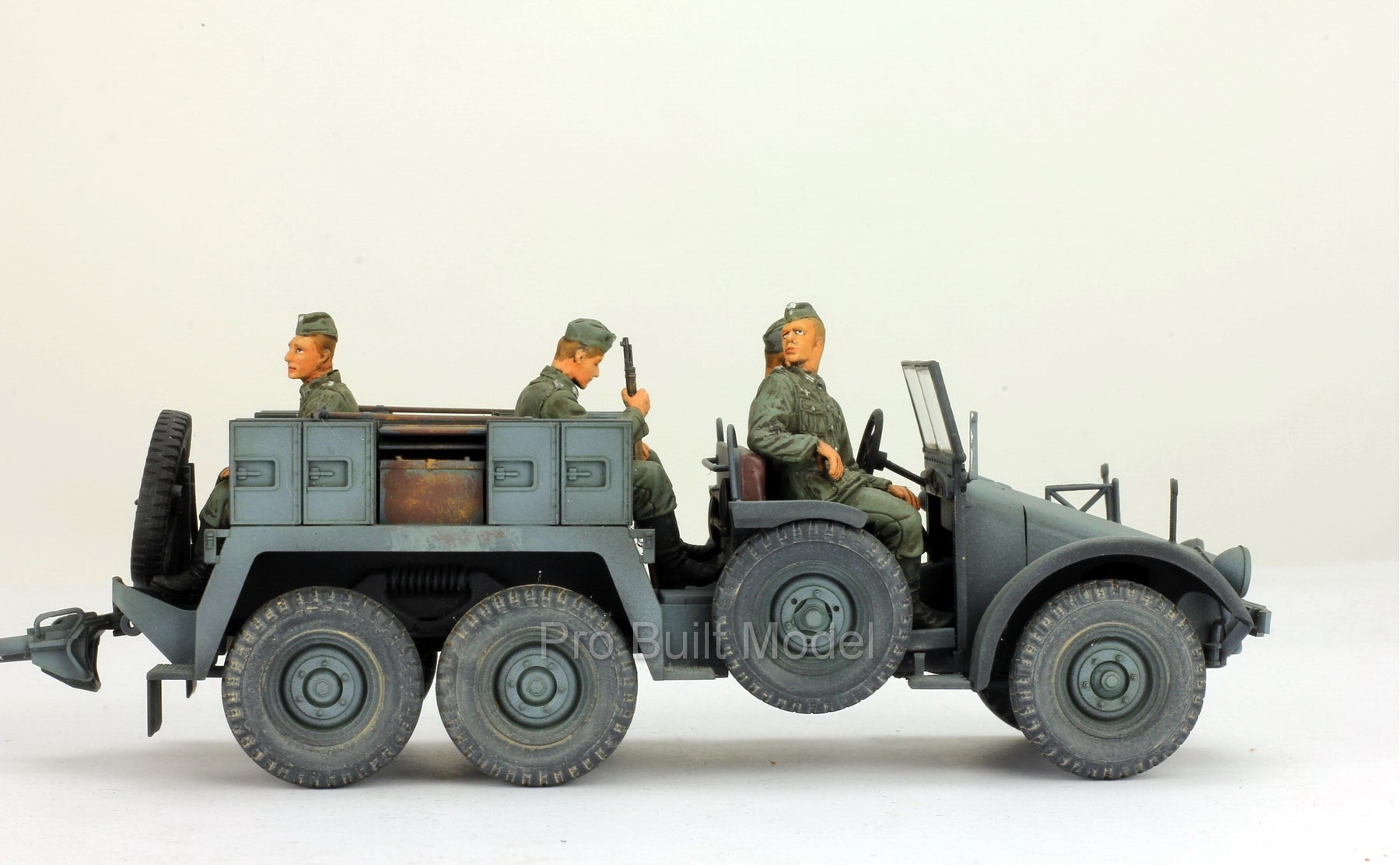 Bring iconic World War II history to your display with this 1:35 ProBuilt German Krupp Protze Kfz.69 towing truck, equipped with a 3.7cm Pak 36 anti-tank gun and four hand-painted crew figures.