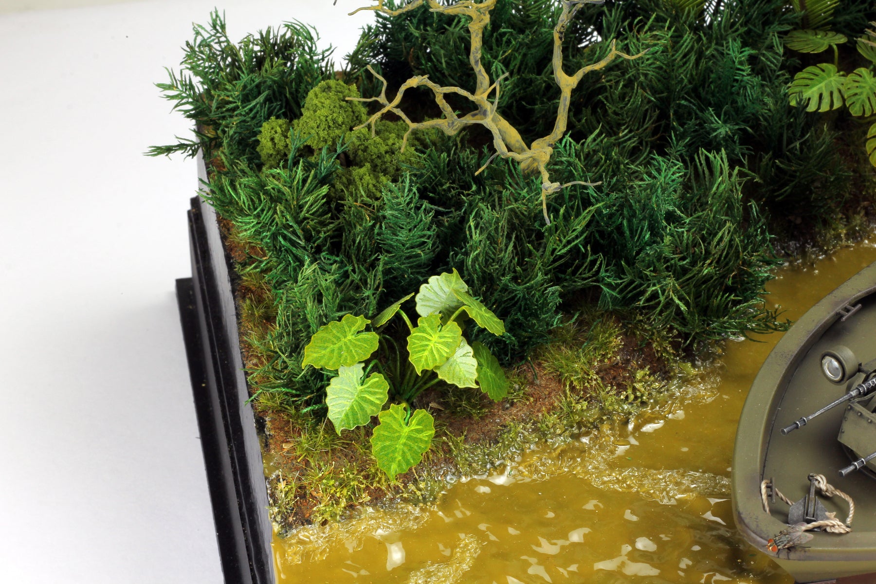 This listing includes everything shown in the completed scene: the PBR boat, 4 detailed crew figures, and a custom-built river base with authentic jungle scenery.