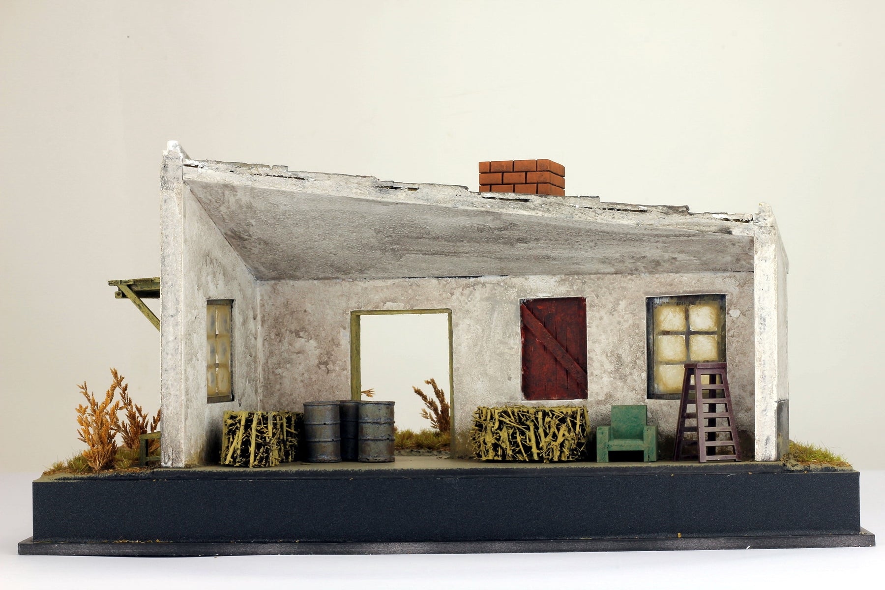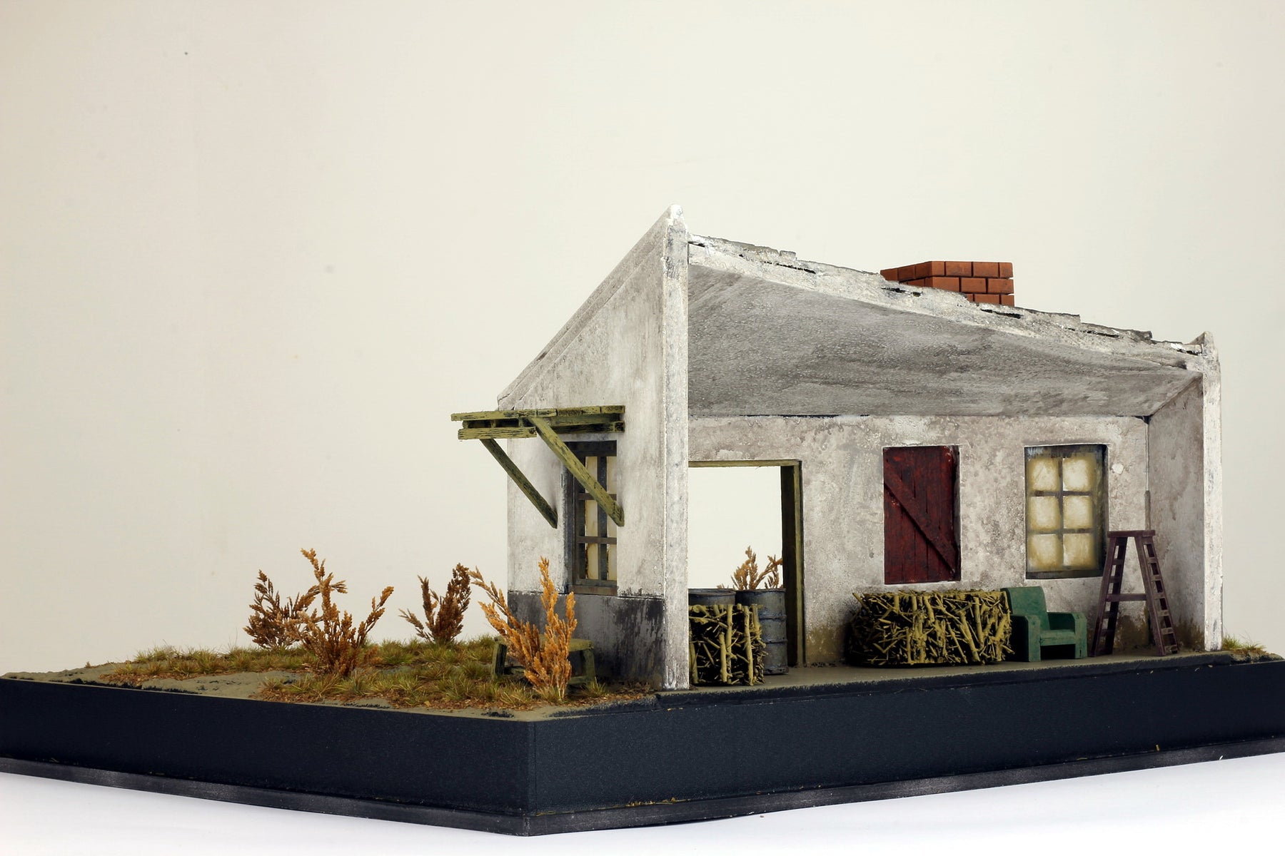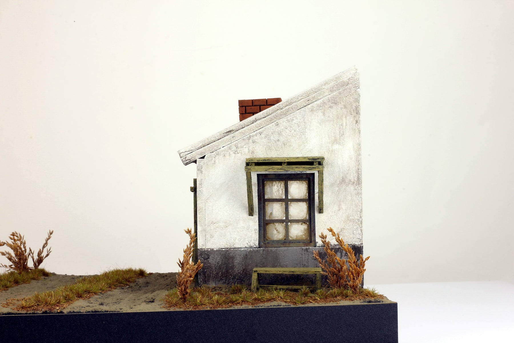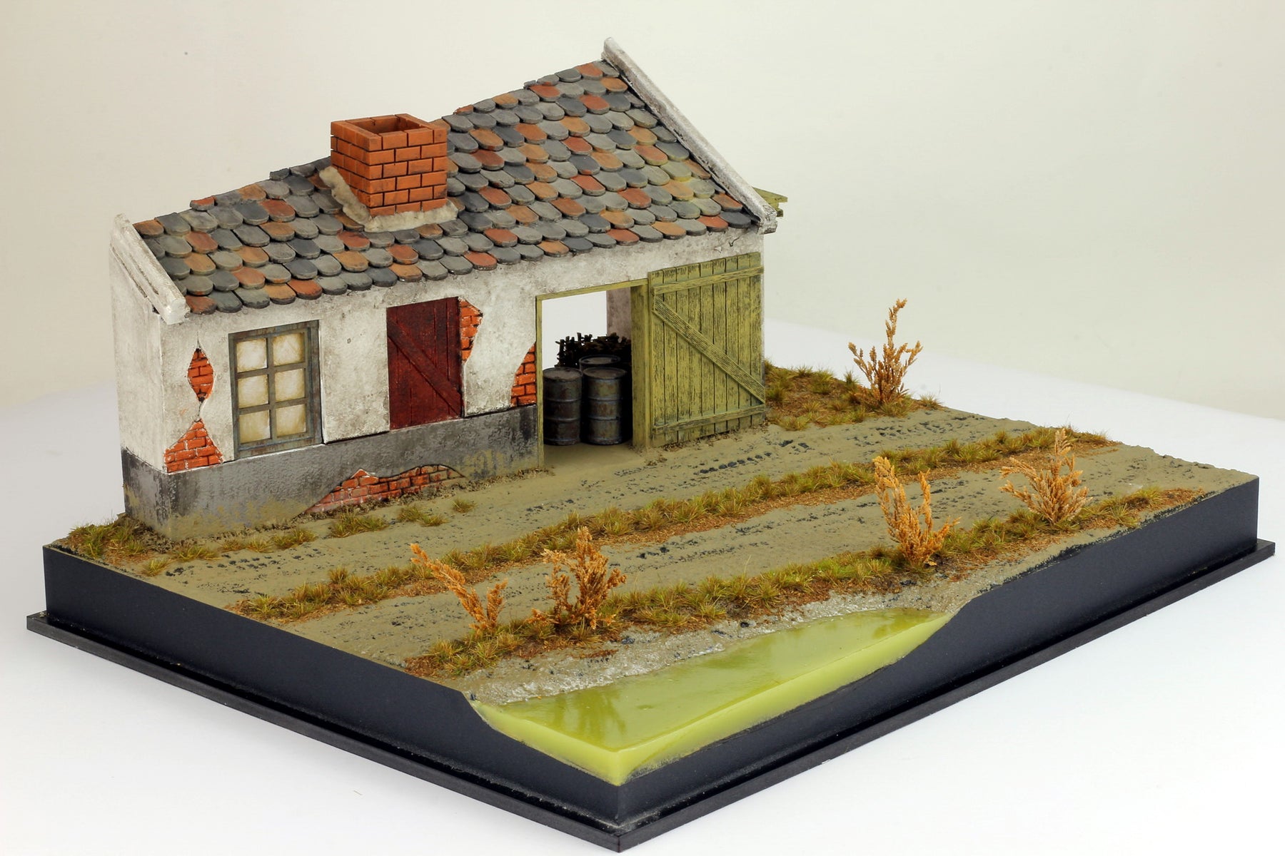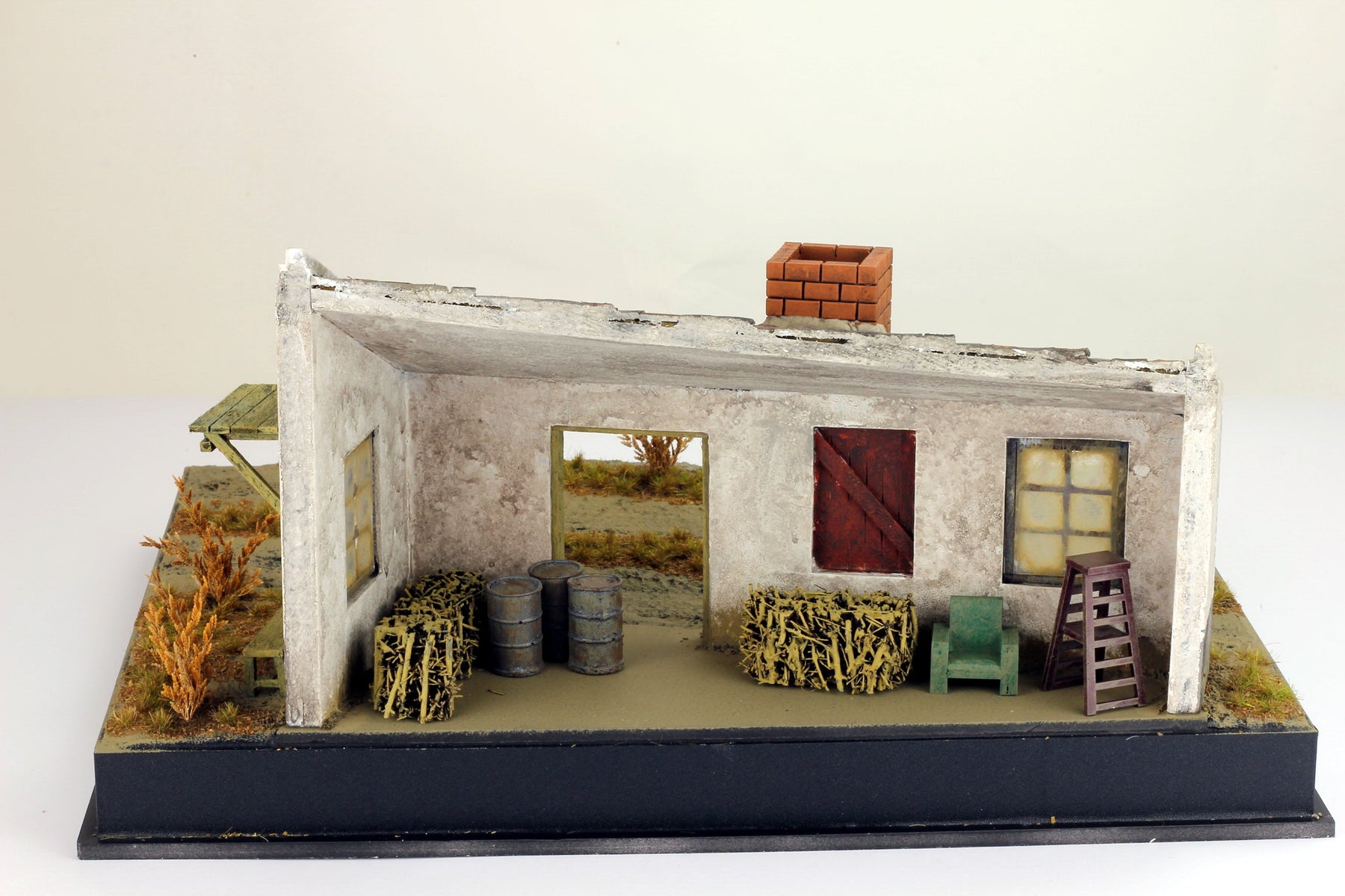 This display base measures approximately 11 inches wide x 13.8 inches long x 7 inches high (28 x 35 x 18 cm) and features a partially ruined structure, textured terrain, a mud path with track impressions, and lifelike foliage. The realistic structure is topped with weathered roof tiles and includes barn doors, barrels, crates, and more—crafted using foamex board, resin parts, and 3D-printed accessories for the ultimate in realism and durability.