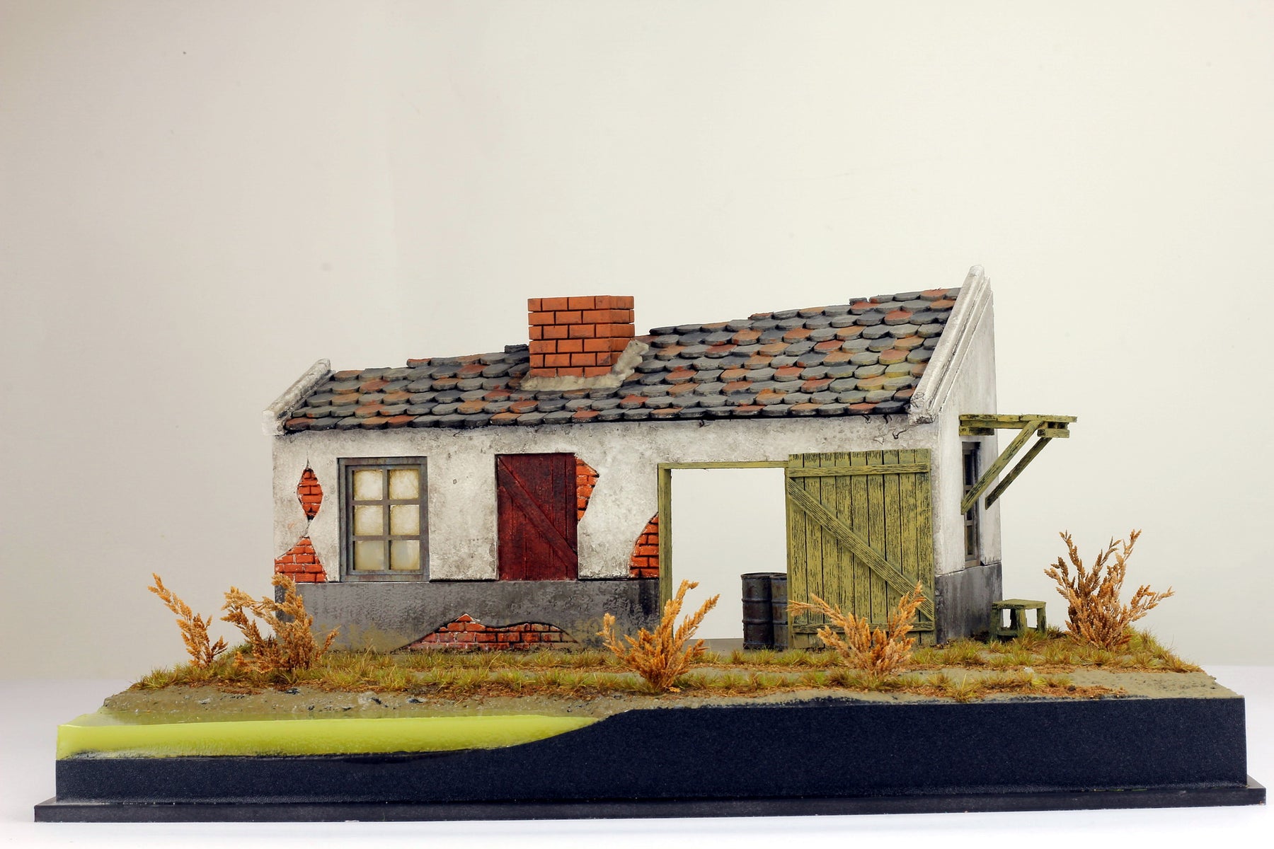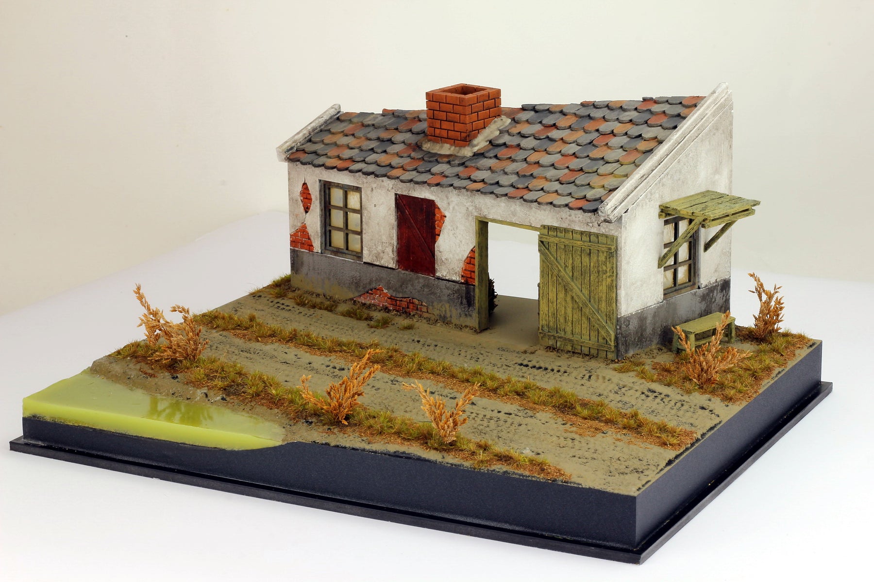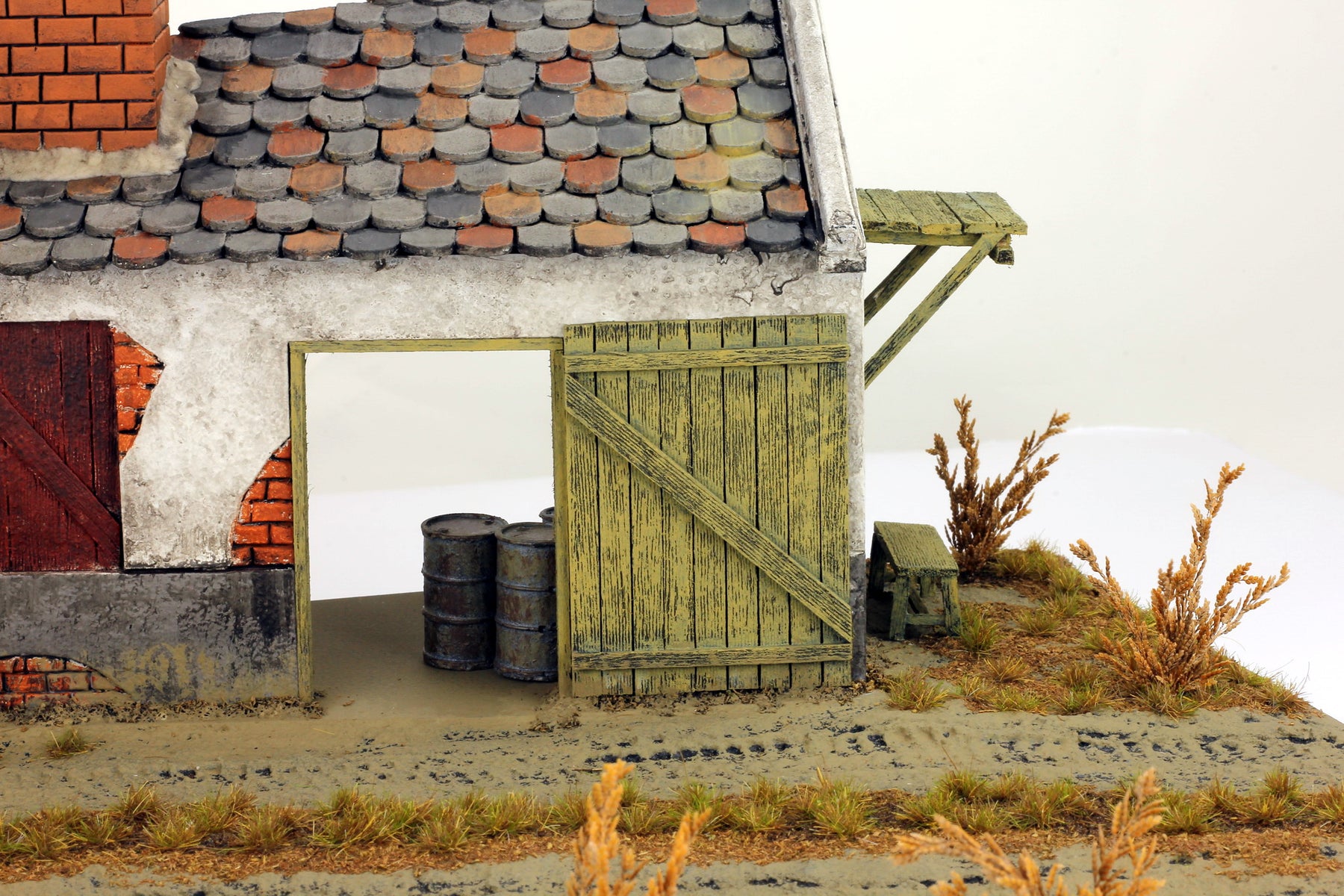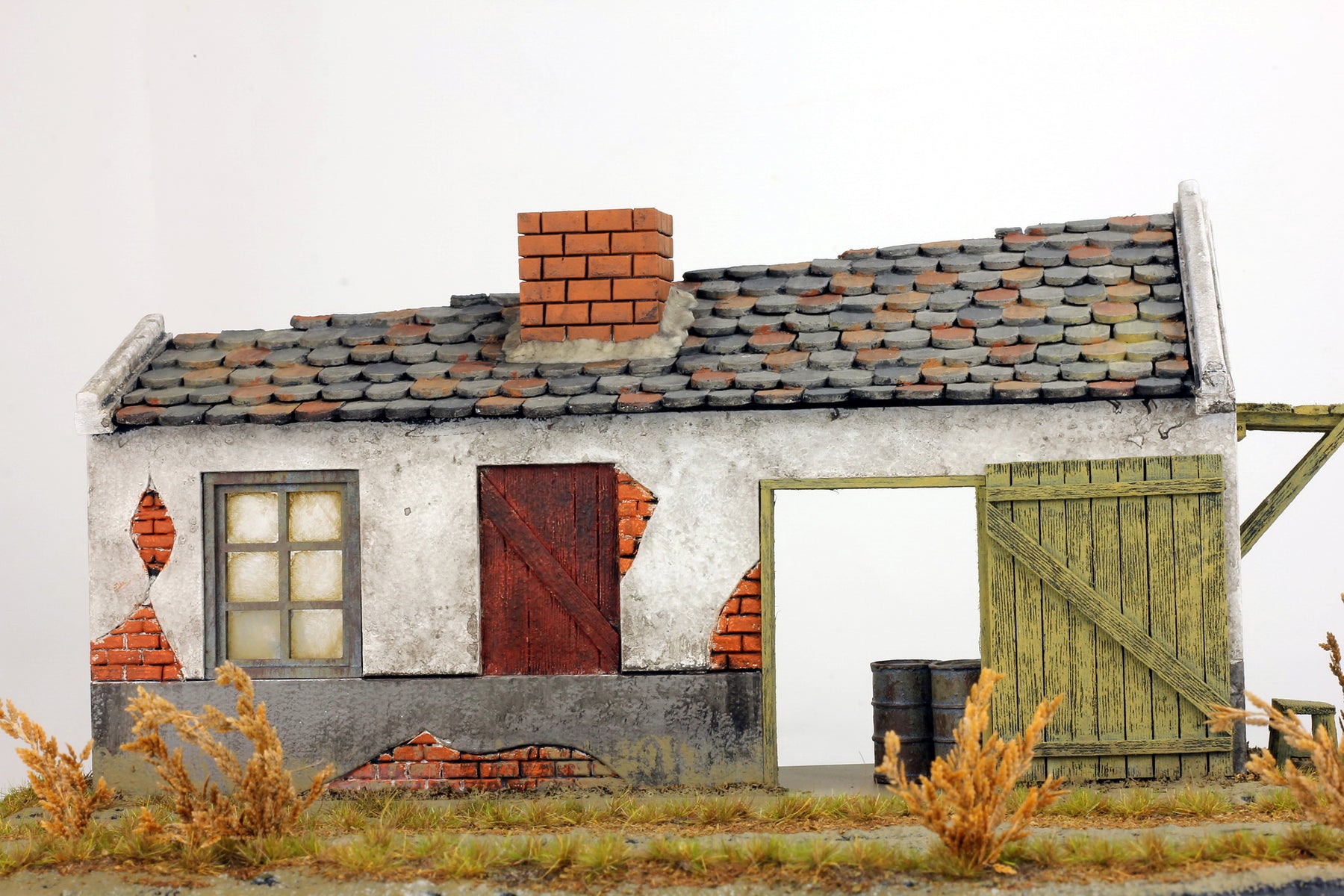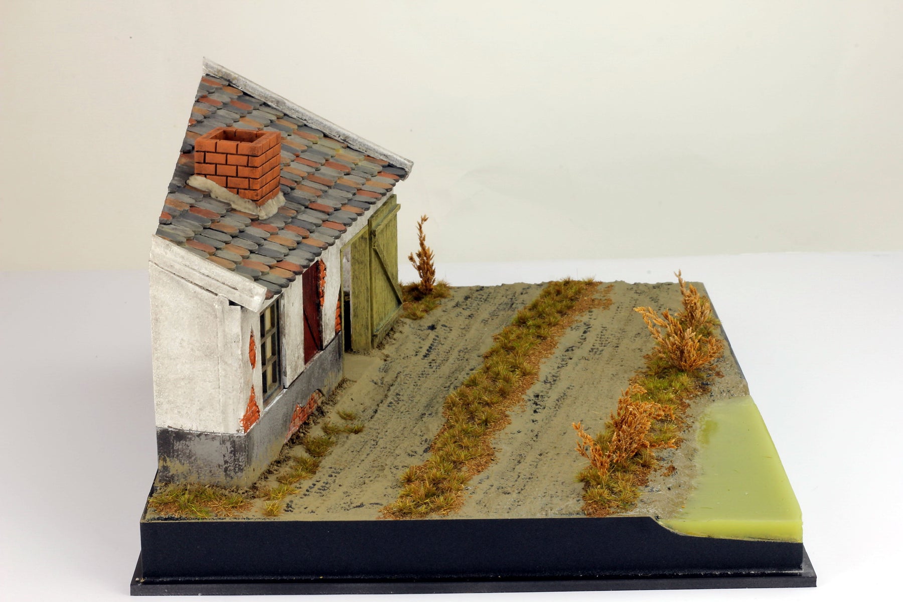 This display base measures approximately 11 inches wide x 13.8 inches long x 7 inches high (28 x 35 x 18 cm) and features a partially ruined structure, textured terrain, a mud path with track impressions, and lifelike foliage. The realistic structure is topped with weathered roof tiles and includes barn doors, barrels, crates, and more—crafted using foamex board, resin parts, and 3D-printed accessories for the ultimate in realism and durability.