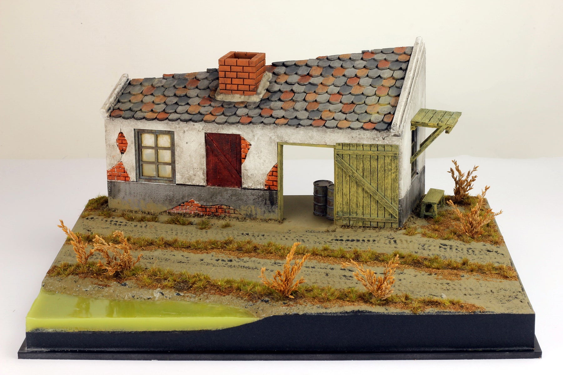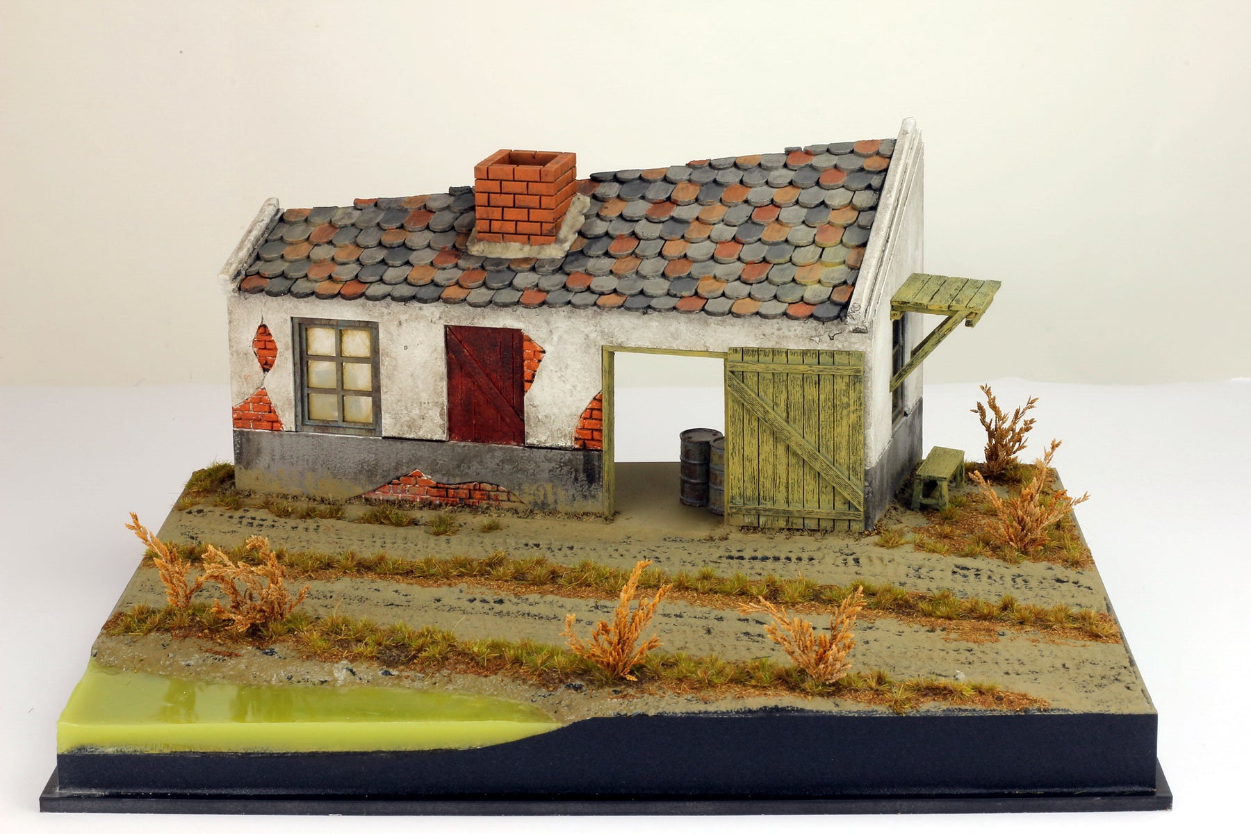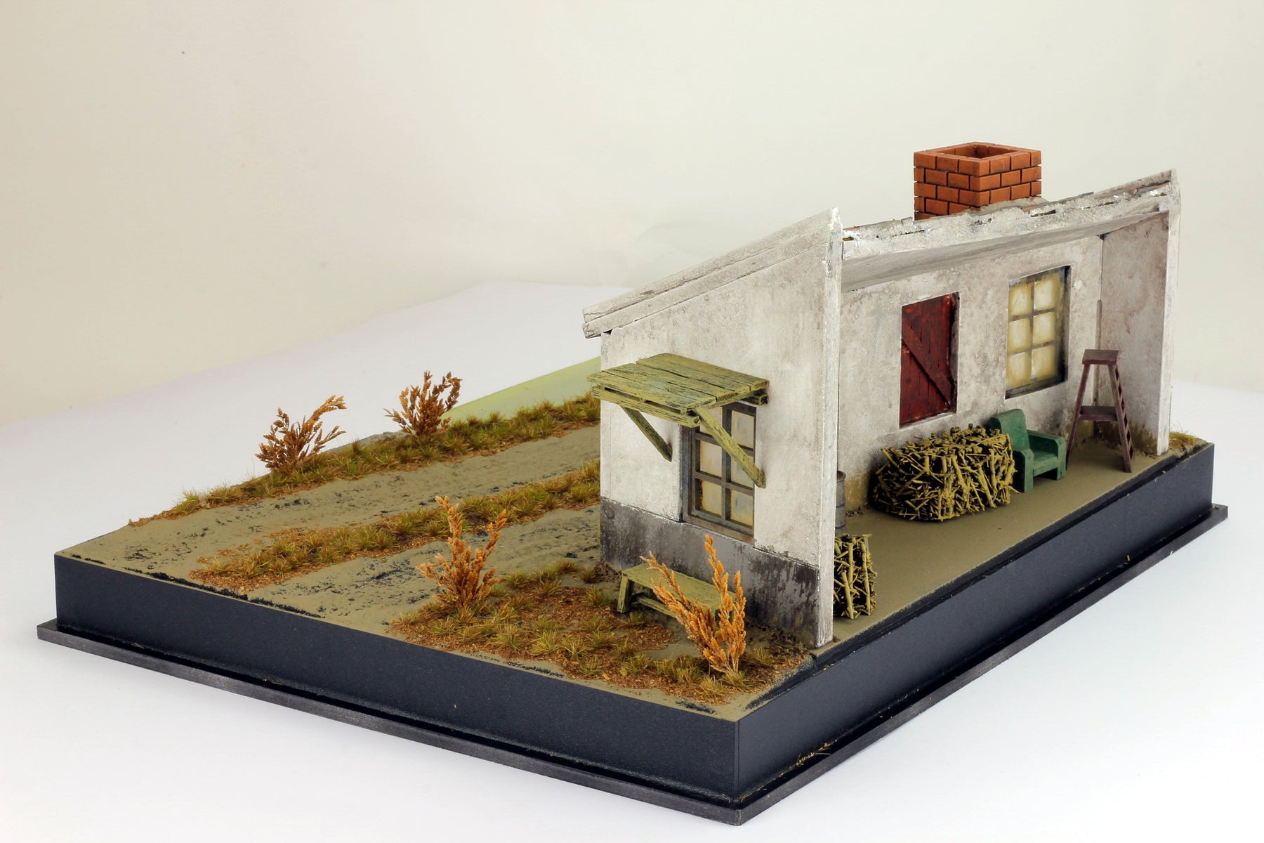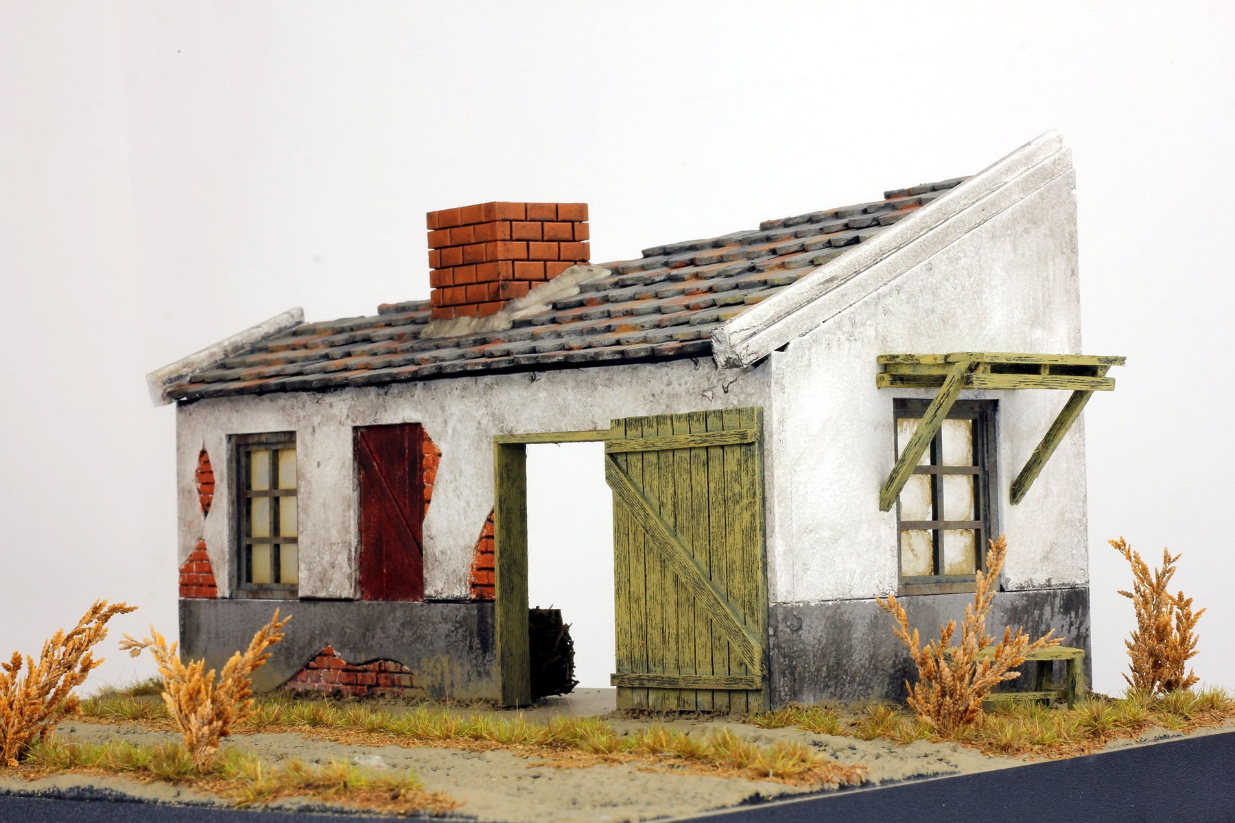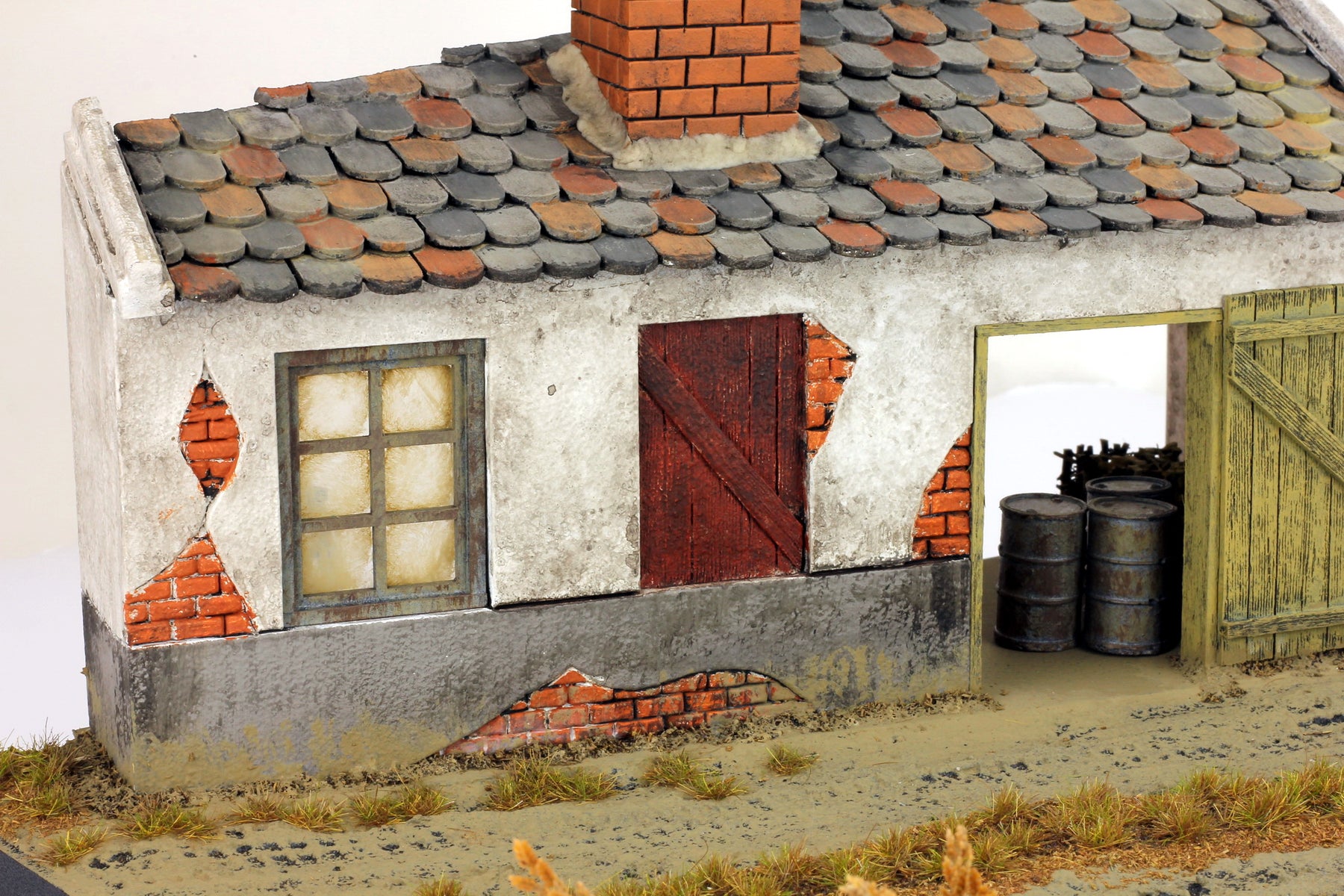 This display base measures approximately 11 inches wide x 13.8 inches long x 7 inches high (28 x 35 x 18 cm) and features a partially ruined structure, textured terrain, a mud path with track impressions, and lifelike foliage. The realistic structure is topped with weathered roof tiles and includes barn doors, barrels, crates, and more—crafted using foamex board, resin parts, and 3D-printed accessories for the ultimate in realism and durability.