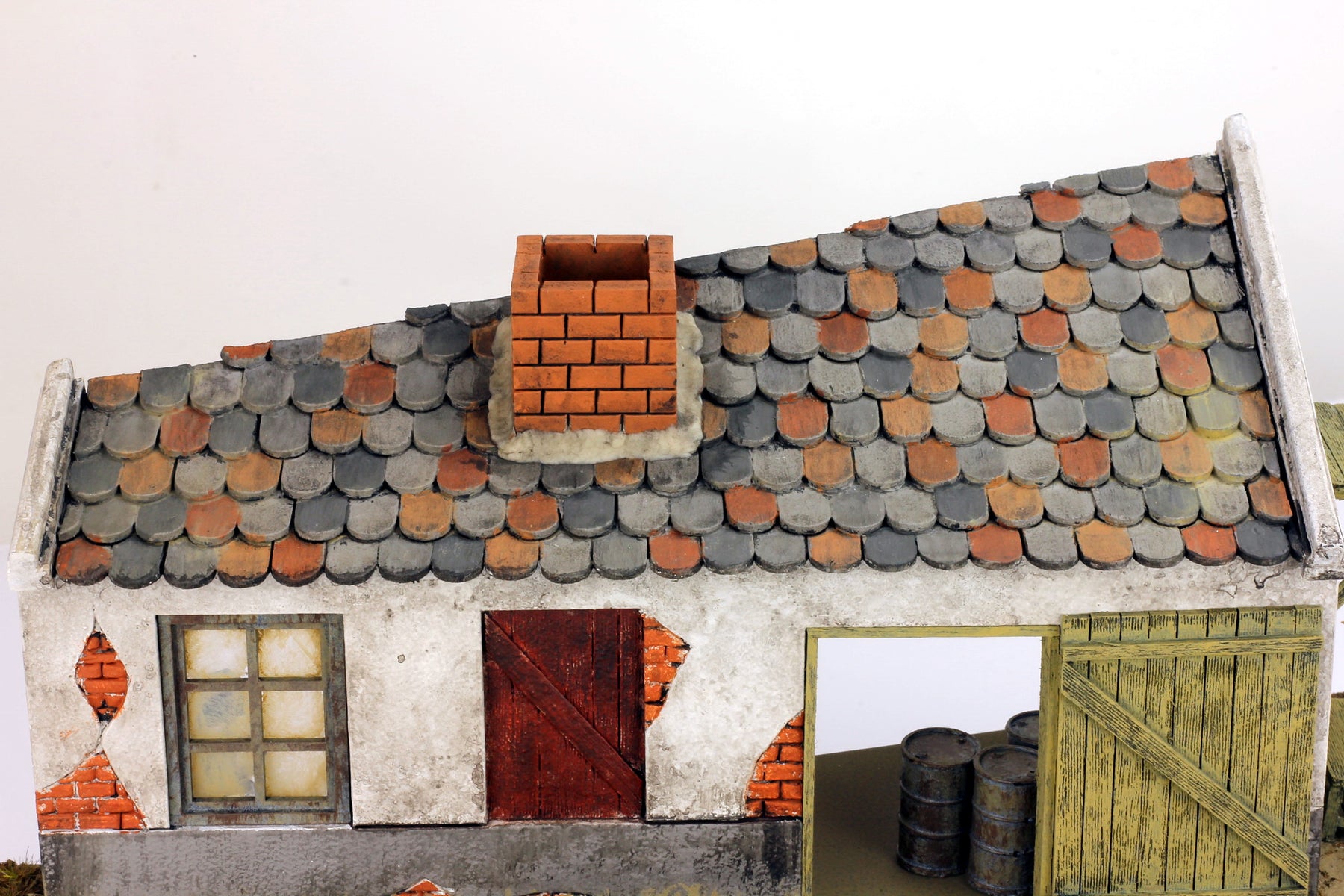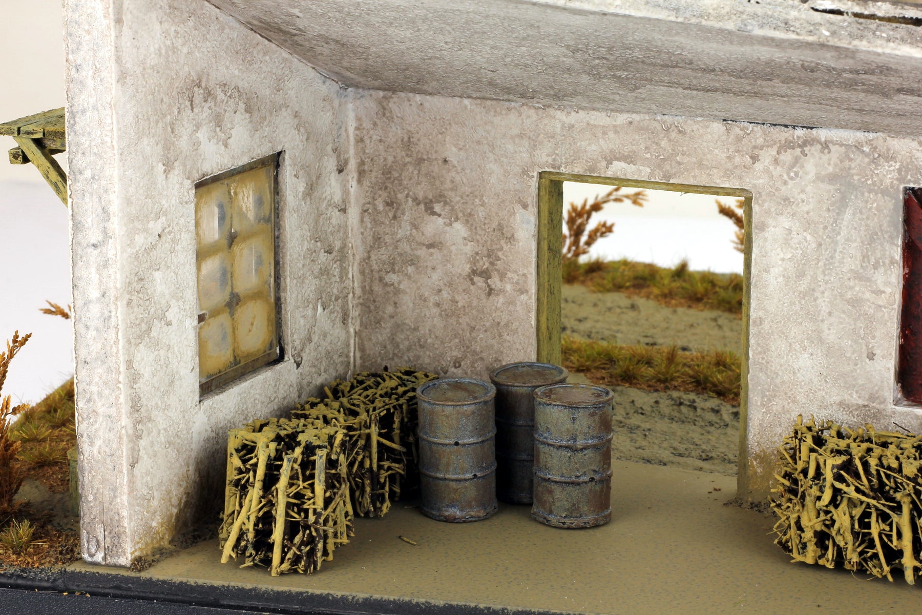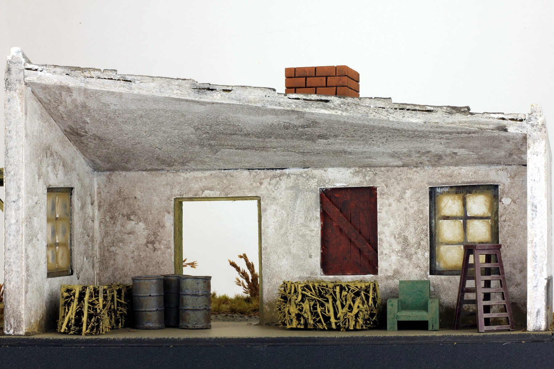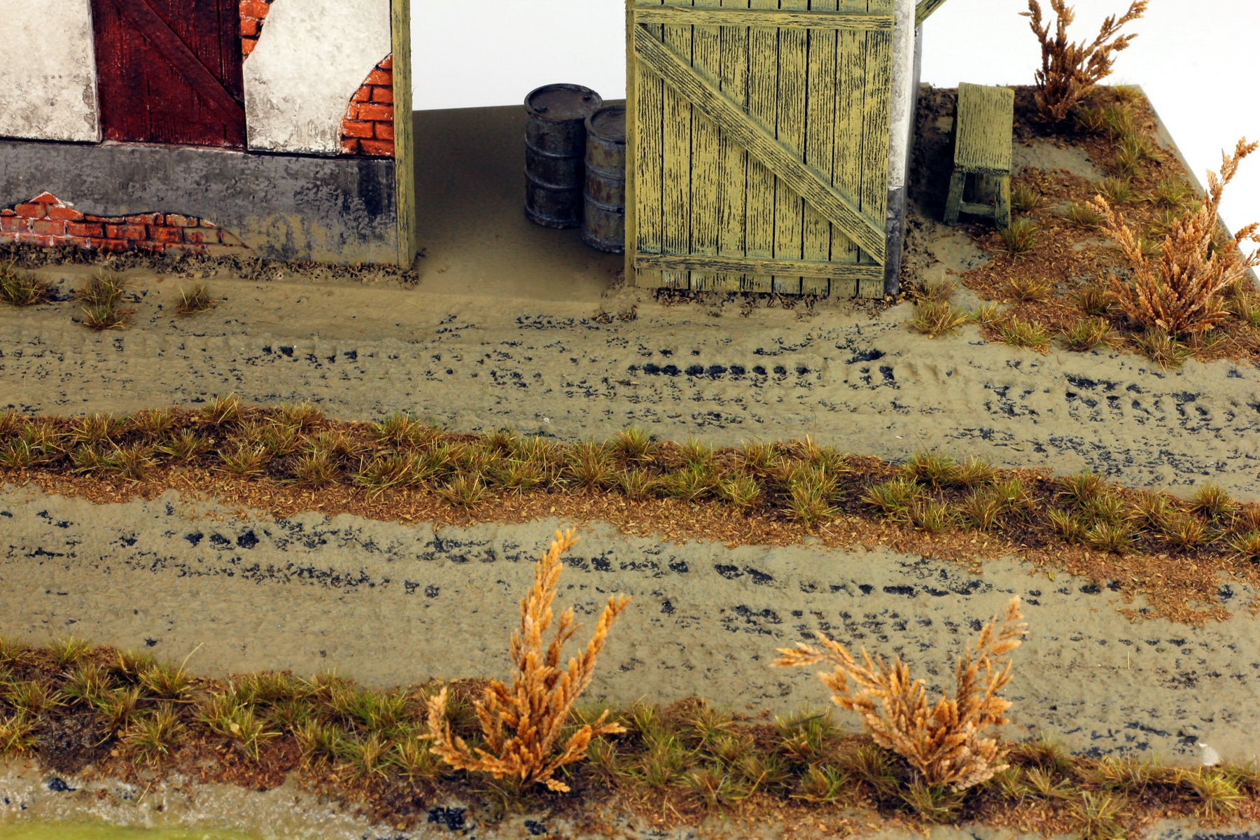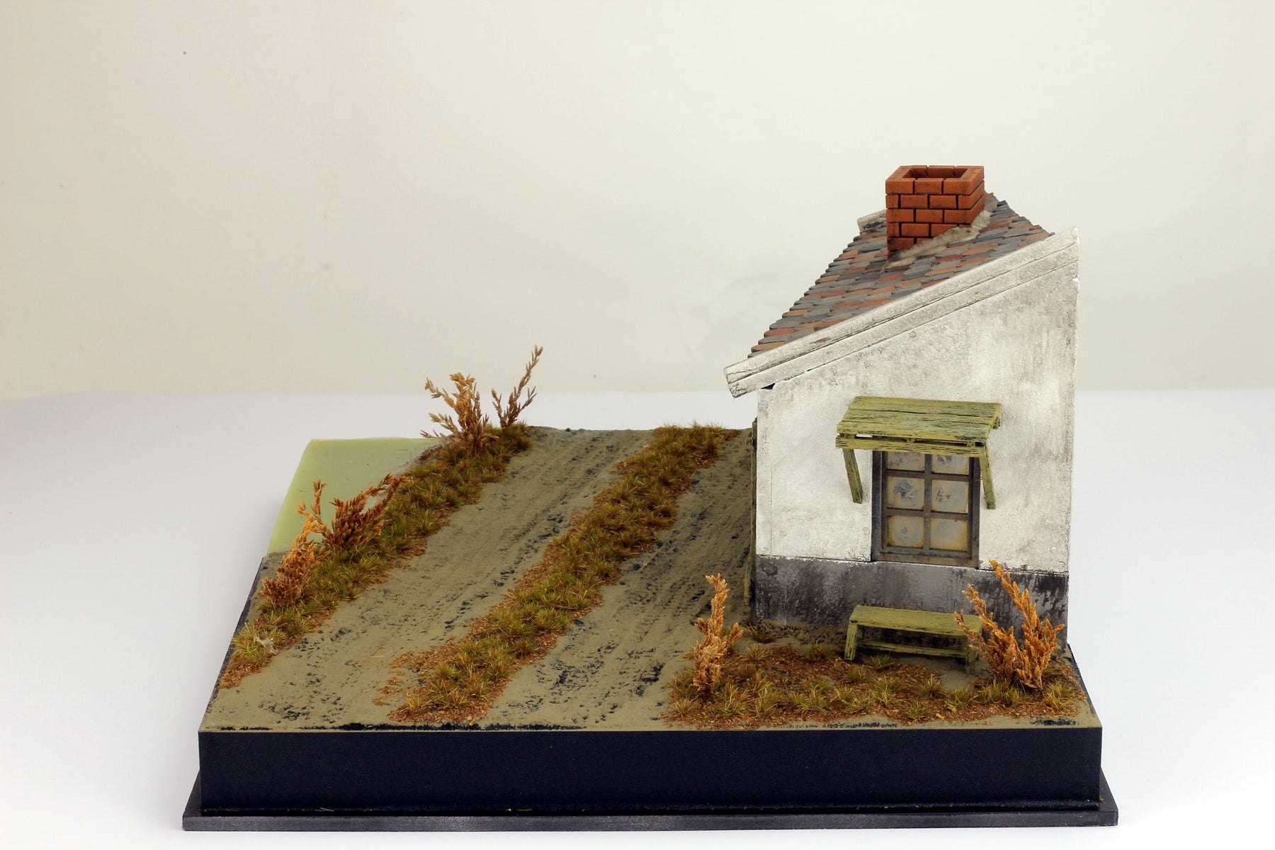 This display base measures approximately 11 inches wide x 13.8 inches long x 7 inches high (28 x 35 x 18 cm) and features a partially ruined structure, textured terrain, a mud path with track impressions, and lifelike foliage. The realistic structure is topped with weathered roof tiles and includes barn doors, barrels, crates, and more—crafted using foamex board, resin parts, and 3D-printed accessories for the ultimate in realism and durability.