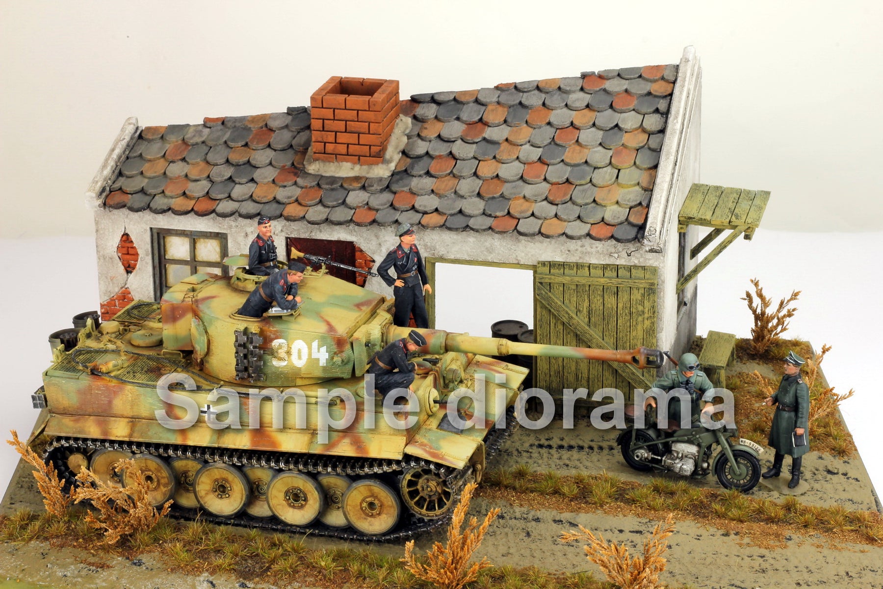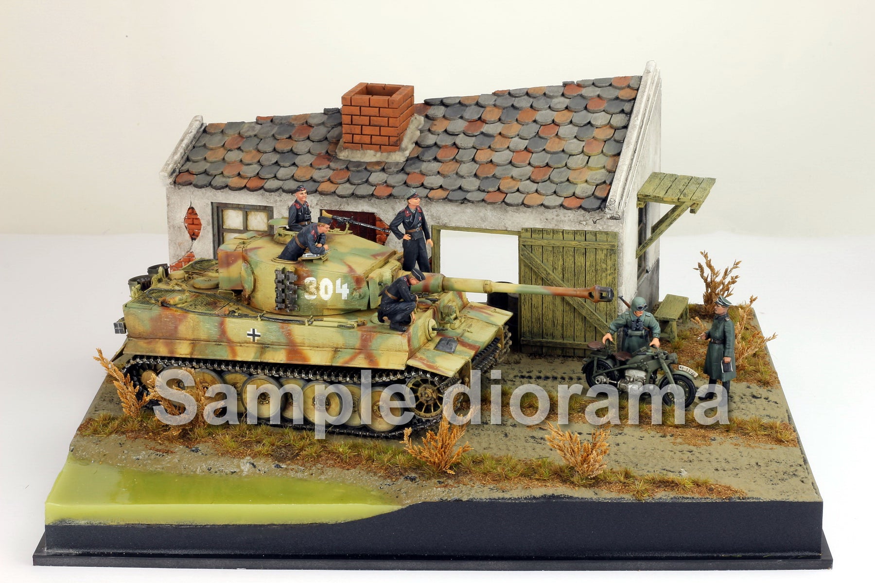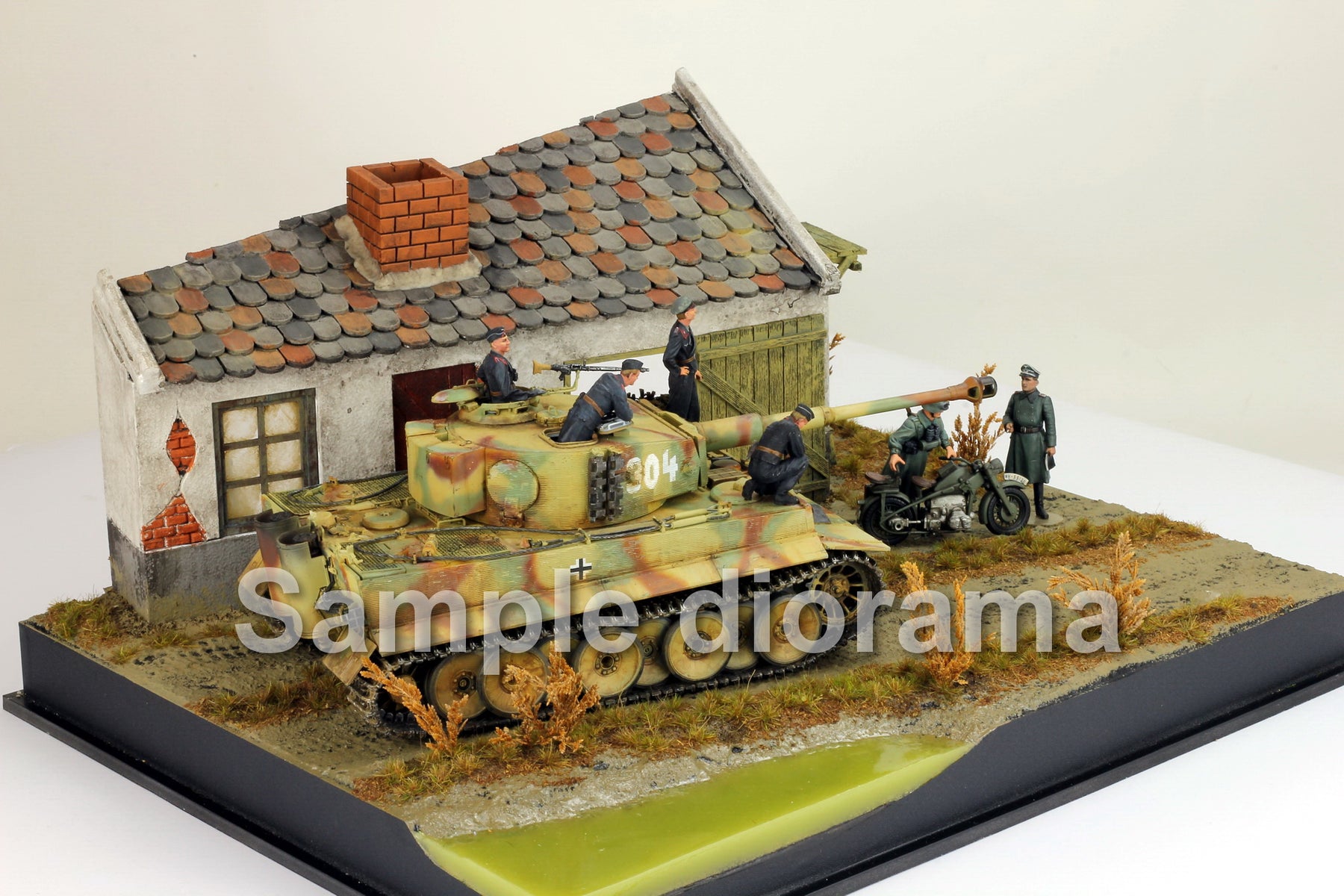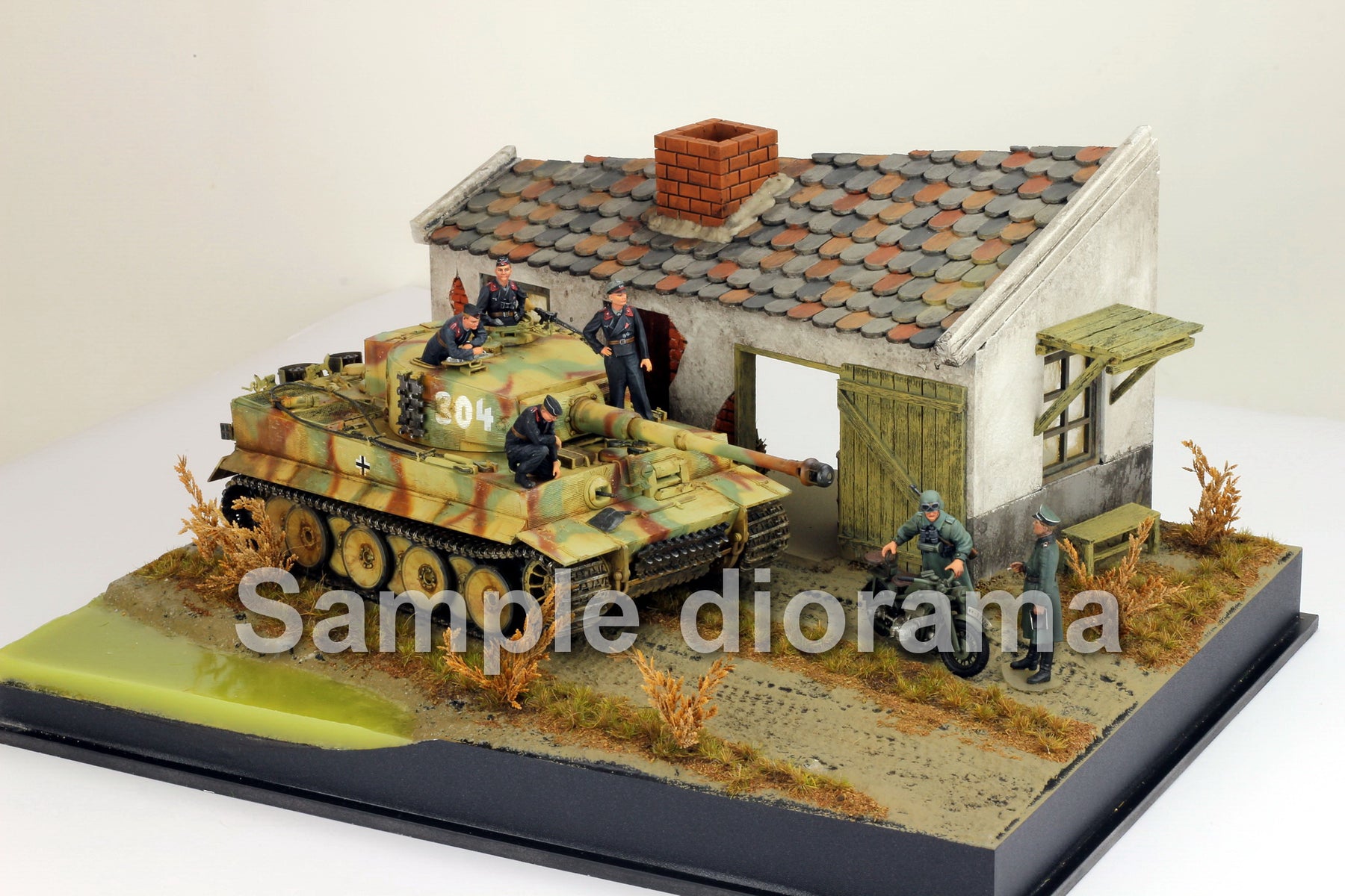 Capture the rustic atmosphere of the European front in WWII with this 1:35 scale ProBuilt Countryside Tank Diorama, meticulously handcrafted to bring your historical displays to life. Designed to depict a weathered rural building along a dirt road, this piece is perfect for staging German armor like the Tiger I tank and infantry units.