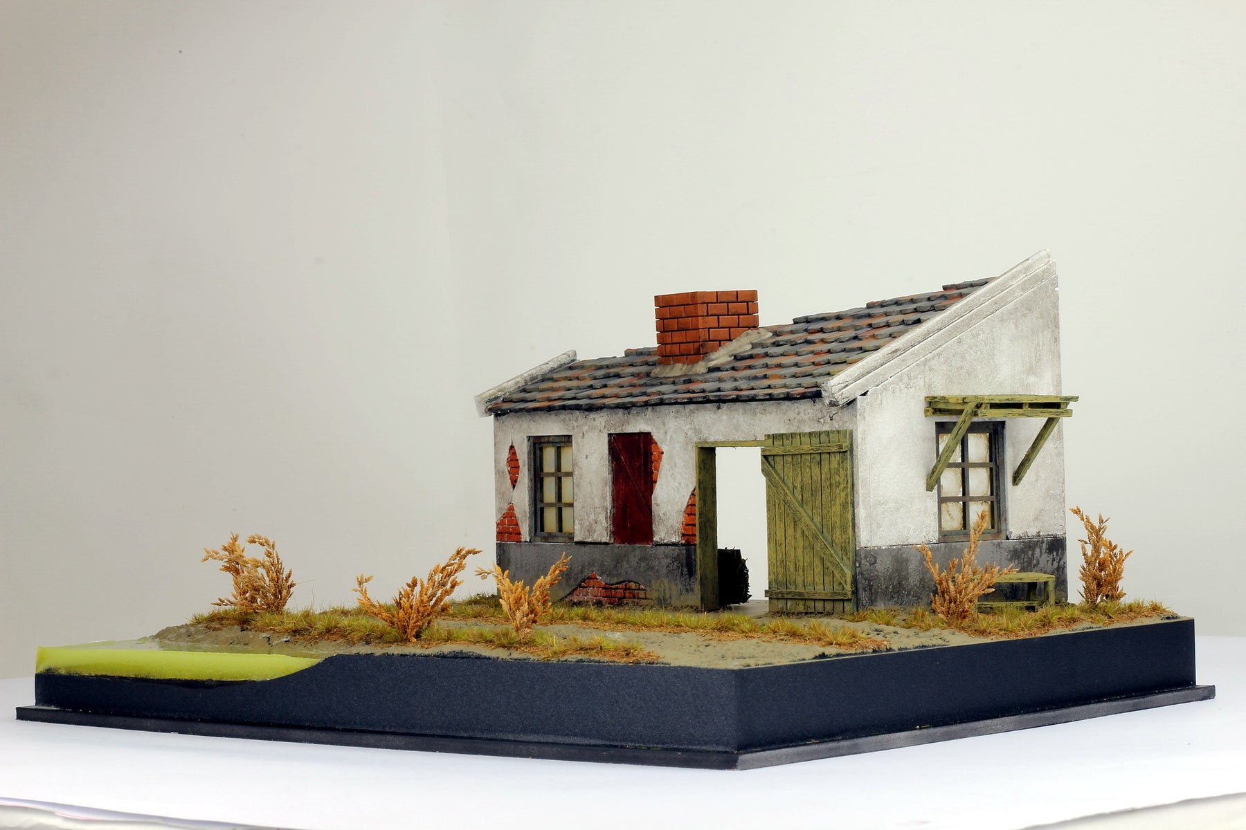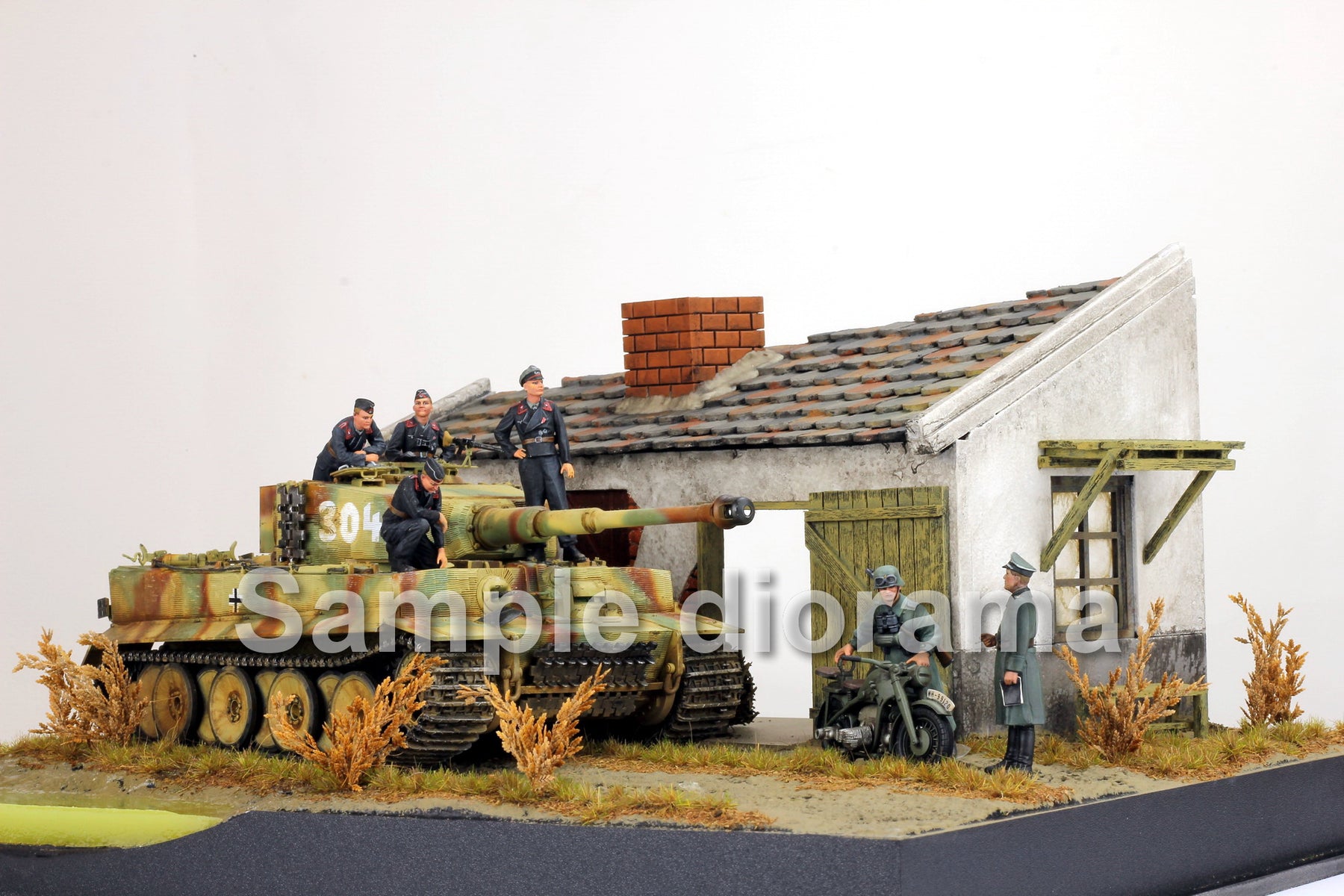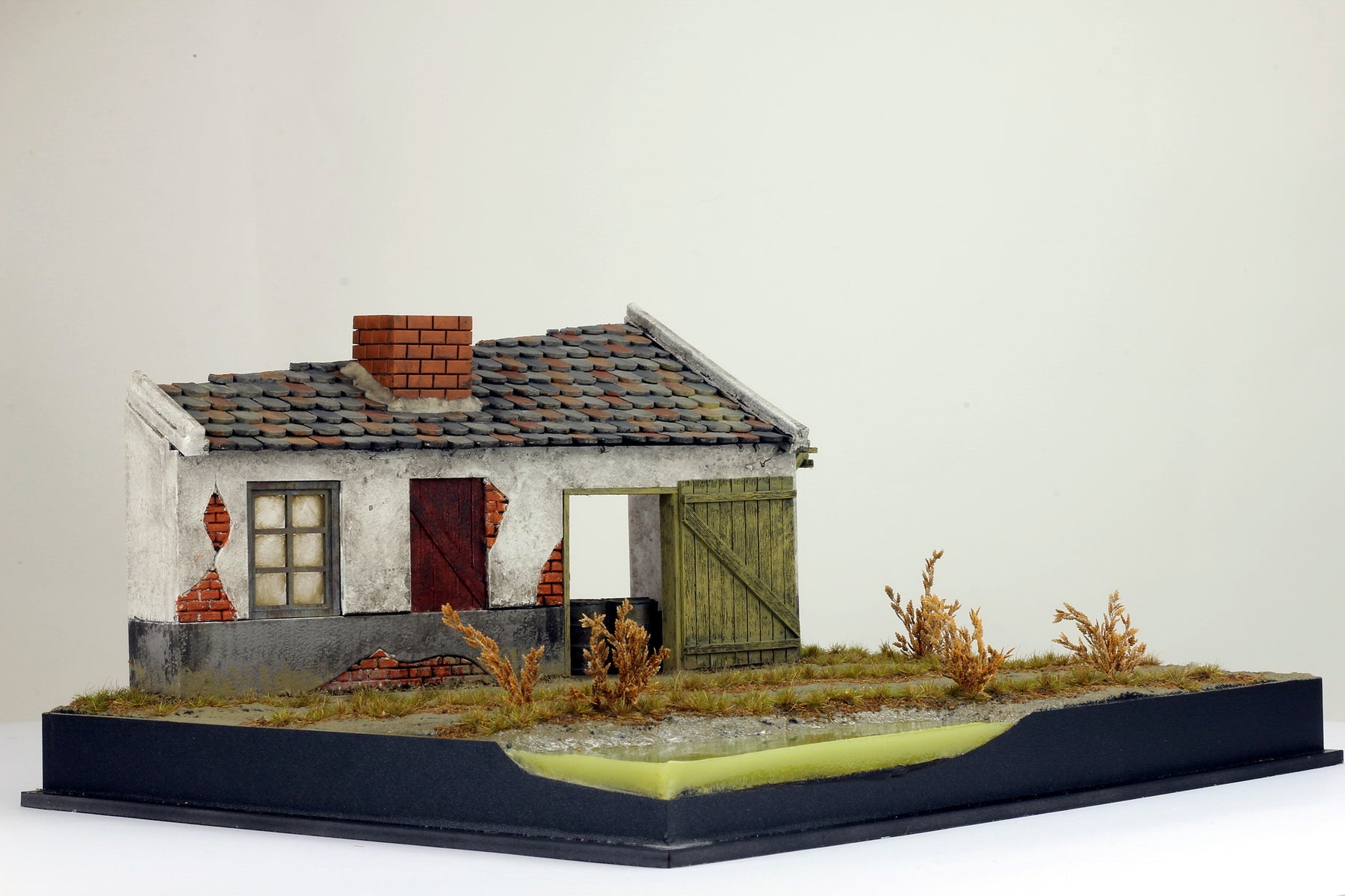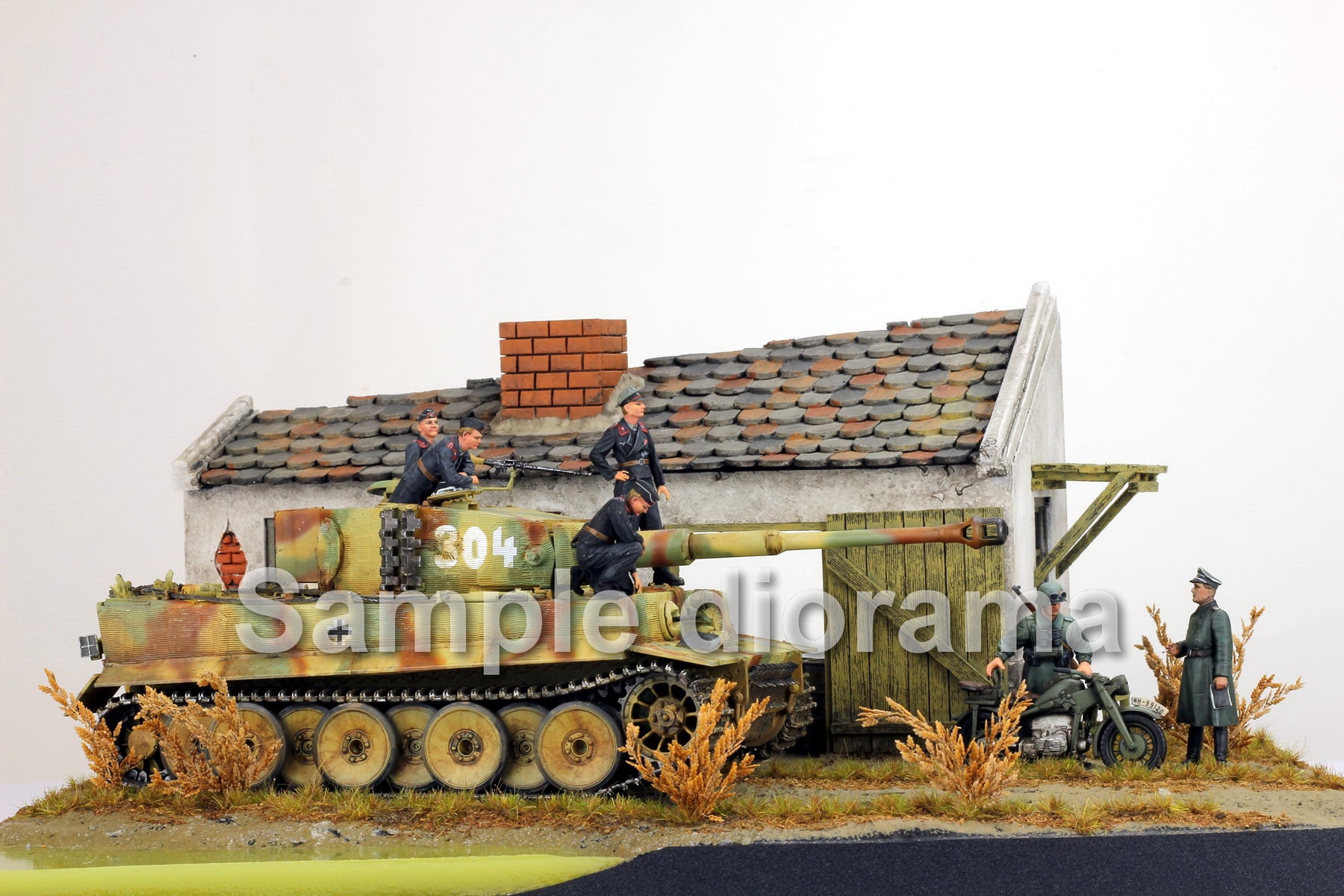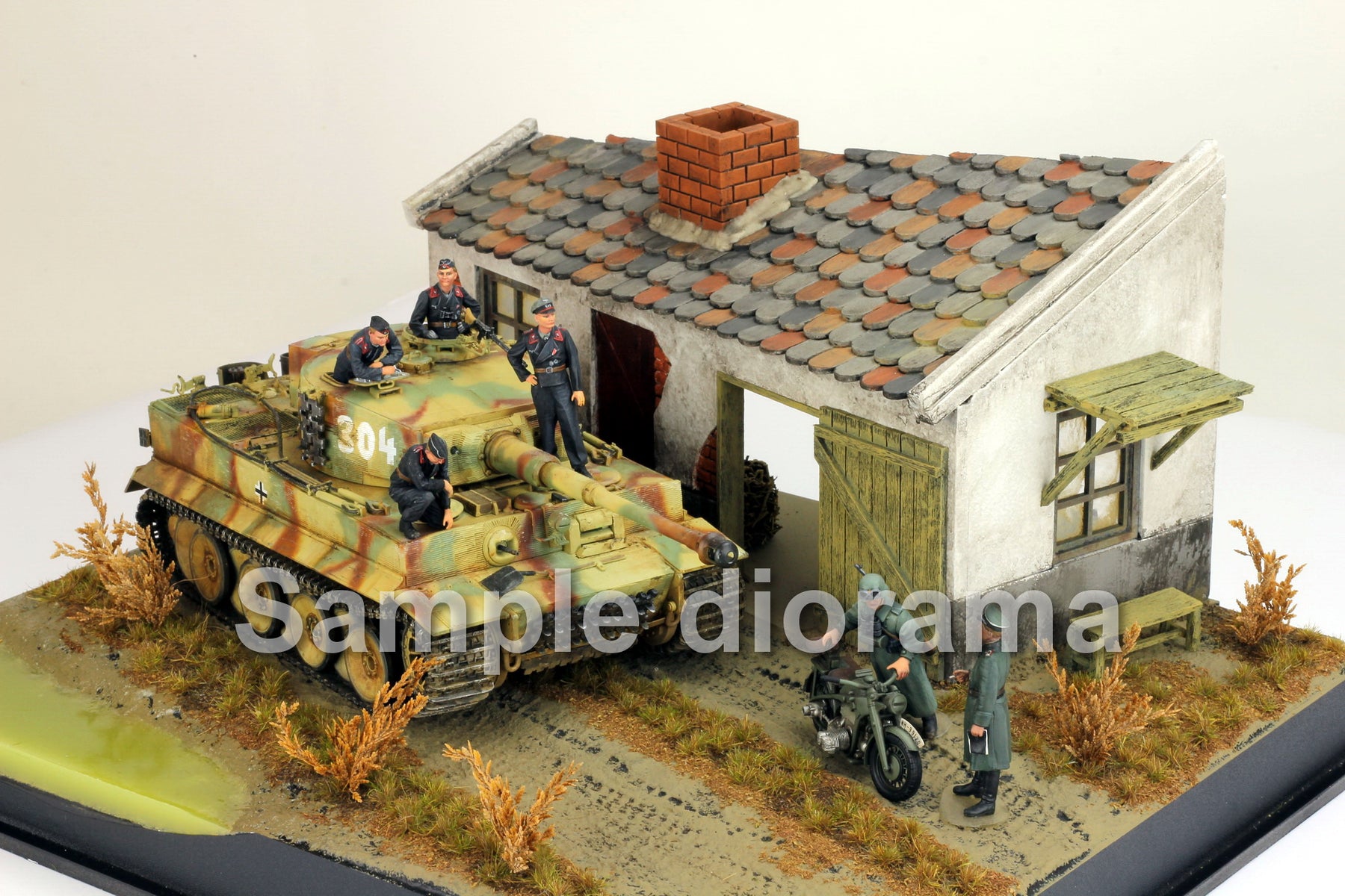 Capture the rustic atmosphere of the European front in WWII with this 1:35 scale ProBuilt Countryside Tank Diorama, meticulously handcrafted to bring your historical displays to life. Designed to depict a weathered rural building along a dirt road, this piece is perfect for staging German armor like the Tiger I tank and infantry units.