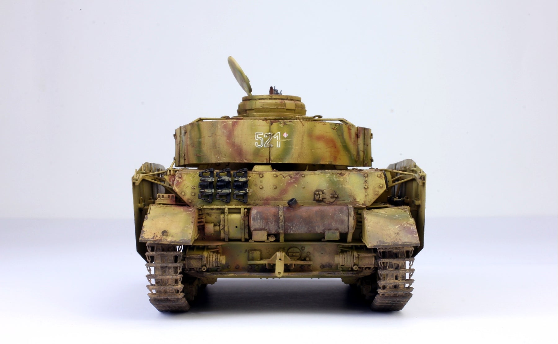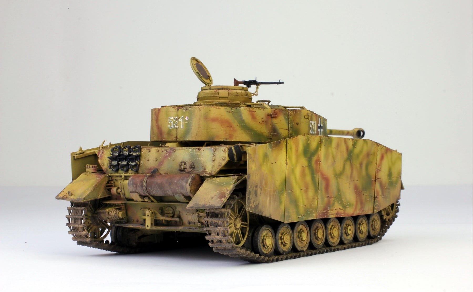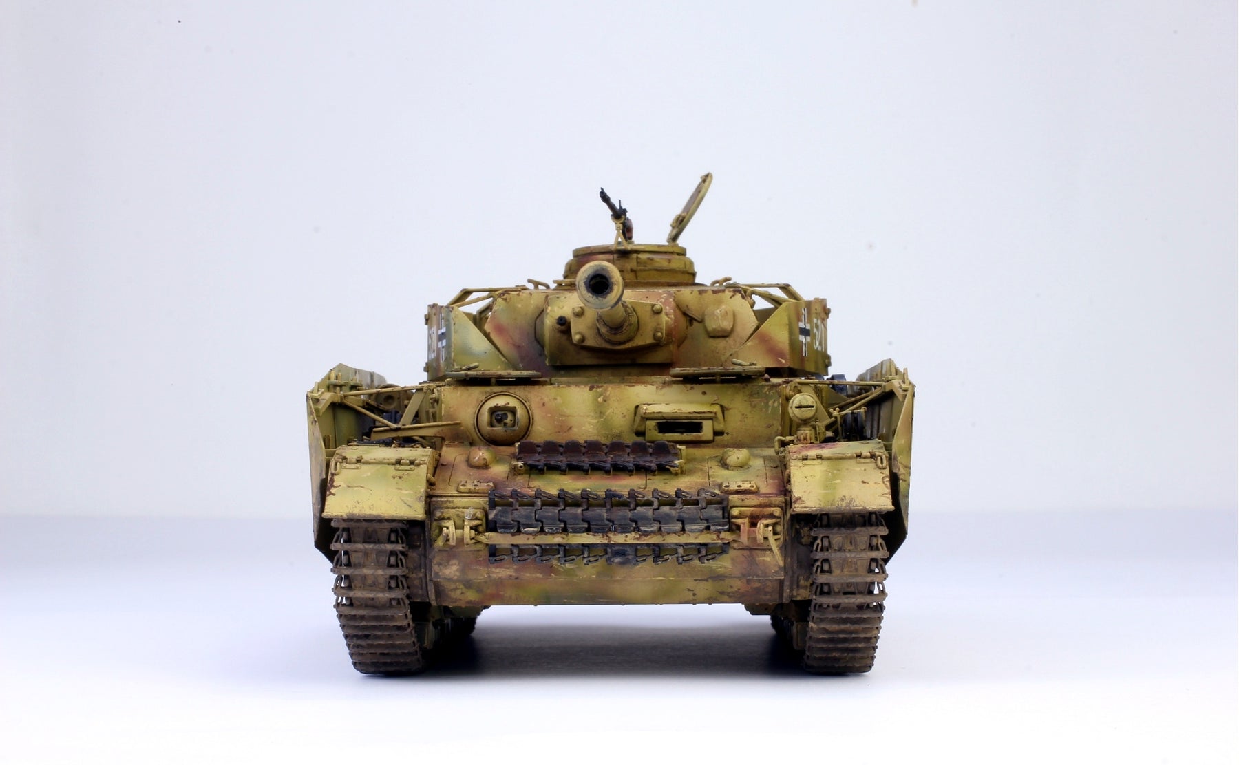 What sets this model apart is the artistry invested in the weathering effects, meticulously applied to mirror the battle-worn appearance of the original Panzer IV as it navigated the tumultuous landscapes of World War II. Each scratch, rust spot, and dust particle has been carefully added to capture the essence of the tank's history and service in the theatre of war.