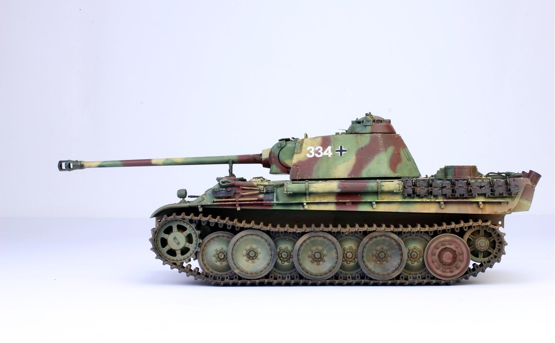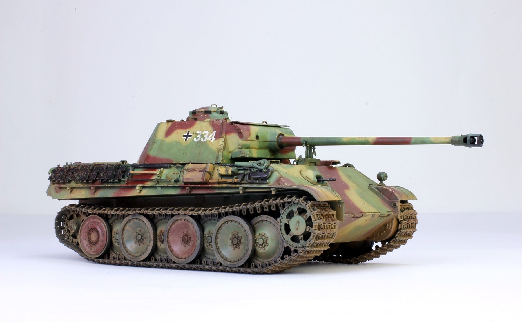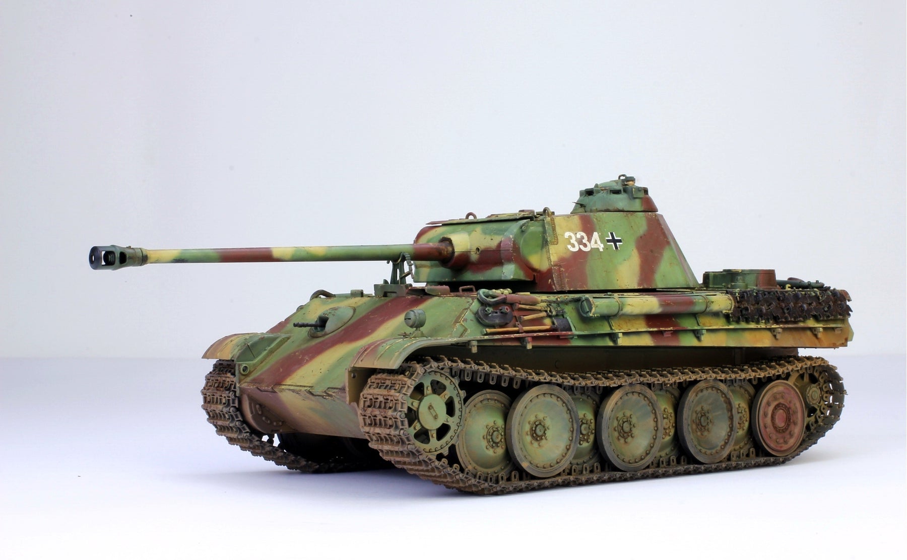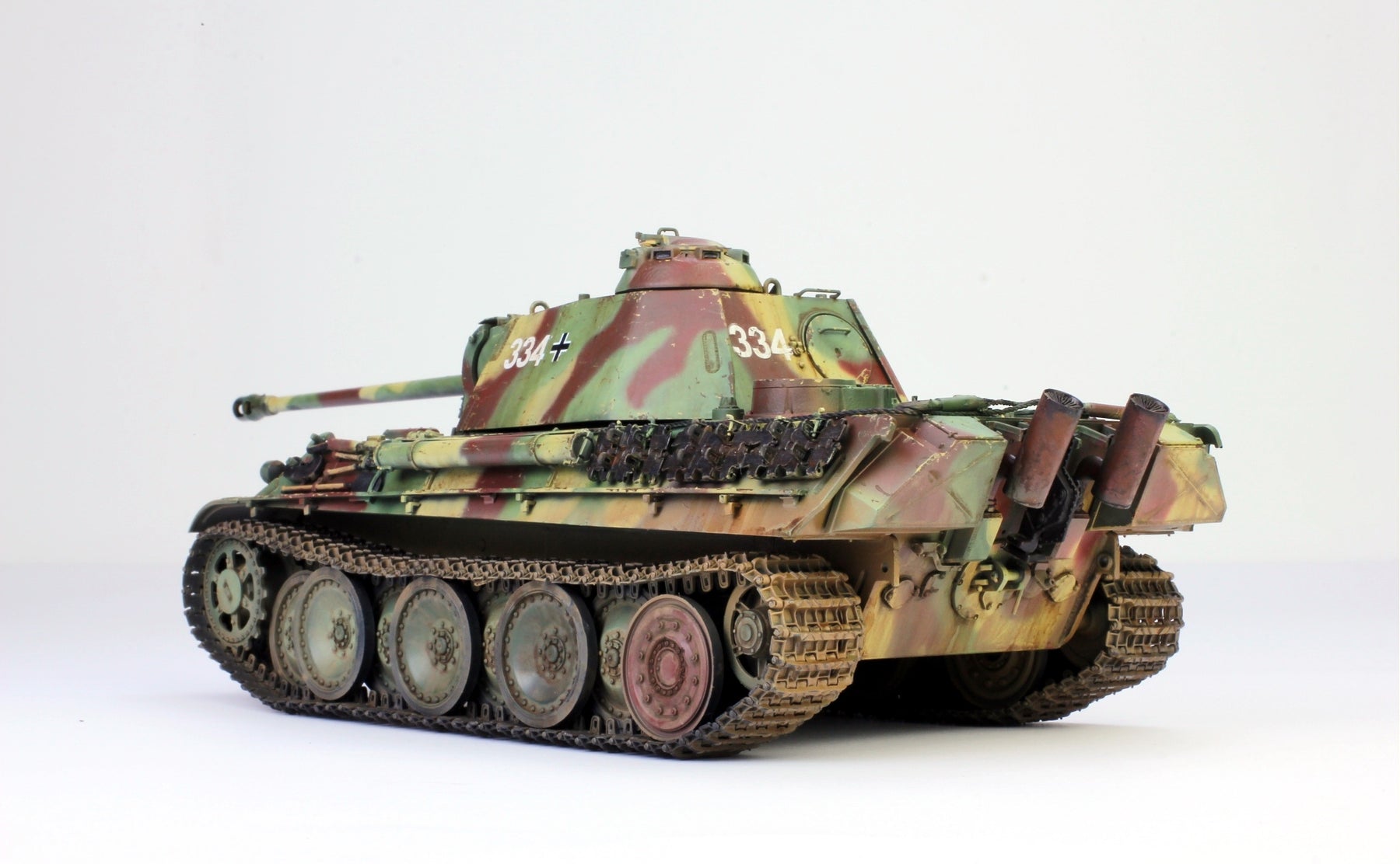 Upon closer inspection, it's evident that no detail has been spared, from the faithful reproduction of its paint scheme to the impeccable weathering effects. These effects authentically capture the wear and tear of the original Panther Ausf. G tanks in combat during WW2.