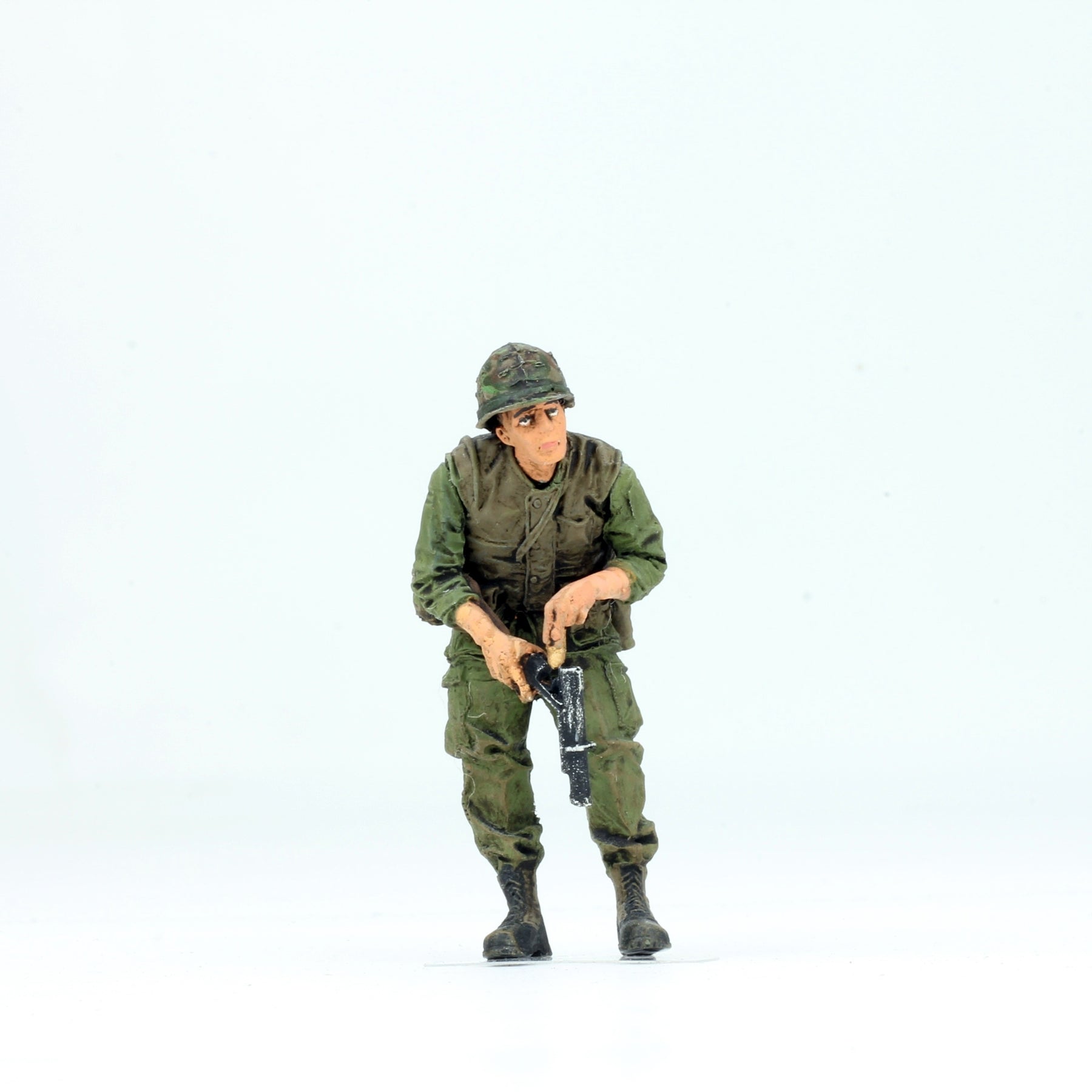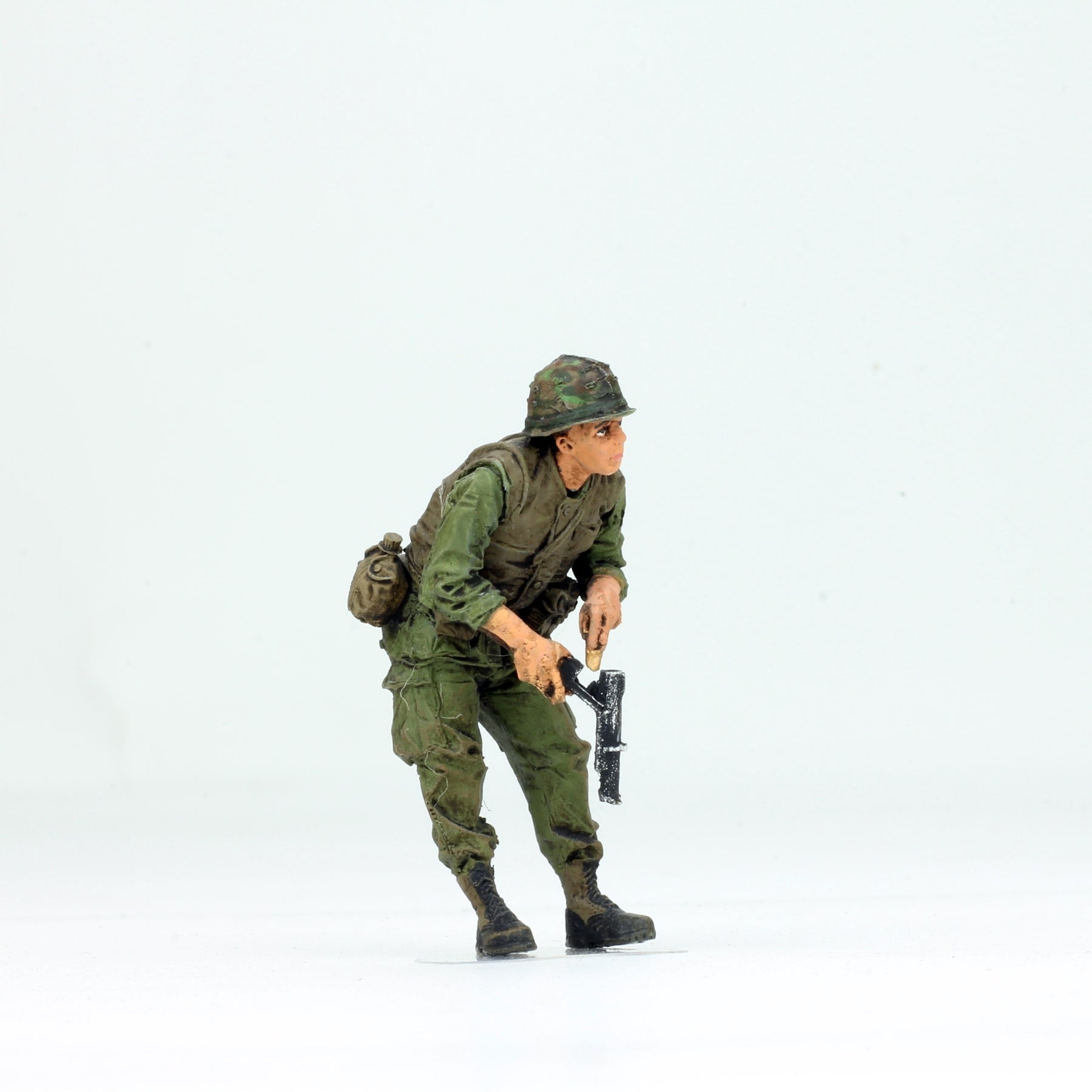 This figure is perfect for collectors and hobbyists alike, offering an excellent addition to your Vietnam War diorama base. The soldier is depicted in a dynamic pose, braced against the recoil of the M79 gun as he fights in the heat of battle. The intricate details of the uniform and equipment, from the helmet and boots to the ammunition belt and gun, have all been carefully crafted and painted to give a truly lifelike appearance.