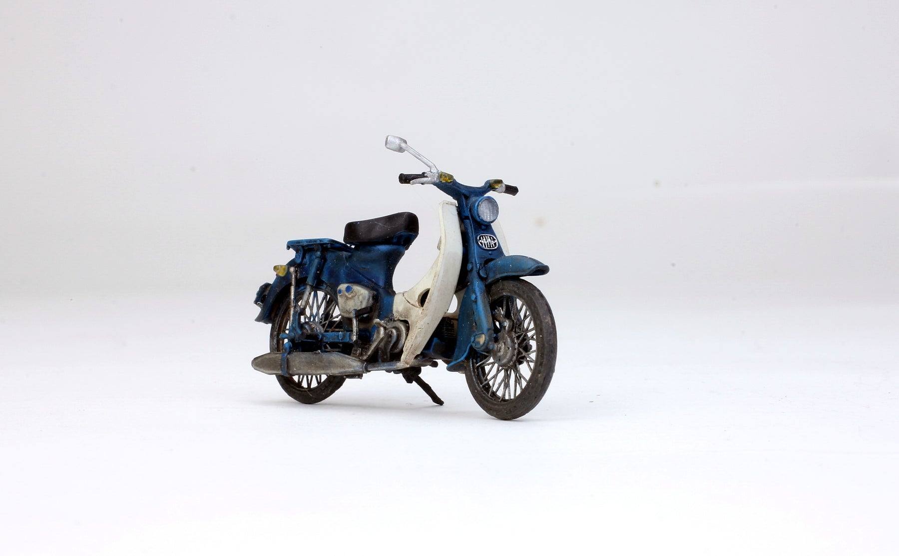 This set includes a beautifully painted Honda Cub Motorcycle C100 and driver figure, handcrafted from the Diopark model kit to match the images in this listing. The motorcycle features intricate details, including realistic tires, a functional kickstand, and a genuine leather seat. The driver figure is also exquisitely painted and features realistic clothing and accessories, giving him a true-to-life appearance.