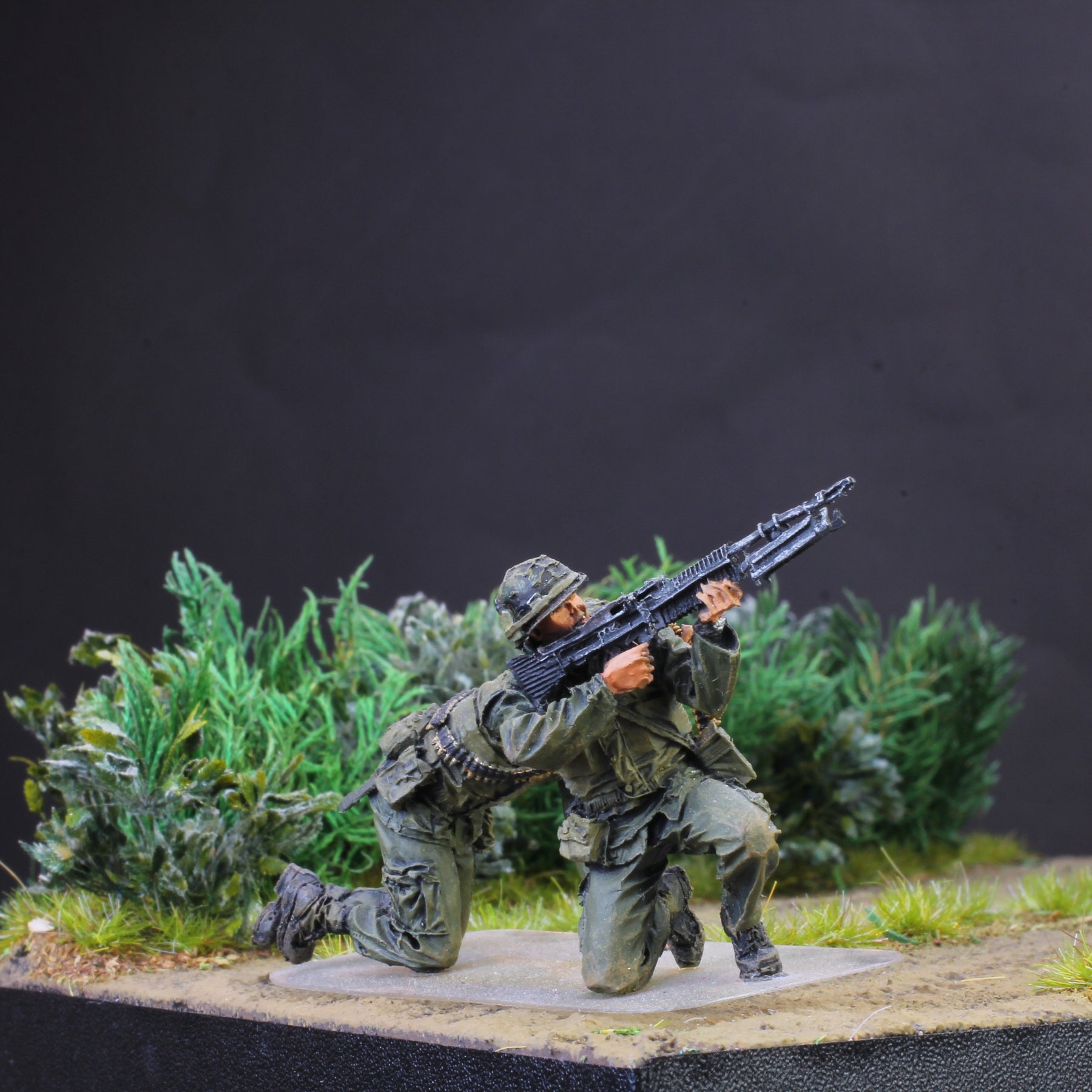 Introducing our highly detailed USMC Machine Gun Team in Vietnam War set, consisting of two exquisitely painted and assembled pro-painted resin figures. Crafted by the skilled artists at Pro Built Models, these figures capture the essence of the brave United States Marine Corps machine gun teams deployed during the Vietnam War.